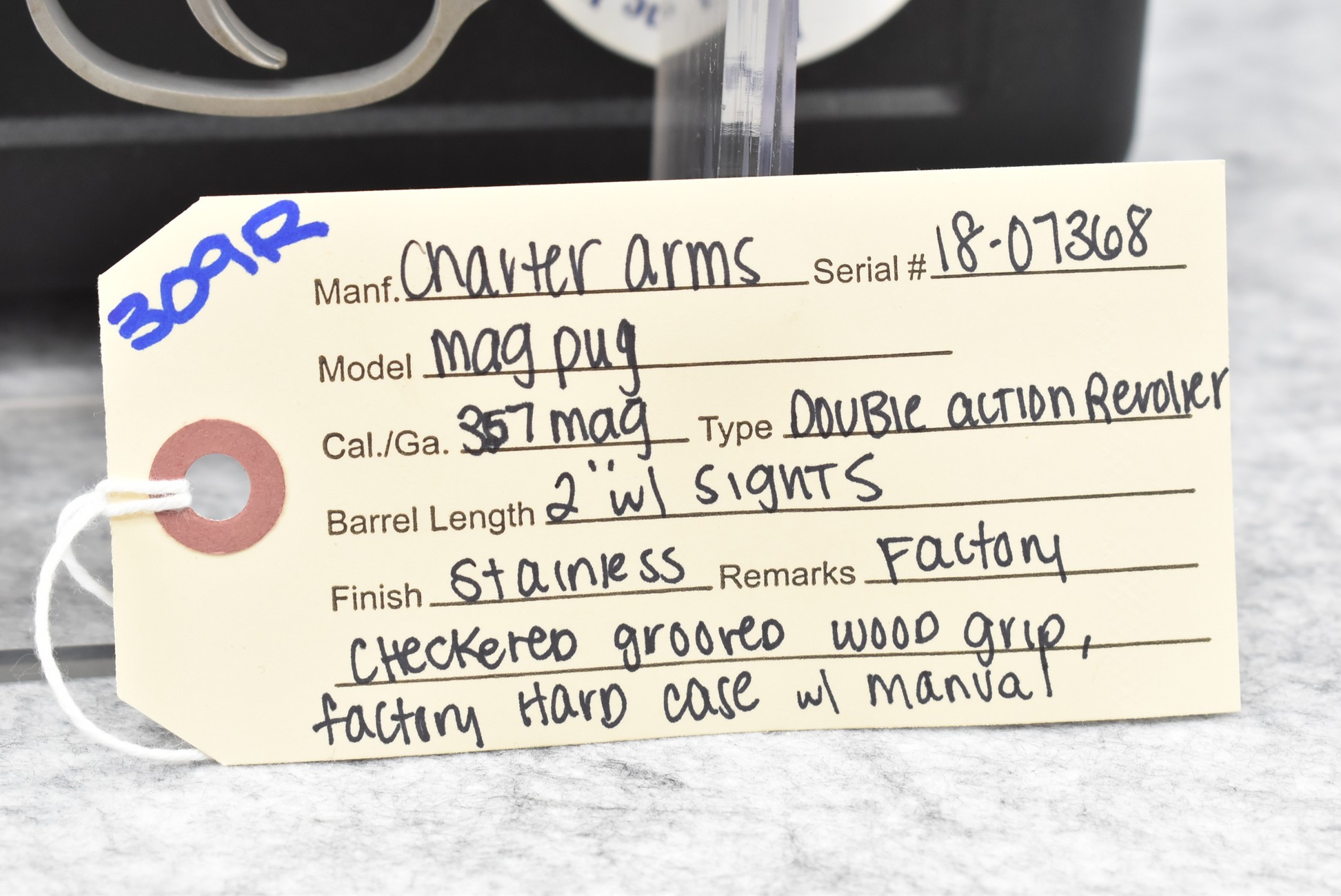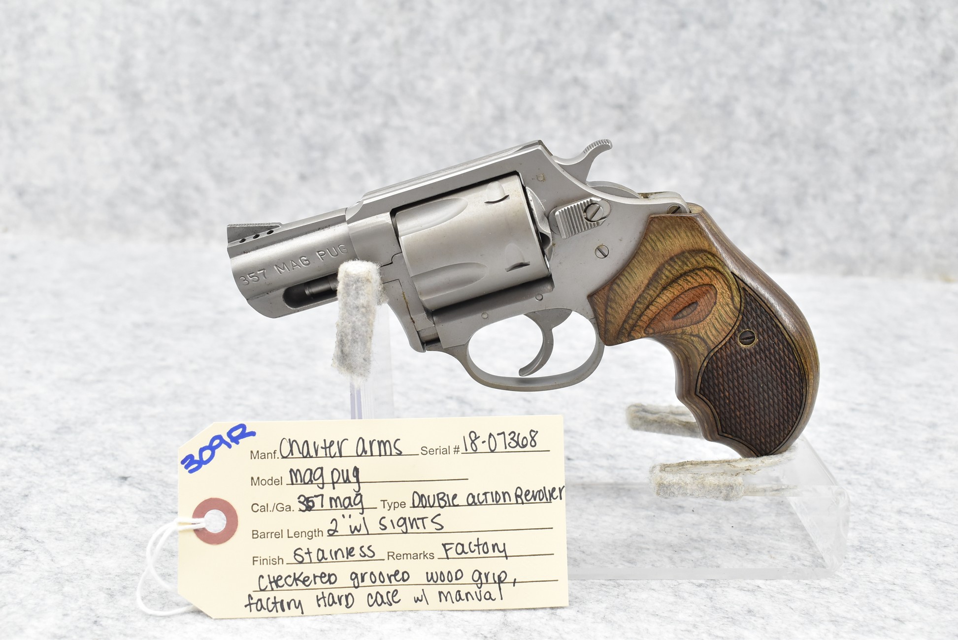 309R. Charter Arms – Mod. Mag Pug – 357 Mag. Cal. Double Action Revolver – w/2” Barrel w/Sights – Stainless Finish – w/Factory Checkered Wood Grip – w/Factory Hard Case & Manual