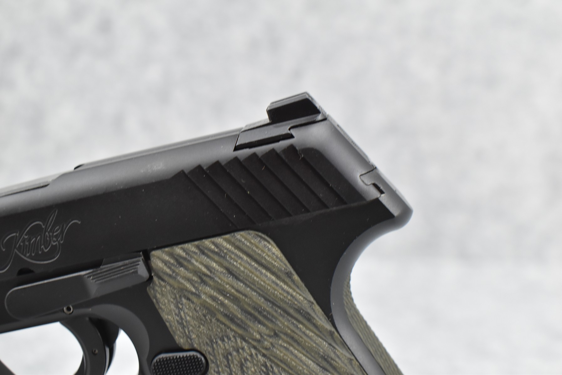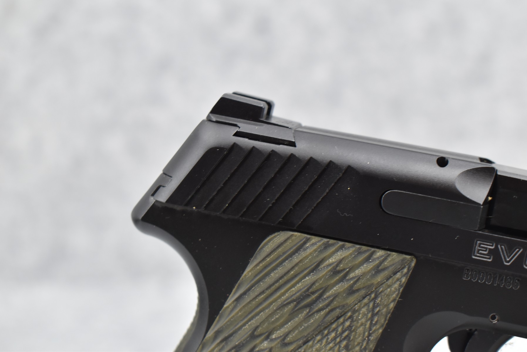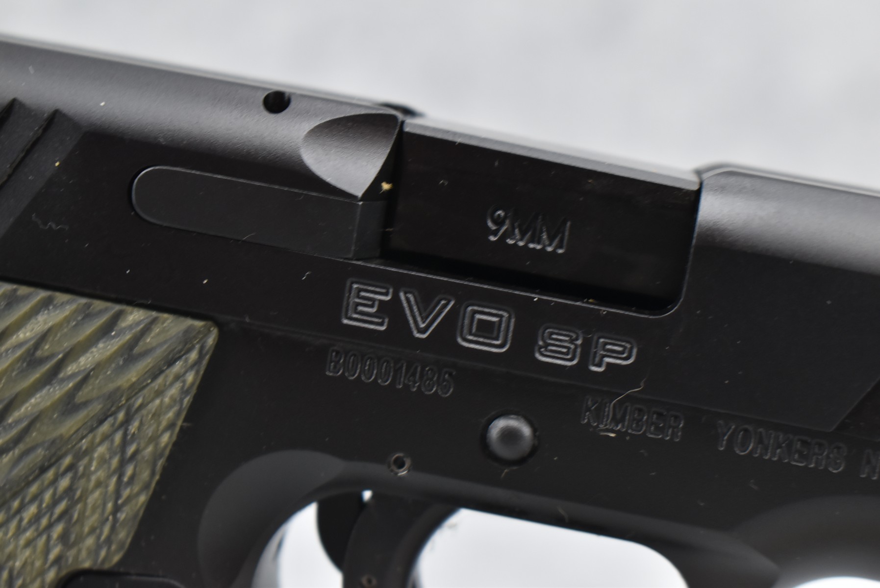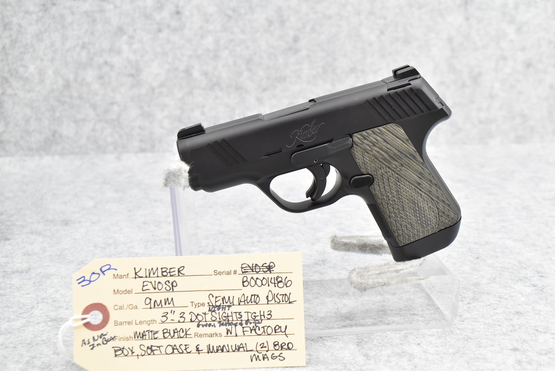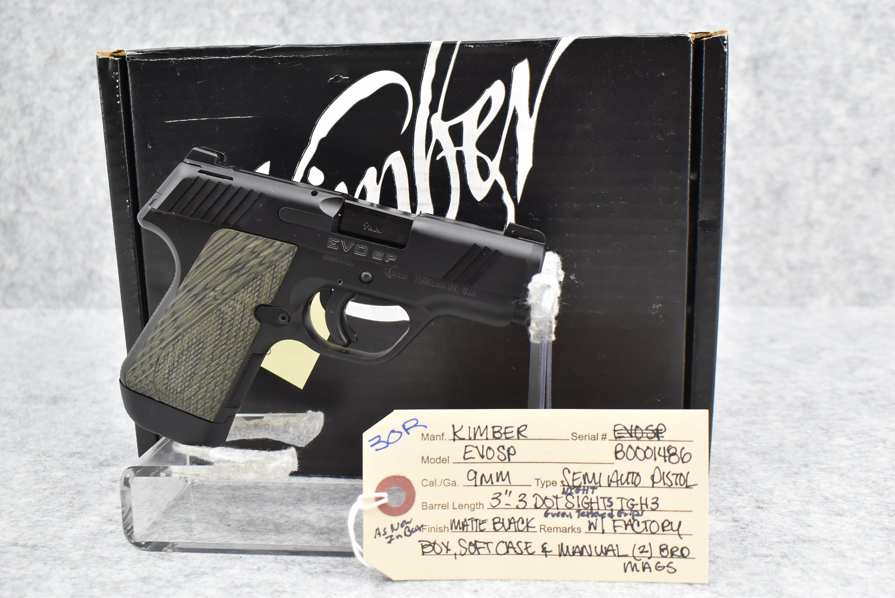 30R. Kimber – Mod. EVOSP – 9mm Cal. Semi-Auto Pistol – w/3” Barrel w/3-Dot Night Sights – Matte Black Finish – w/Green Textured Grips – As New w/Factory Box, Soft Case, Manual & Two 8Rd Magazines
