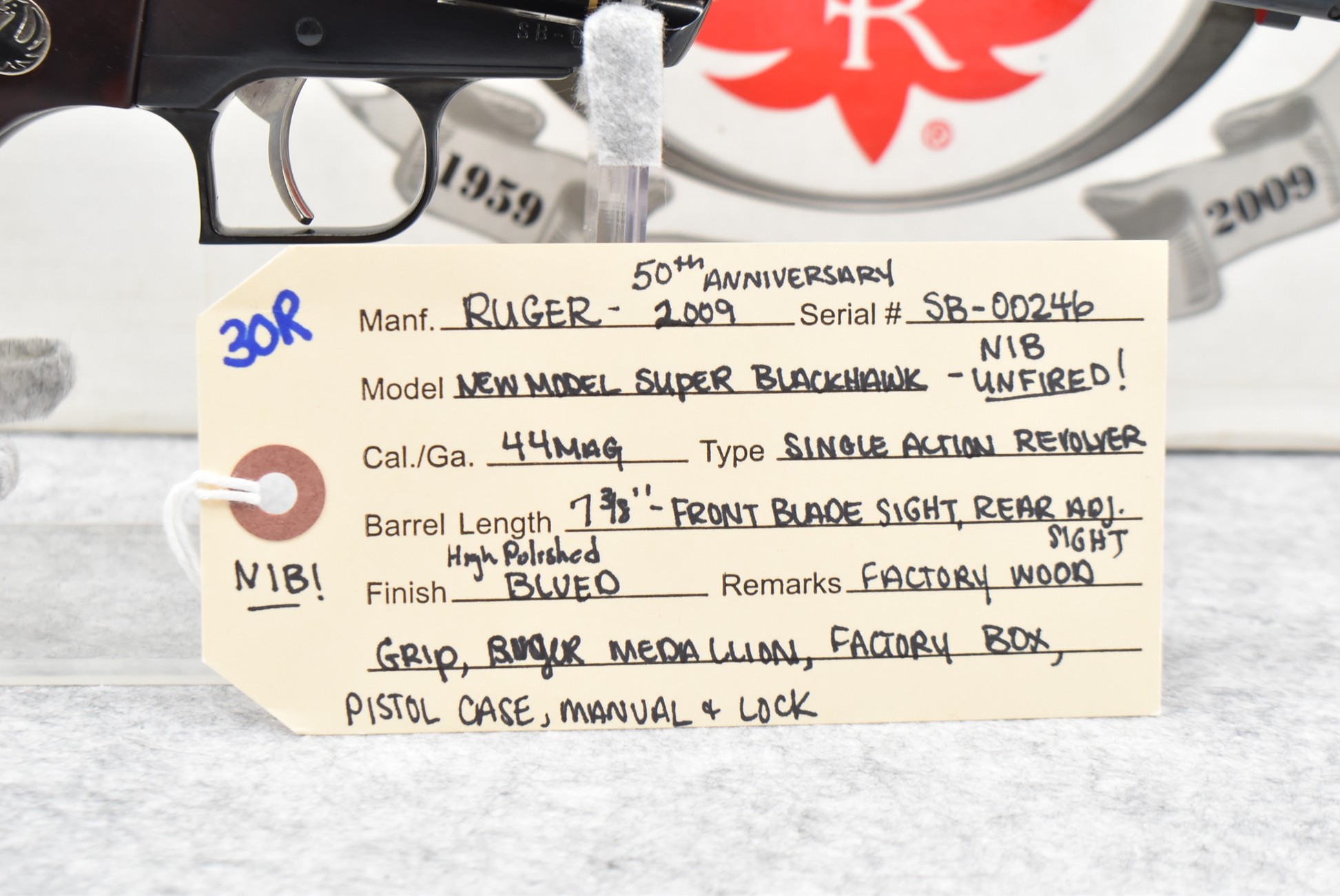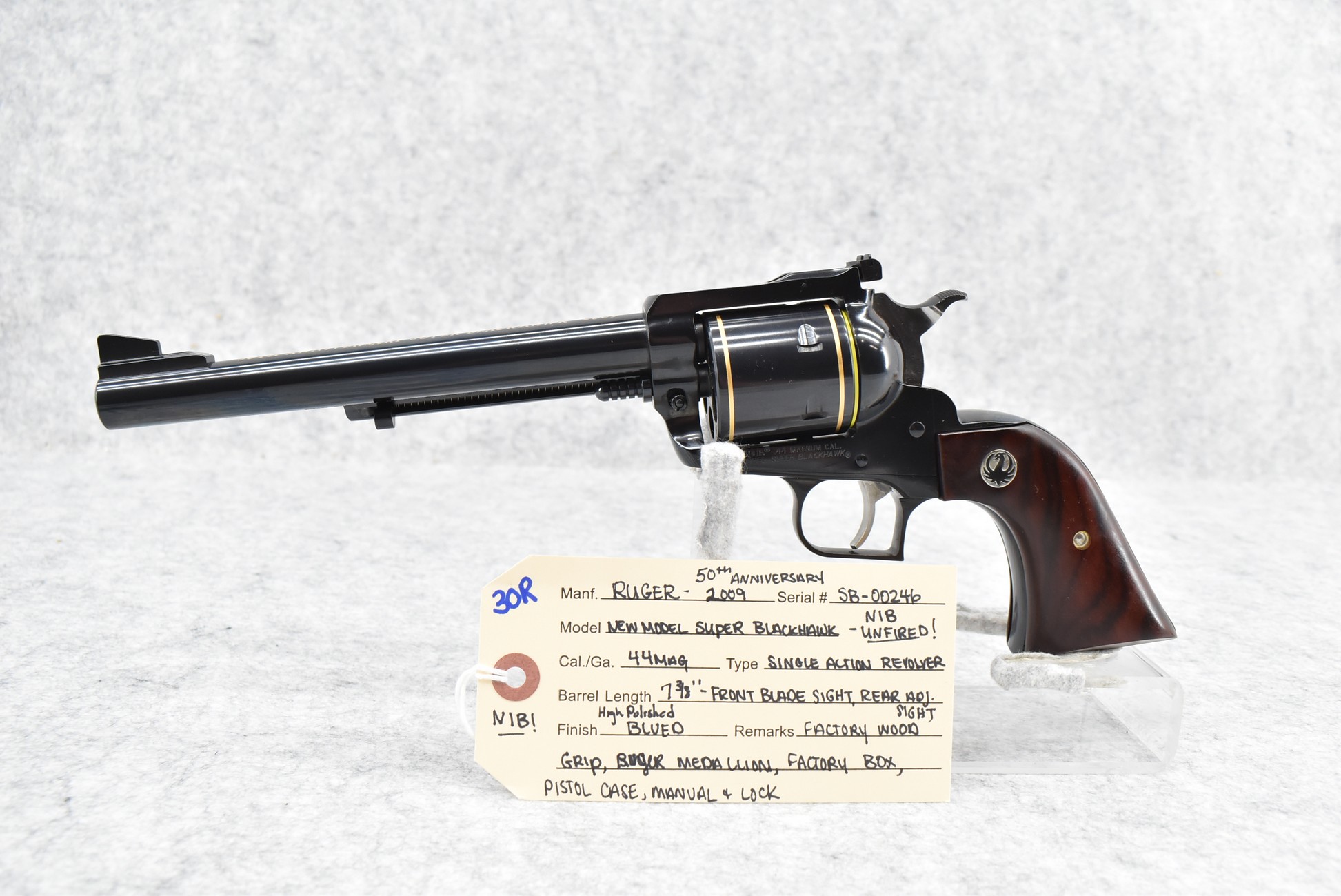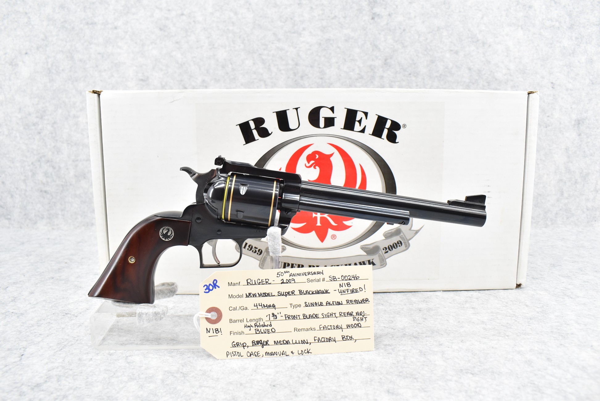 30R. Ruger – Mod. New Model Super Blackhawk 50th Anniversary (2009) – 44 Mag. Cal. Single Action Revolver – w/7 3/8” Barrel w/Blade Front and Adjustable Rear Sights – High Polished Blued Finish – w/Factory Wood Grip w/Ruger Medallion – New in Factory Box w/Pistol Case and Manual