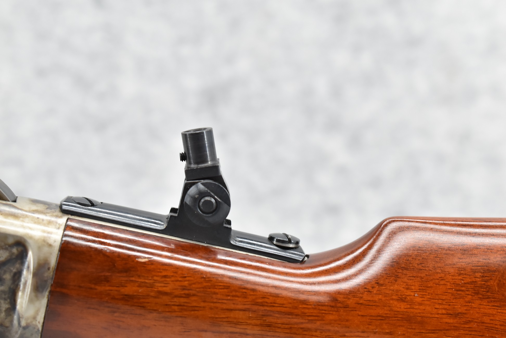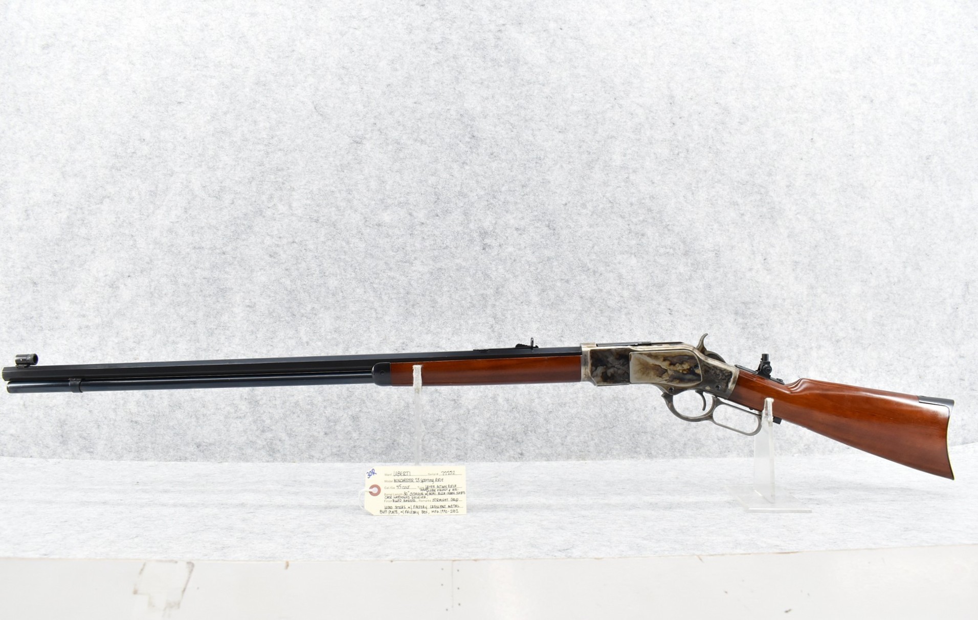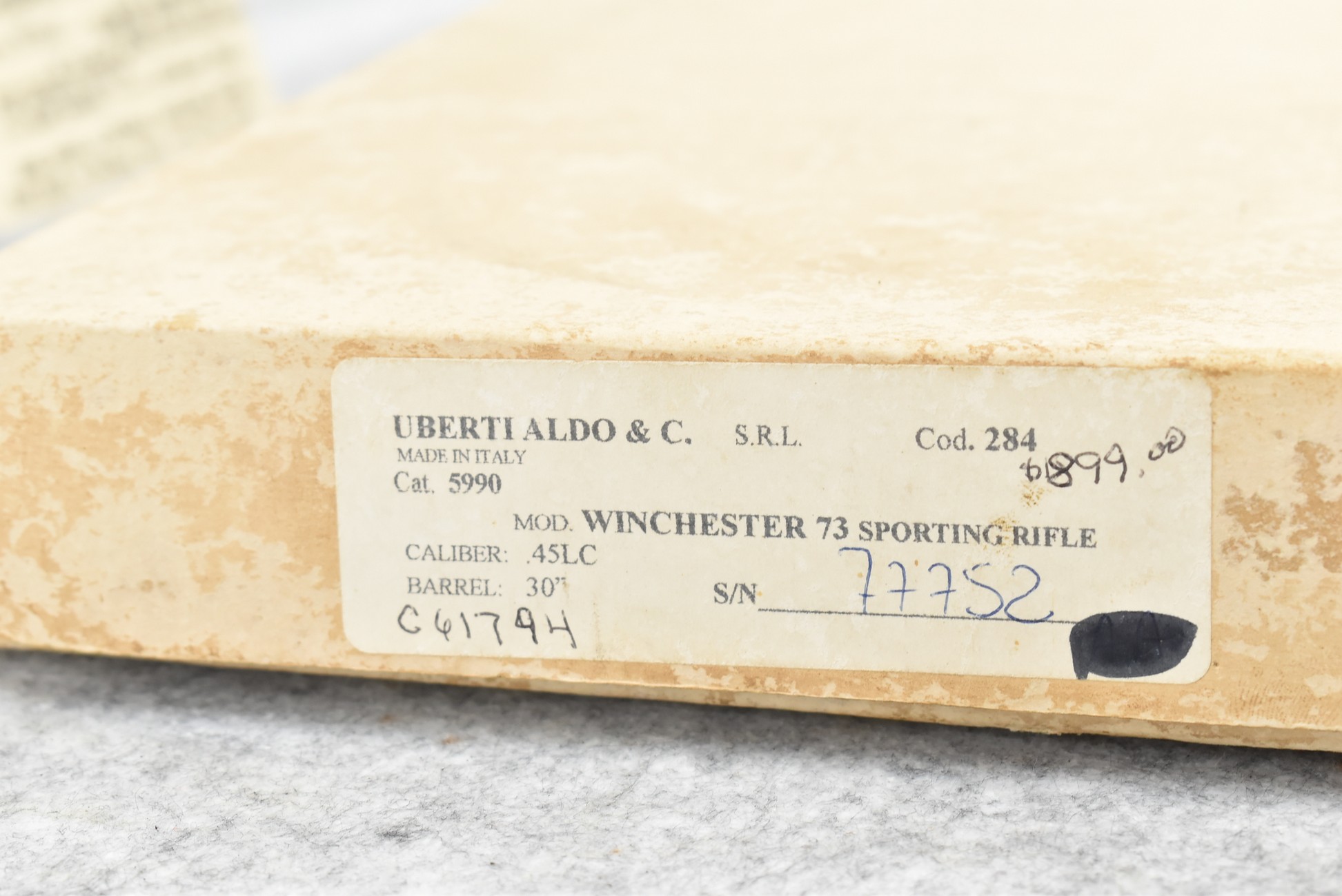 30R. Uberti – Mod. Winchester 73 Sporting Rifle – 45 Colt Cal. Lever Action Rifle – w/30” Octagon Blued Finish Barrel w/Target Globe Front & Adj. Semi Buckhorn Sights – w/Case Hardened Receiver – w/Straight Grip Wood Stocks w/Factory Crescent Metal Butt Plate – w/Factory Box – Mfg. 1990-2002