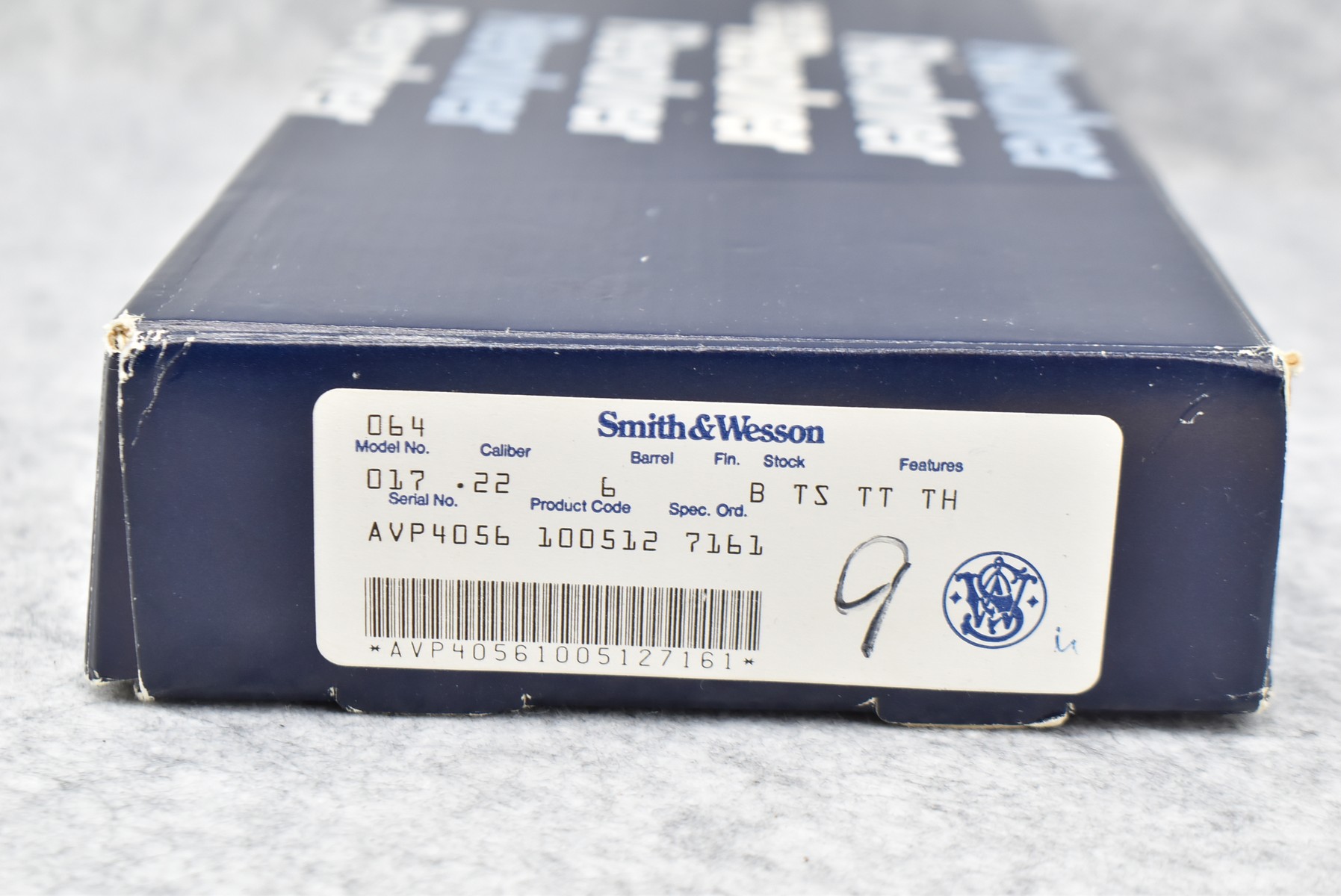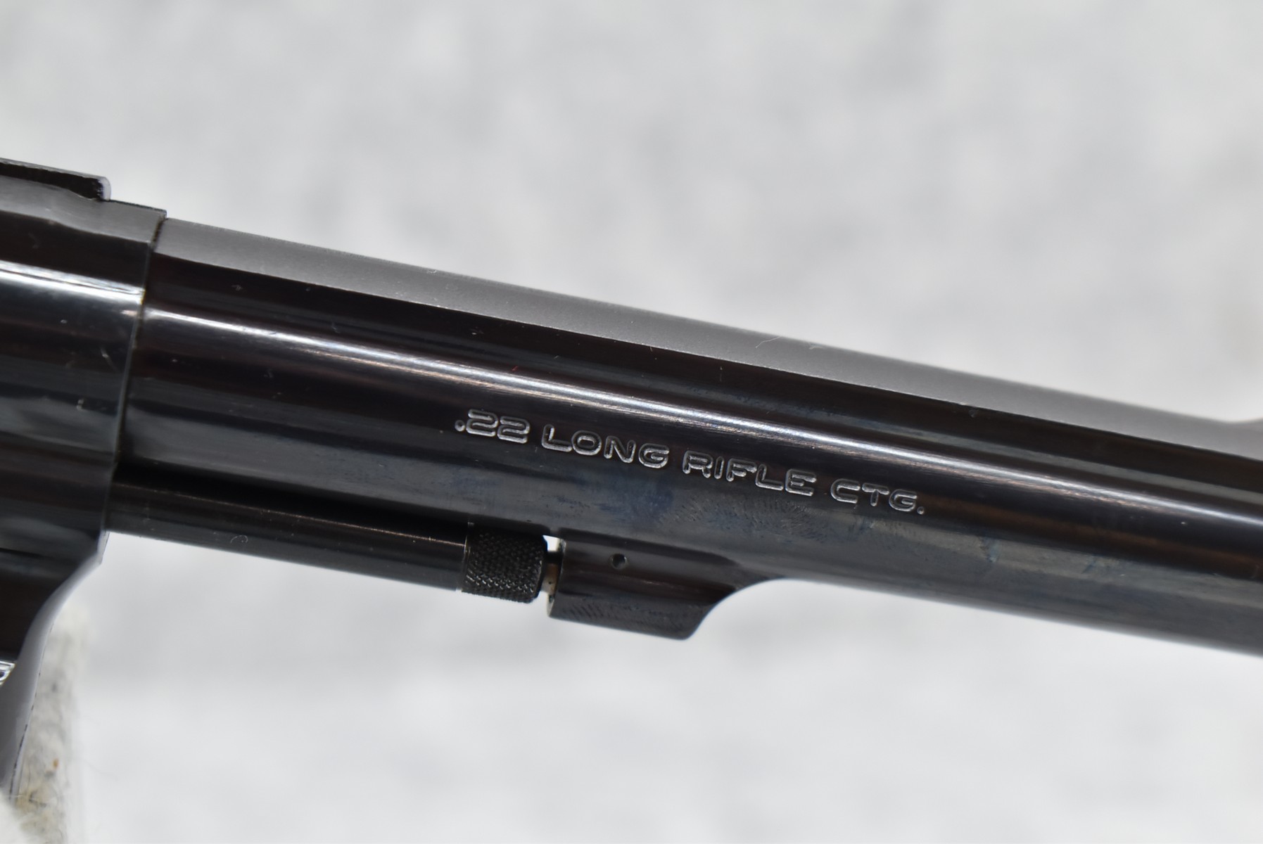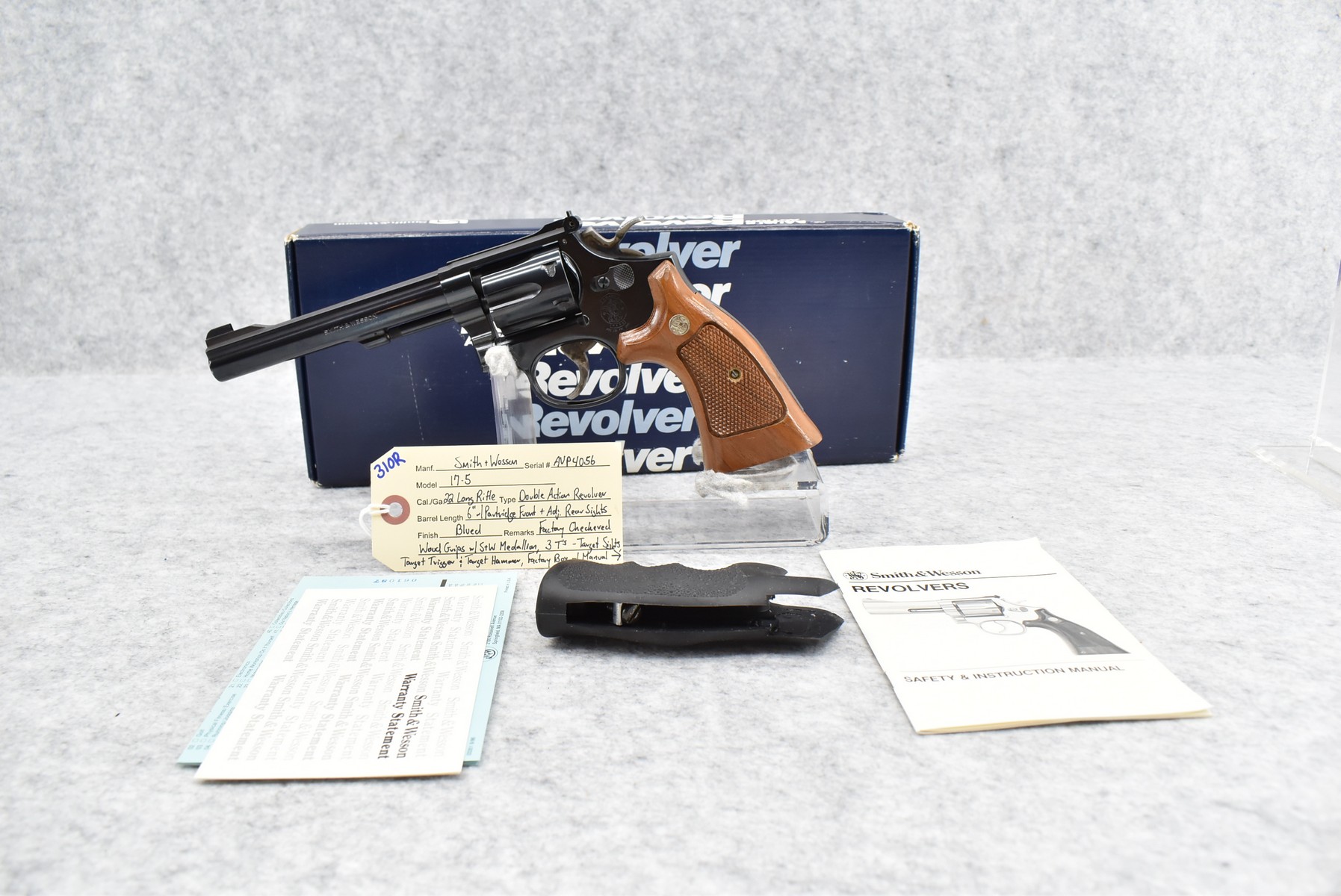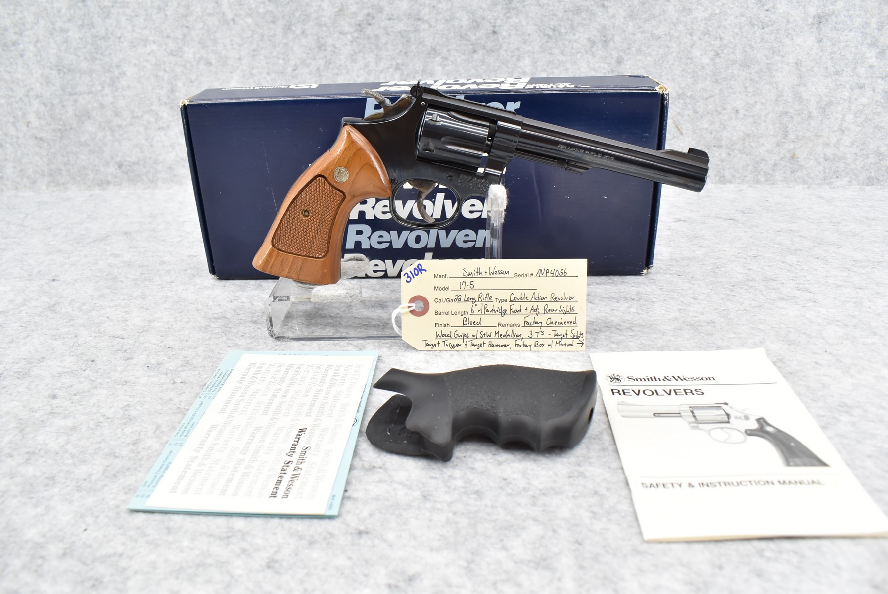 310R. Smith & Wesson – Mod. 17-5 – 22 Long Rifle Cal. Double Action Revolver – w/6” Barrel w/Partridge Front & Adj. Rear Sights – Blued Finish – w/Factory Checkered Wood Target Grips w/S&W Medallion, Target Trigger & Target Hammer (3T’s) – w/Factory Box, Manual & Extra Set of Hogue Rubber Grips