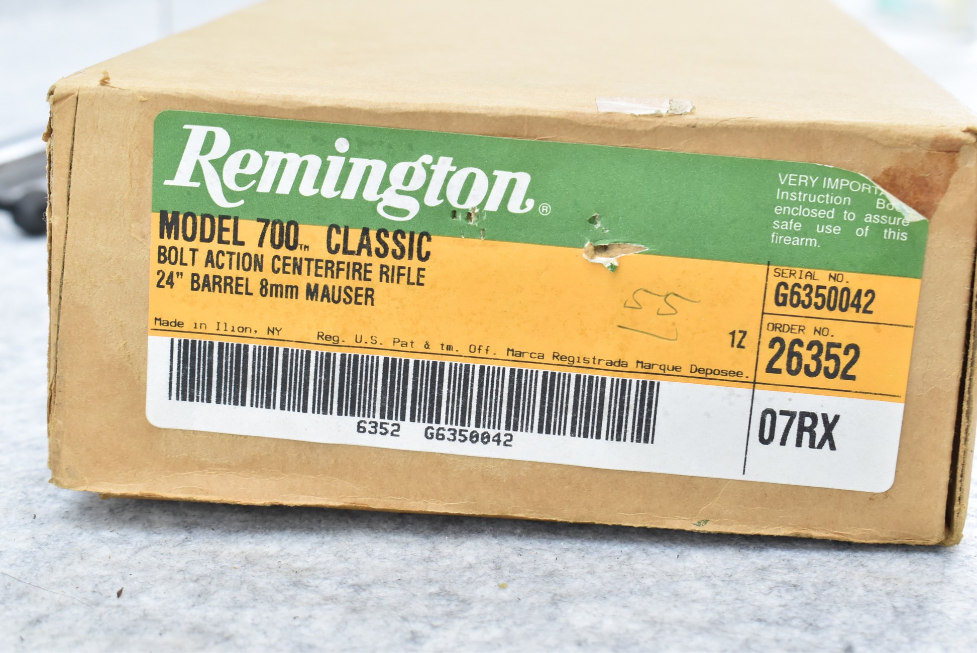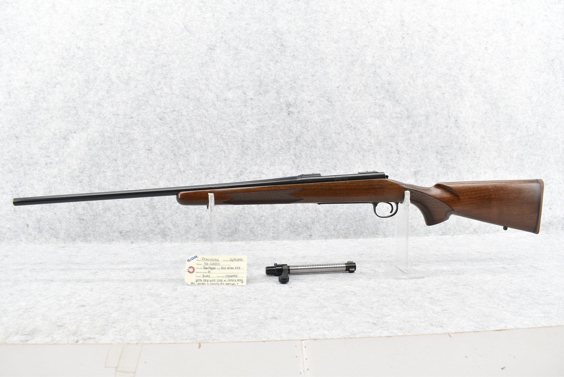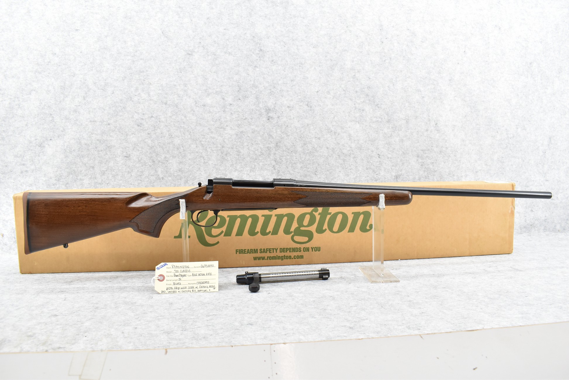 312R. Remington – Mod. 700 Classic – 8mm Mauser Cal. Bolt Action Rifle – w/24” Barrel – Blued Finish – w/Checkered Pistol Grip Wood Stock w/Factory Recoil Pad – Unfired w/Factory Box, Manual & (2) Lock Key Assembly – 8mm Mauser Cal. Was 2004 Caliber of the Year