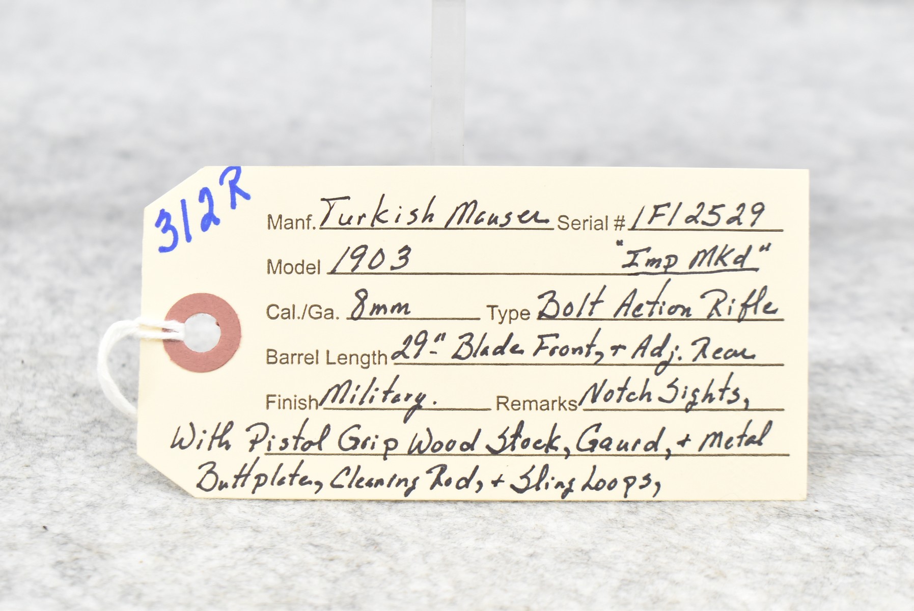 312R. Turkish Mauser – Mod. 1903 – 8mm Cal. Bolt Action Rifle – w/29” Barrel w/Blade Front & Adj. Rear Notch Sights – Military Finish – w/Pistol Grip Wood Stocks w/Metal Butt Plate – w/Sling Sloops – w/Cleaning Rod – Import Marked