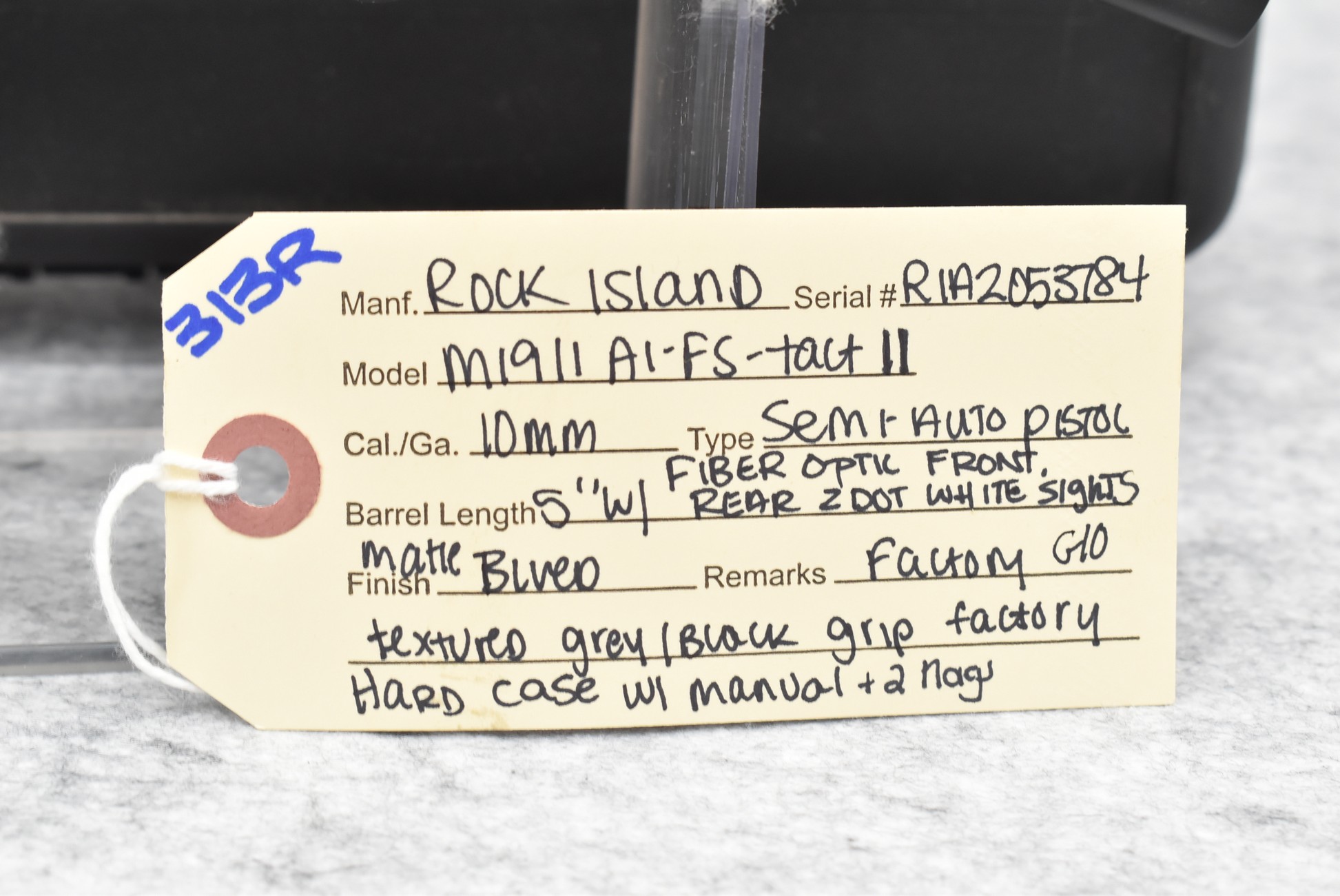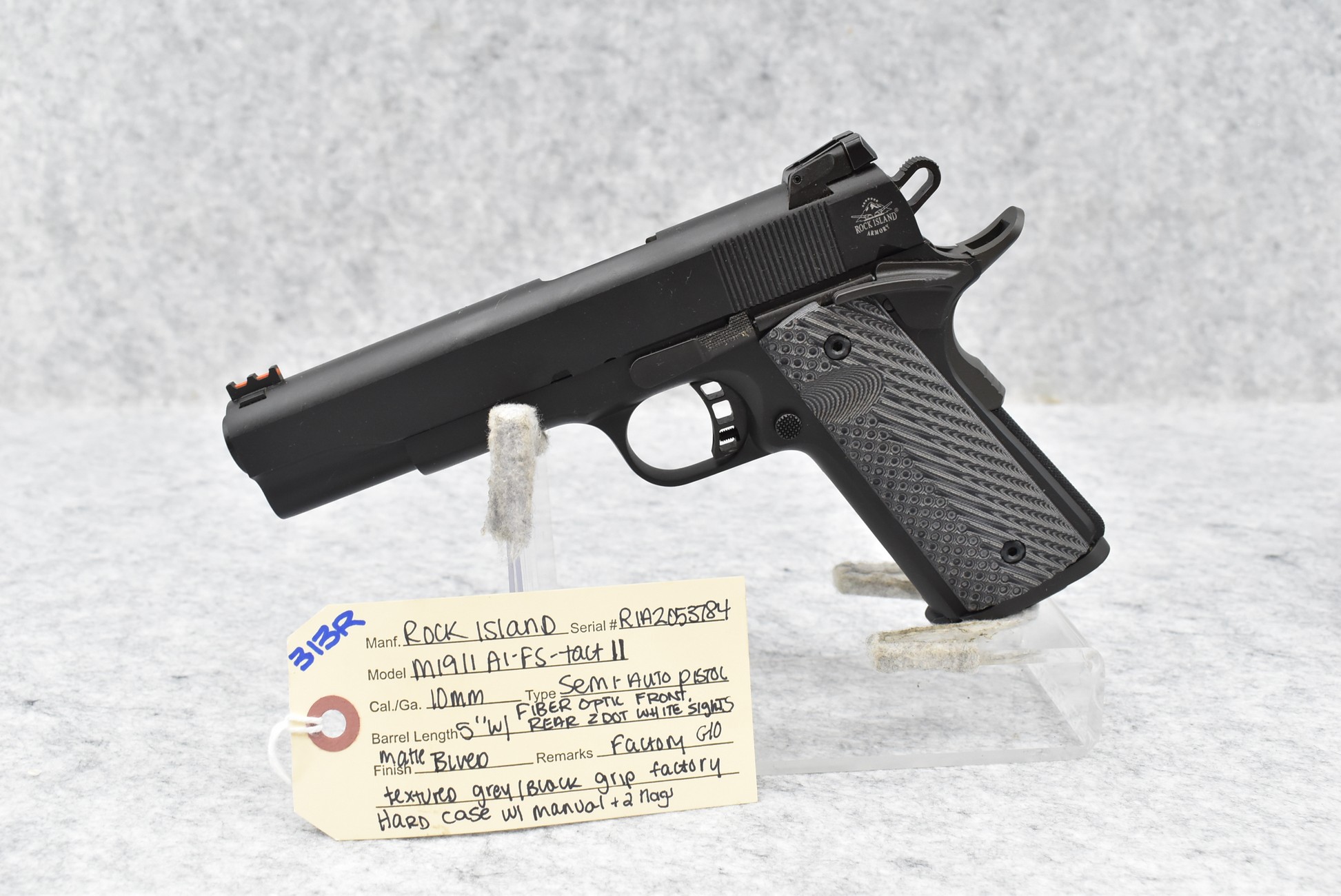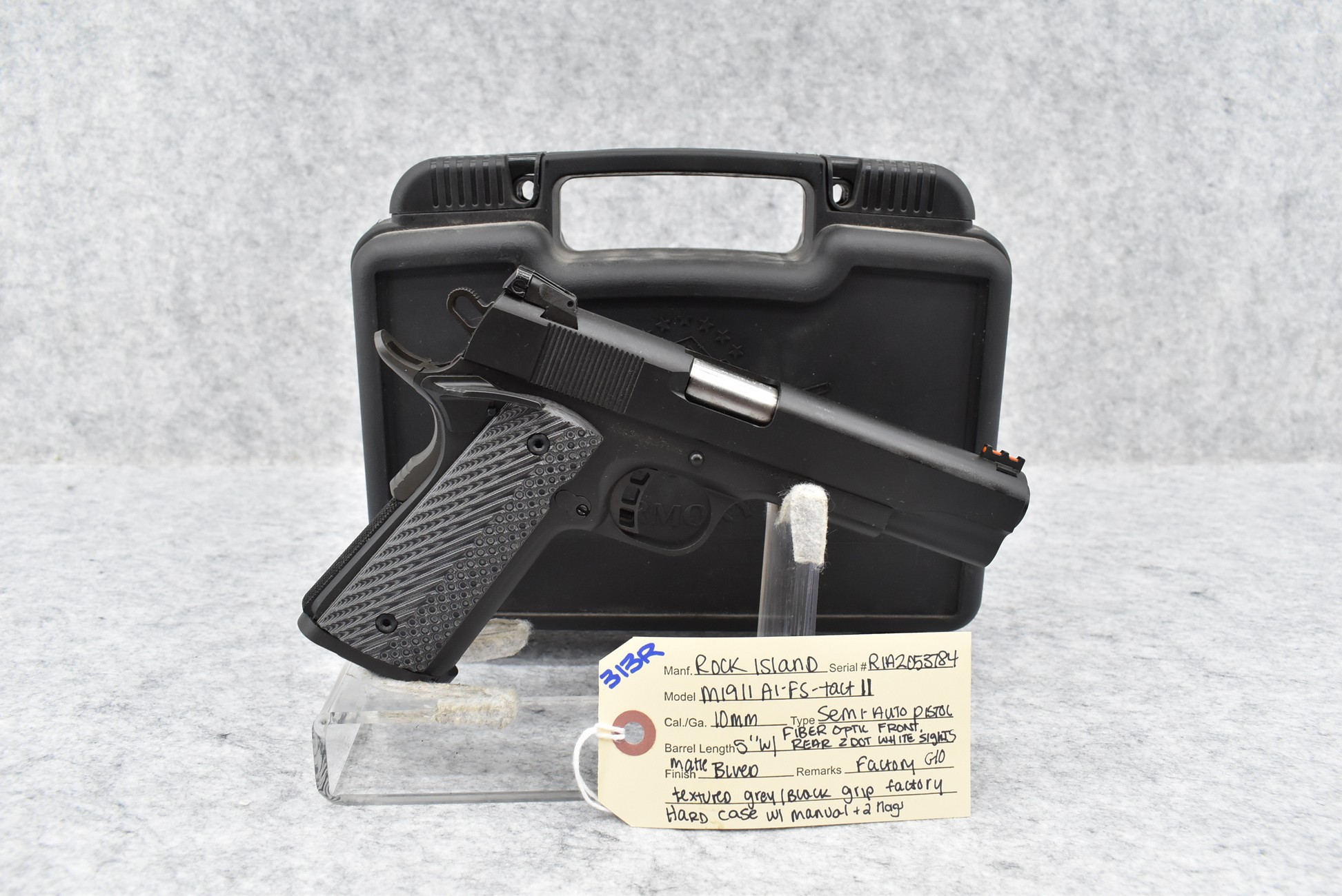 313R. Rock Island – Mod. M1911 A1-FS-Tact II – 10mm Cal. Semi-Auto Pistol – w/5” Barrel w/Fiber Optic Front & Rear 2-Dot White Sights – Matte Blued Finish – w/Factory G10 Textured Gray/Black Grip – w/Factory Hard Case – w/Manual & 2 Mags
