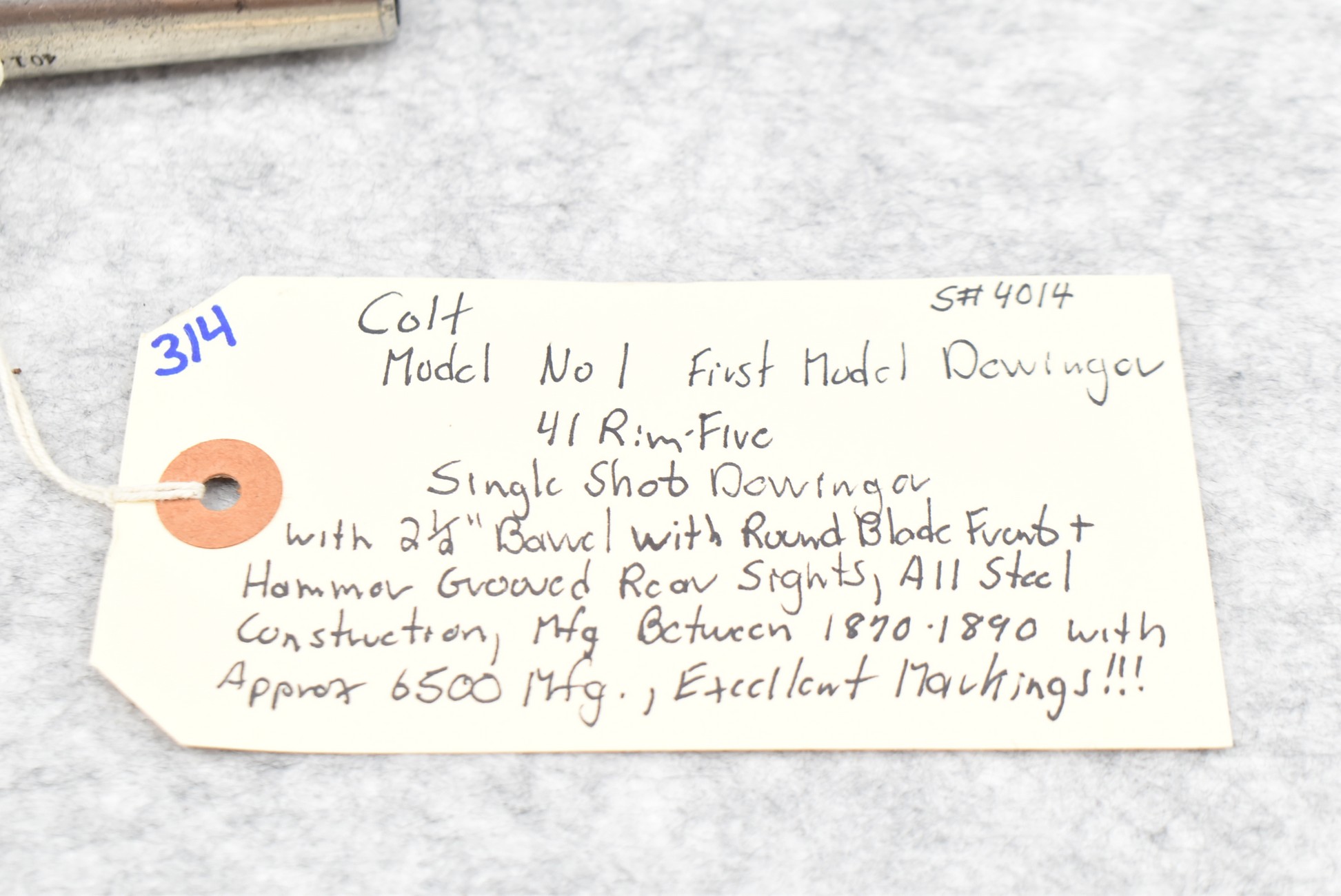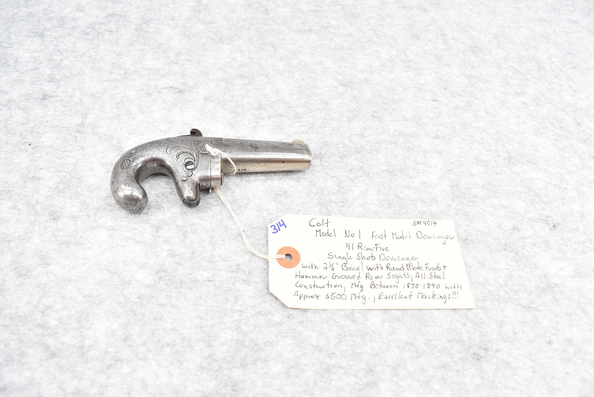 314. Colt – Mod. No. 1 First Model Derringer – 41 RF Cal. Single Shot Derringer – w/2 ½” Barrel w/Round Blade Front & Hammer Grooved Rear Sights – All Steel Construction – Approx. 6,500 Mfg. Between 1870-1890 – Excellent Markings!!!