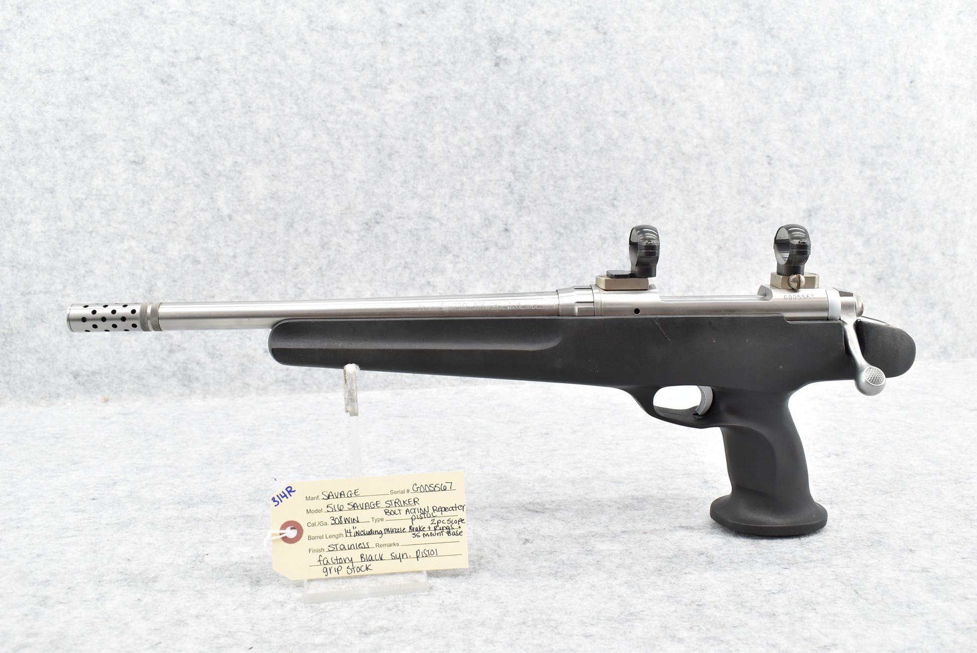 314R. Savage – Mod. 516 Savage Striker – 308 Win. Cal. Bolt Action Repeater Pistol – w/14” Barrel Including Muzzle Brake – Stainless Finish – w/Factory Black Synthetic Pistol Grip Stock – w/2pc. Scope Rings & Stainless Bases