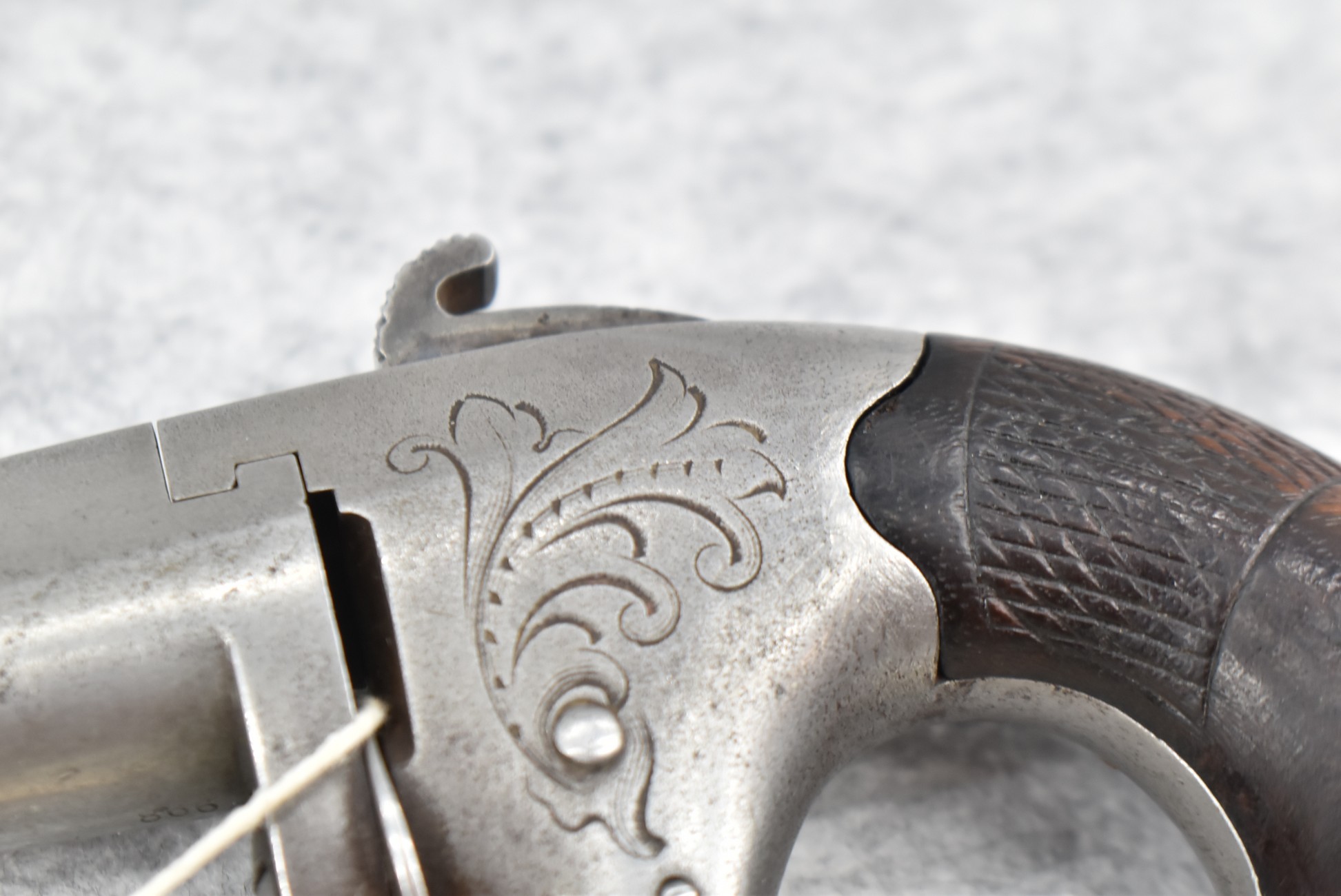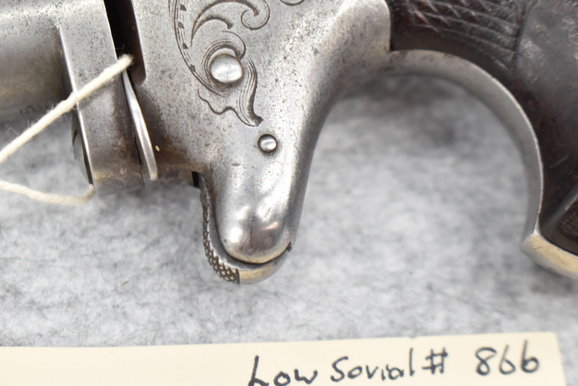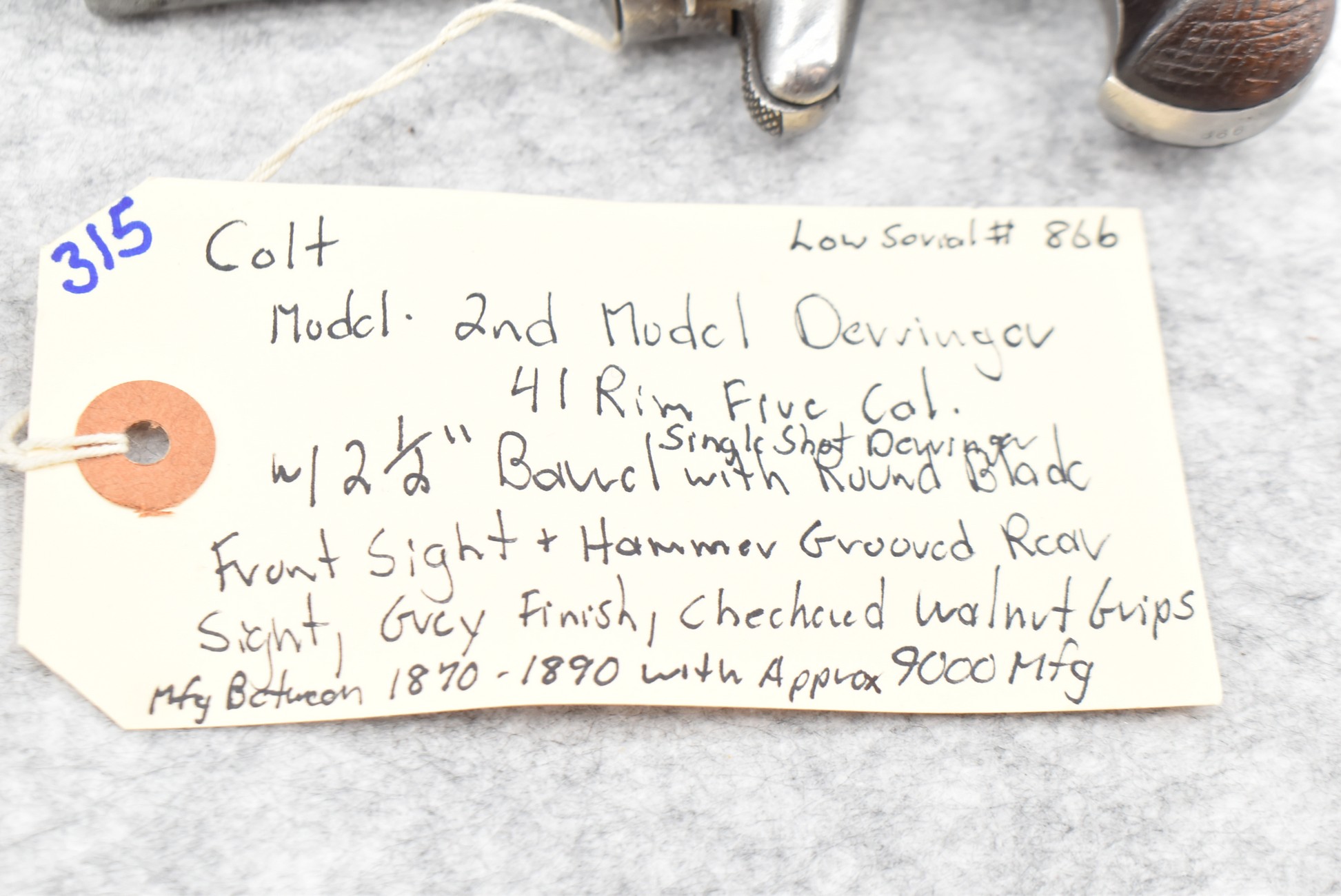 315. Colt – 2nd Model Derringer – 41 RF Cal. Single Shot Derringer – w/2 ½” Barrel w/Round Blade Front Sight & Hammer Grooved Rear Sights – Gray Finish – w/Checkered Walnut Grips – Note Low Serial #866 – Approx. 9,000 Mfg. Between 1870-1890