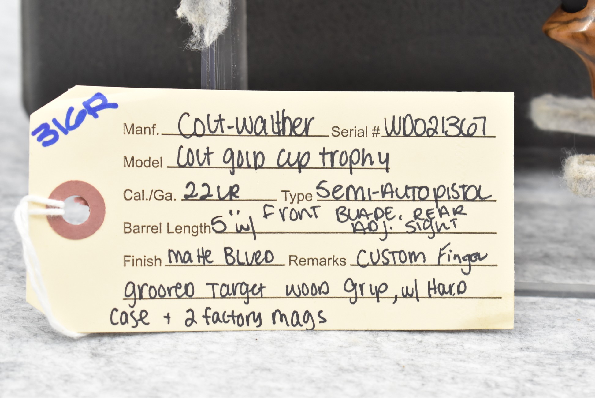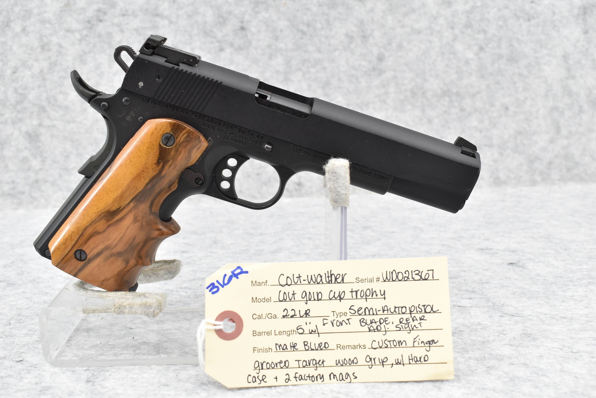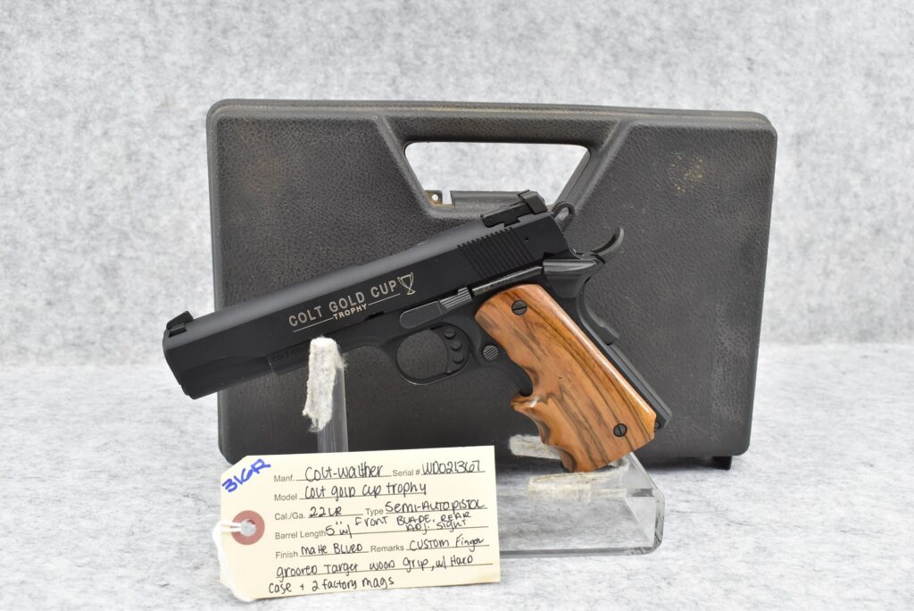 316R. Colt-Walther – Mod. Colt Gold Cup Trophy – 22LR Cal. Semi-Auto Pistol – w/5” Barrel w/Front Blade & Rear Adj. Sights – Matte Blued Finish – w/Custom Finger Grooved Target Wood Grip – w/Hard Case & 2 Factory Mags