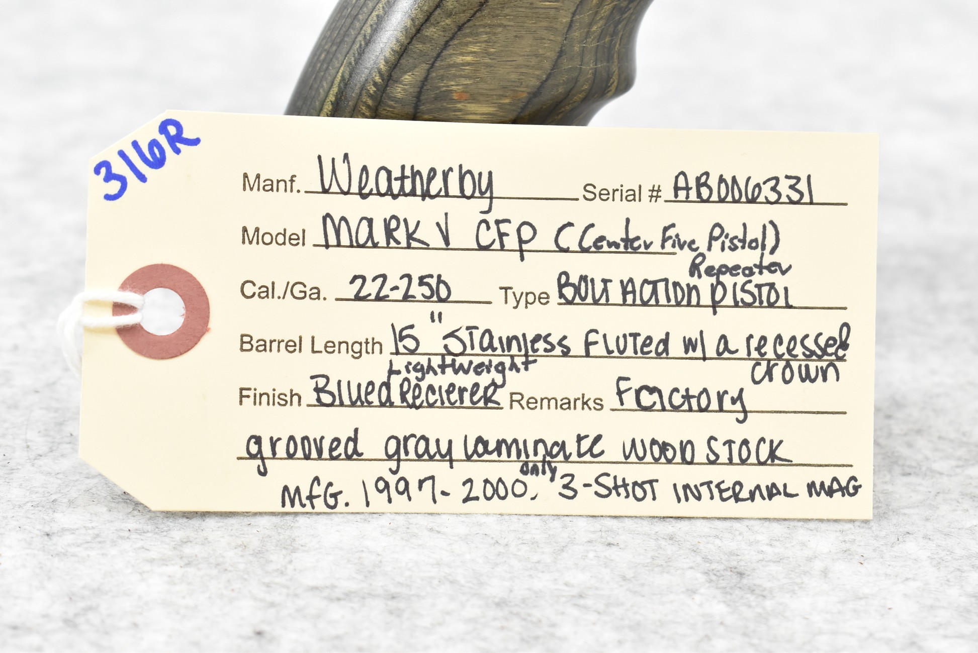316R. Weatherby – Mod. Mark V CFP (Center Fire Pistol) – 22-250 Cal. Bolt Action Repeater Pistol – w/15” Stainless Finish Fluted Barrel w/A Recessed Crown – w/Blued Finish, Lightweight Action – w/Factory Gray Laminate Wood Stock – w/3-Shot Internal Mag – Mfg. Between 1997-2000 Only