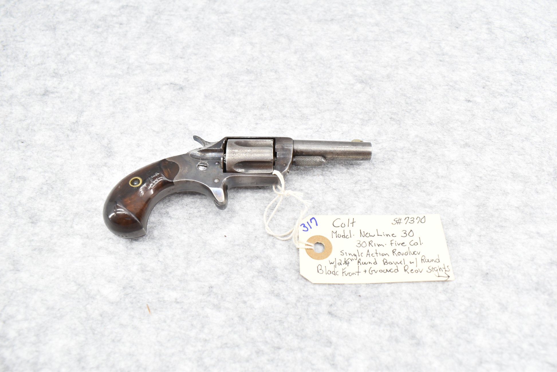 317. Colt – Mod. New Line 30 – 30 RF Cal. Single Action Revolver – w/2 ¼” Round Barrel w/Round Blade Front & Grooved Rear Sights – Blued/Gray Finish w/Vivid Case Hardening Remaining on Receiver – w/Correct Rosewood Grips – Only 11,000 Mfg. Between 1874-1876 – Fully Functional