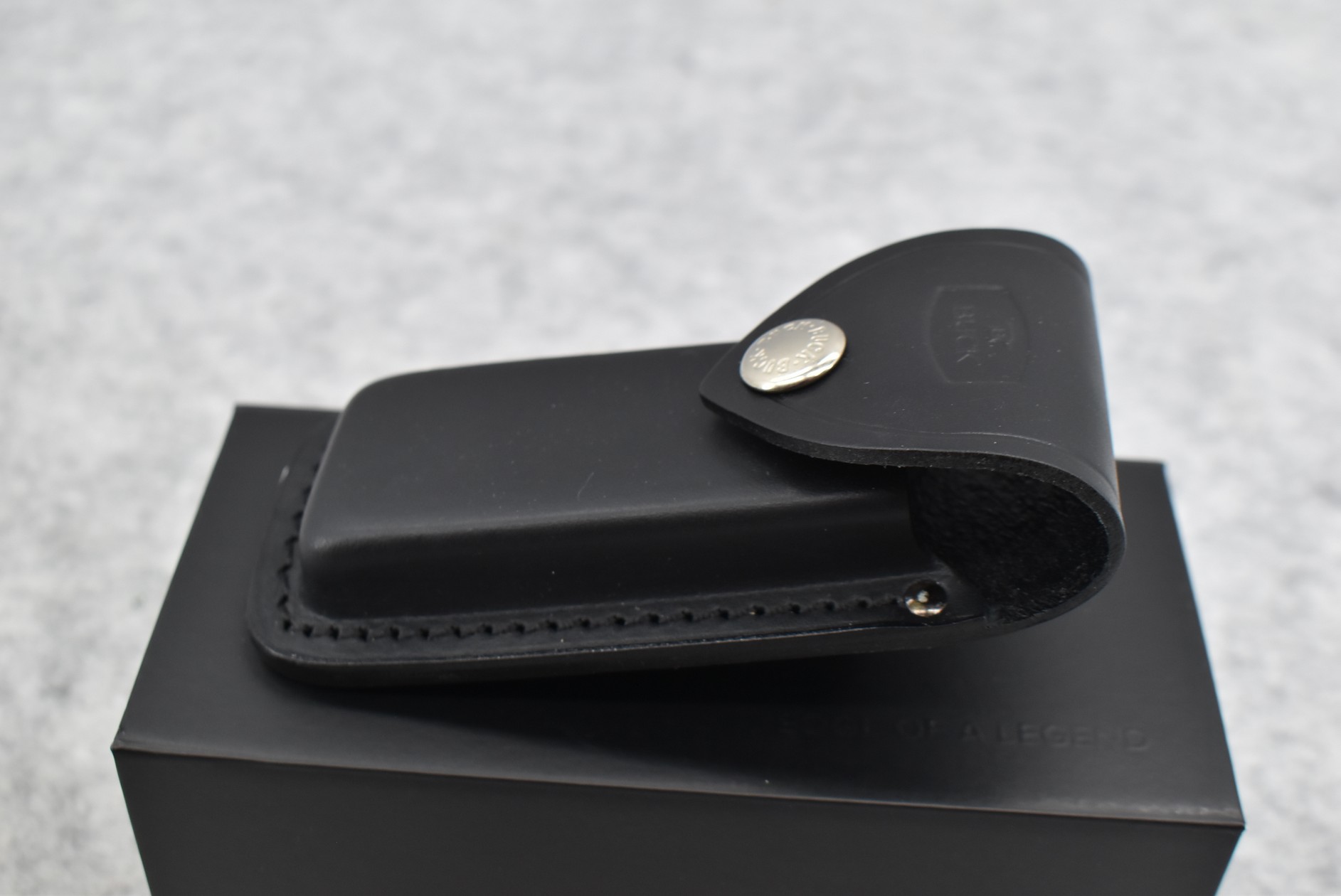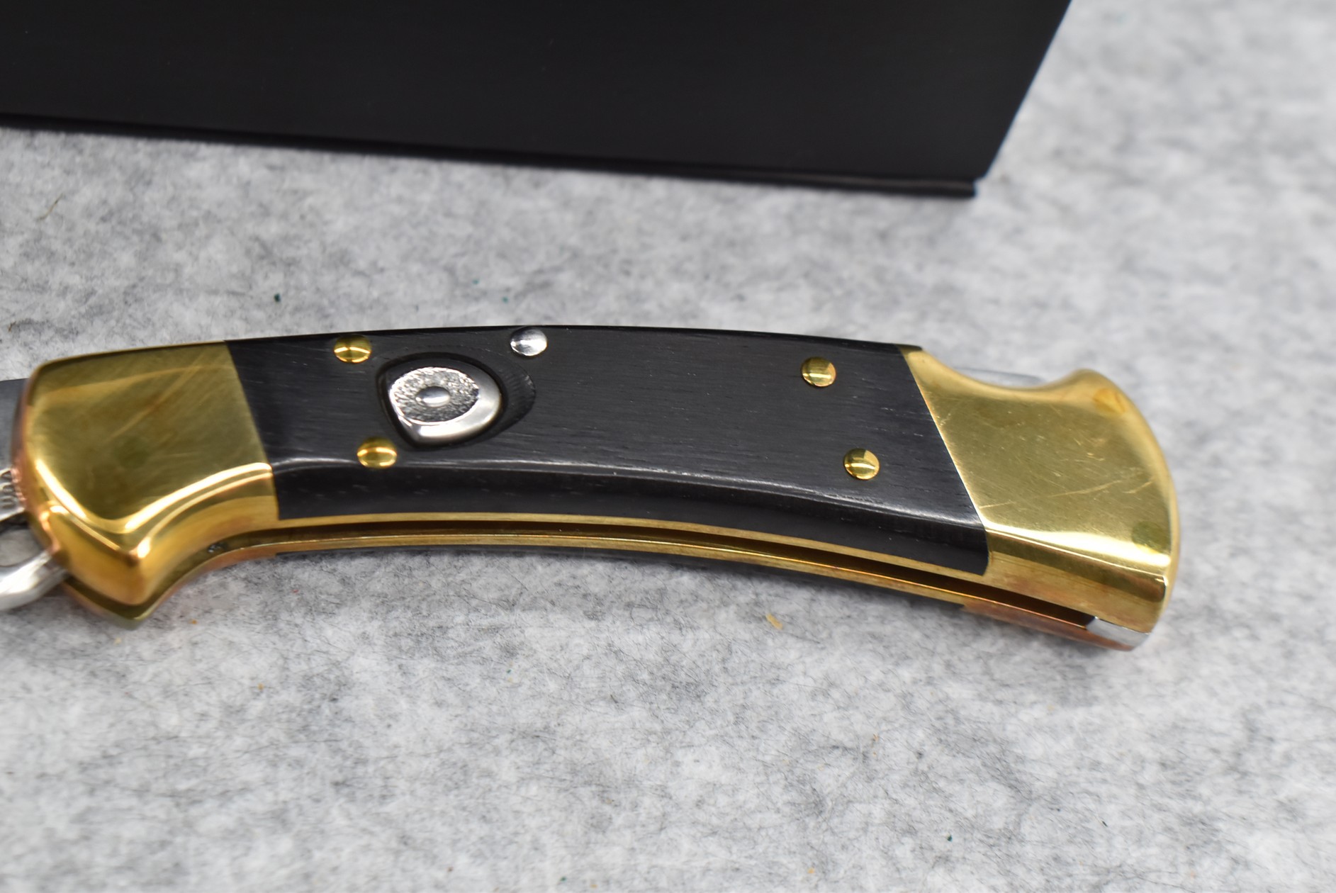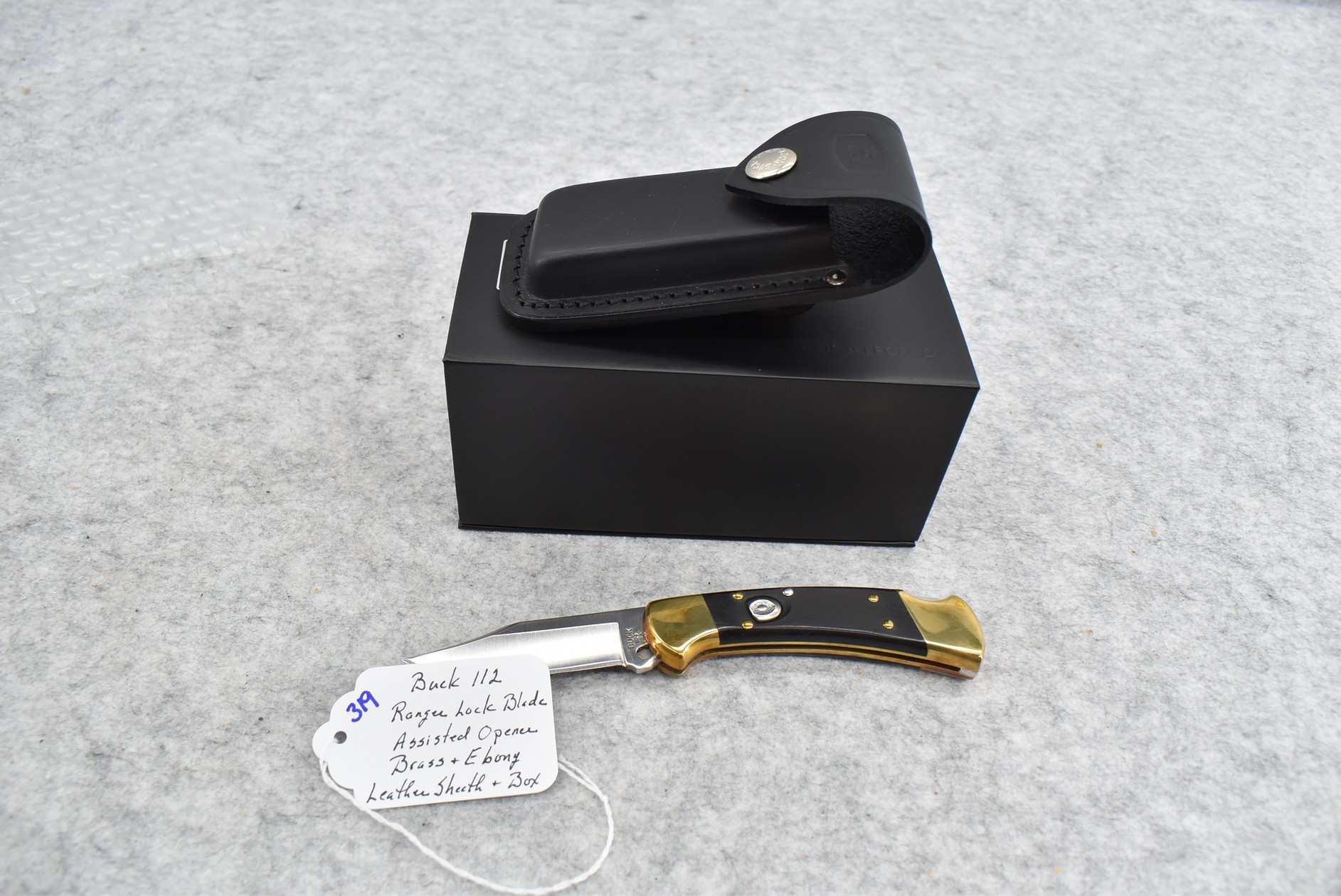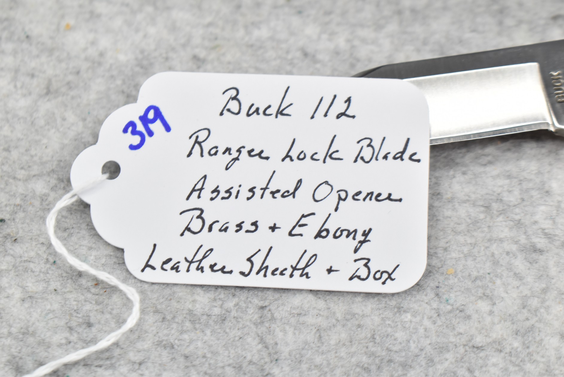 319. Buck – #112 – Ranger Lock Blade Assisted Opener – Brass & Ebony – w/Leather Sheath – w/Box