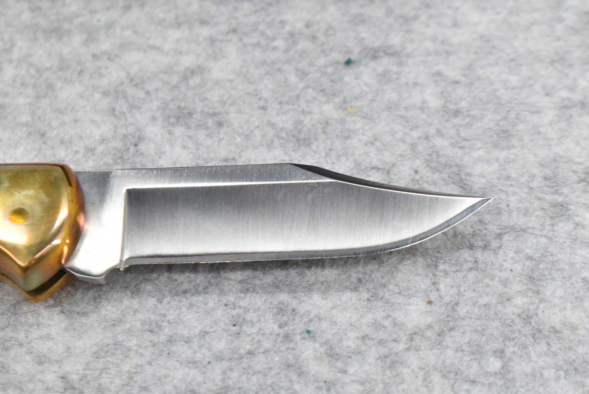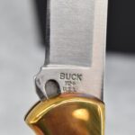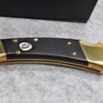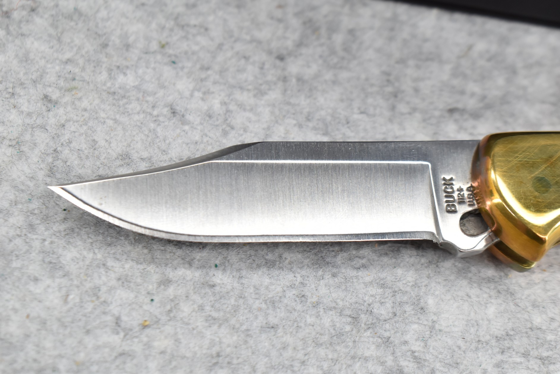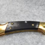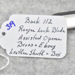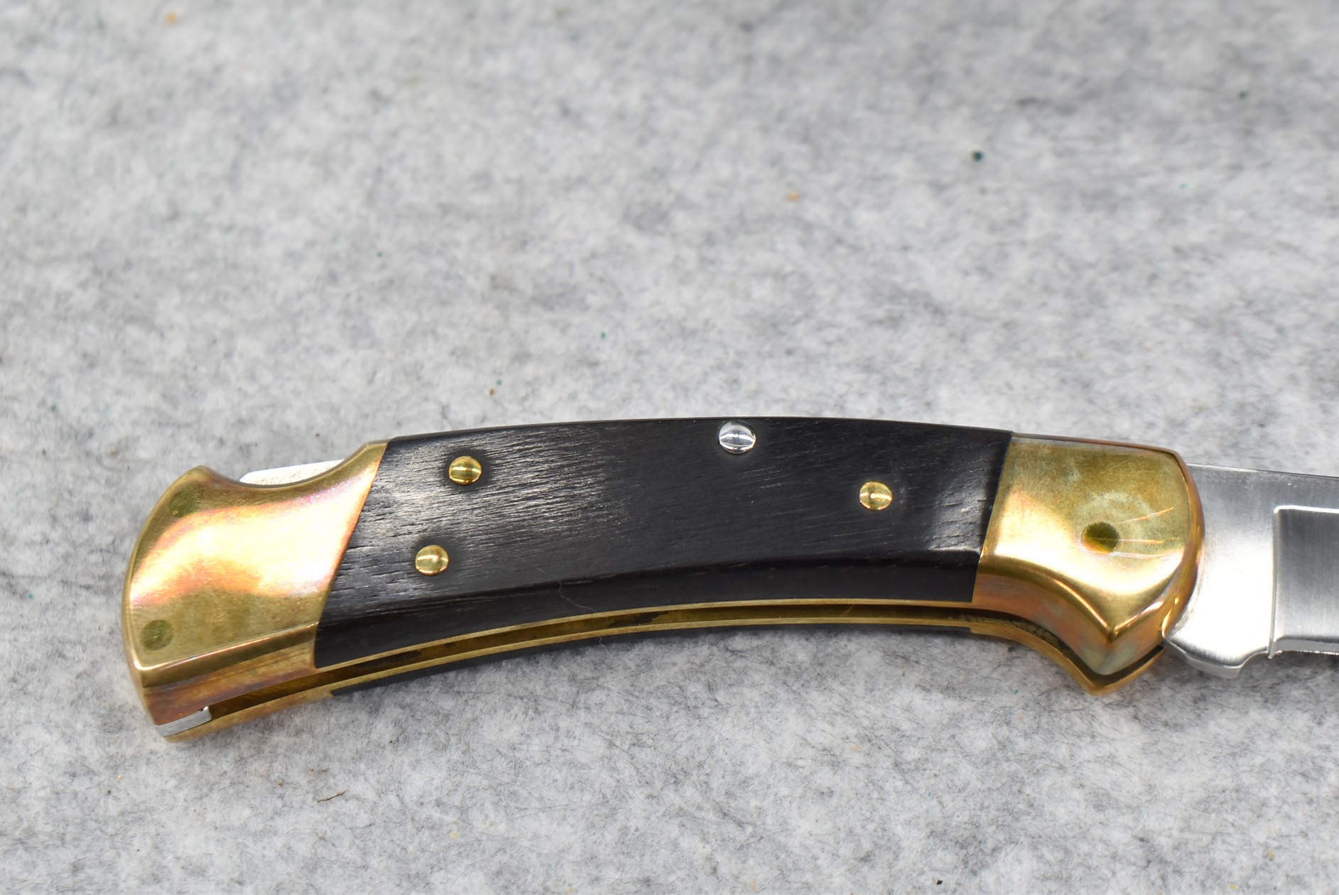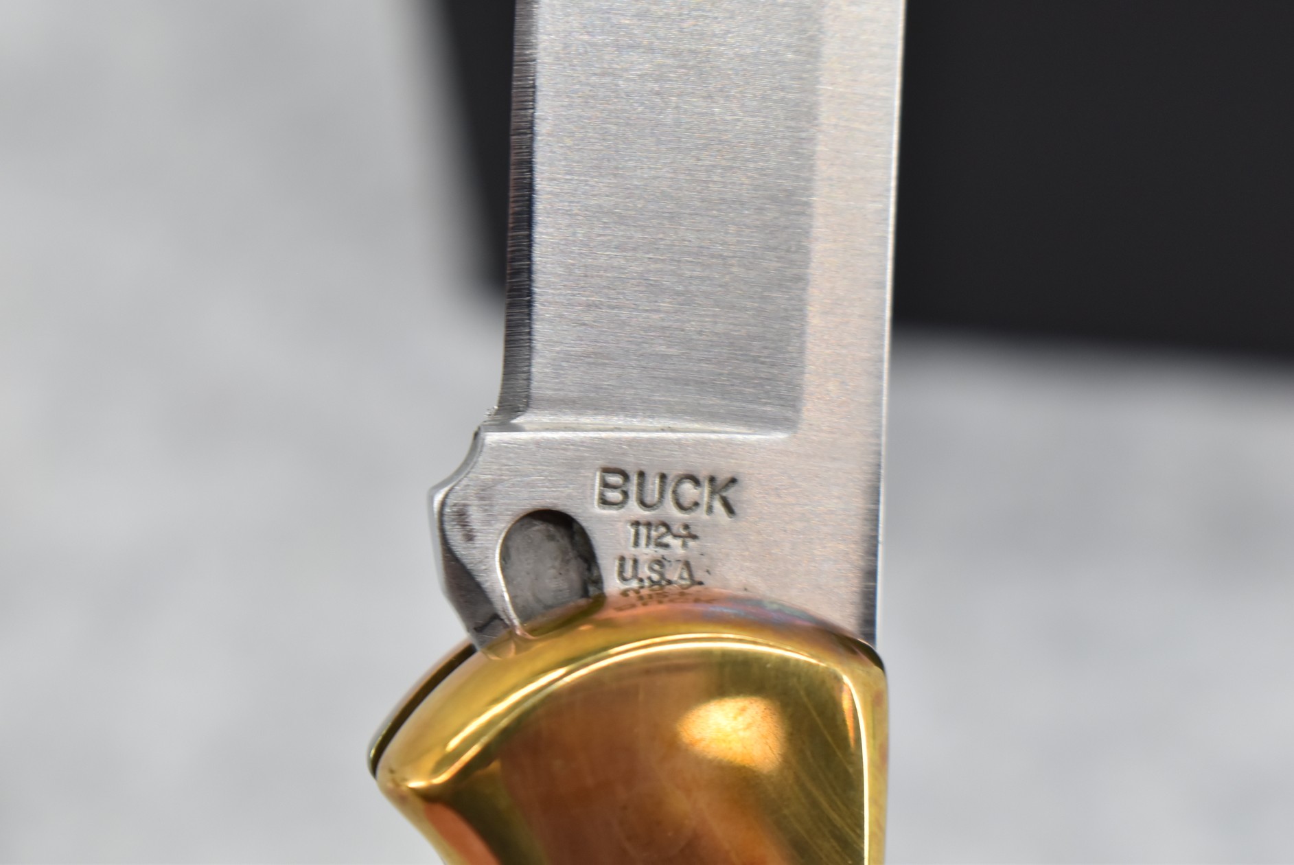 319.     Buck – #112 – Ranger Lock Blade Assisted Opener – Brass & Ebony – w/Leather Sheath – w/Box