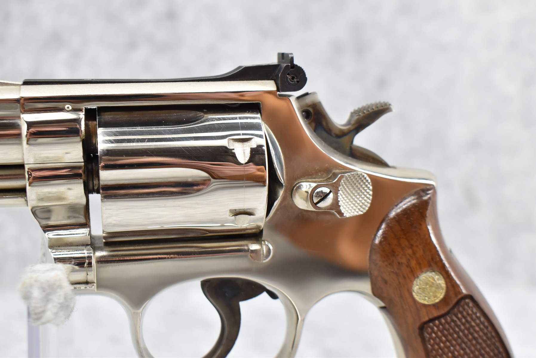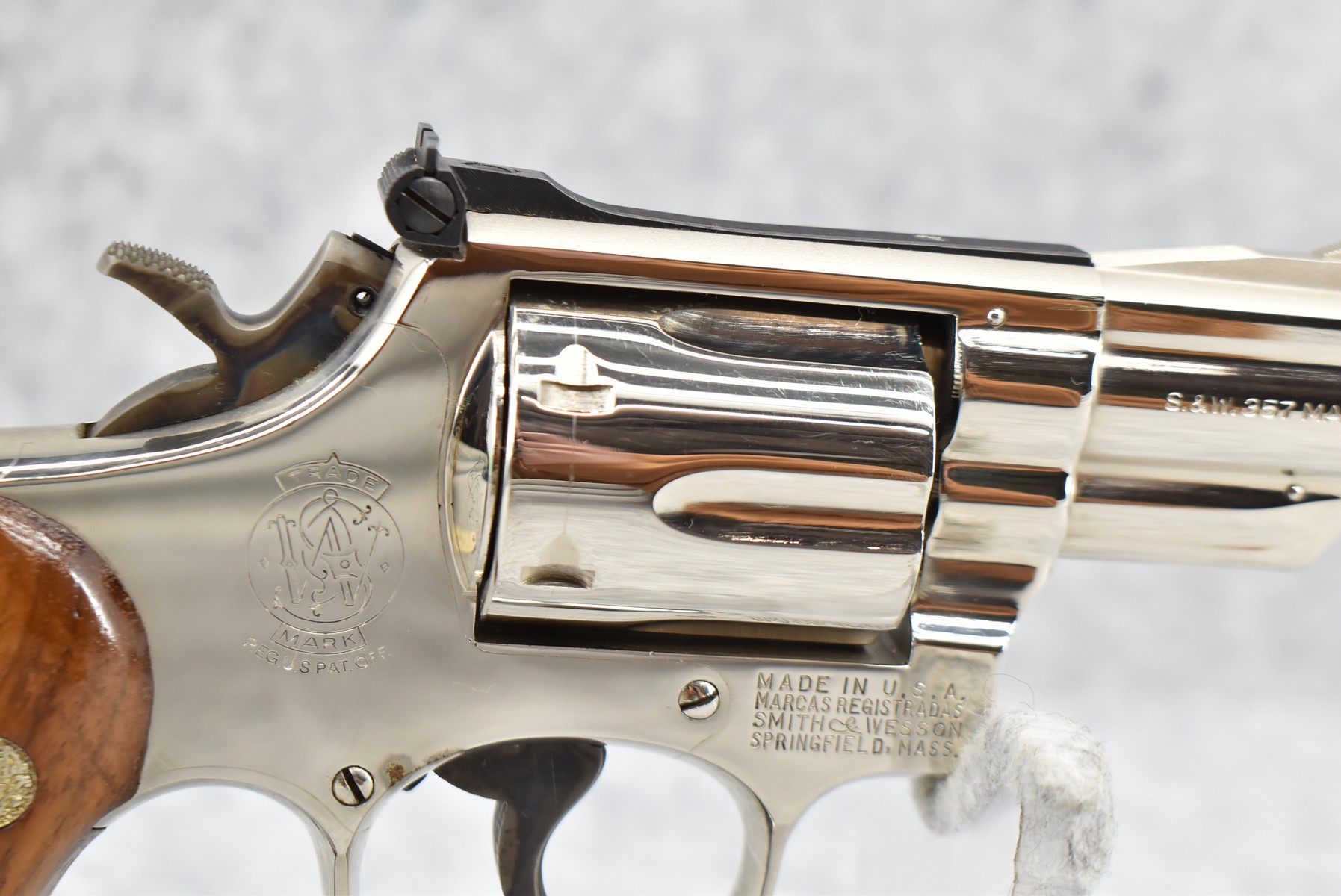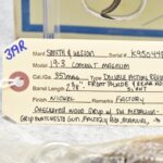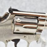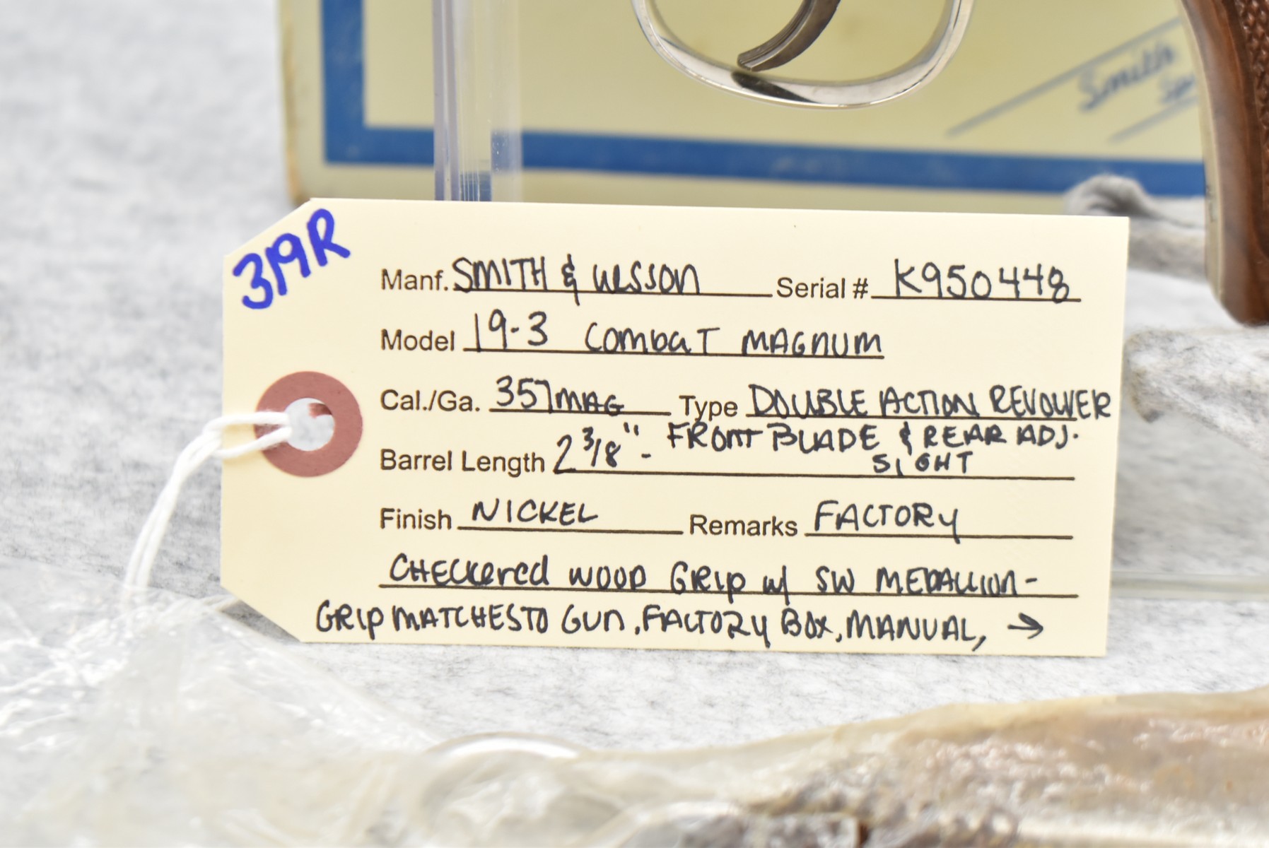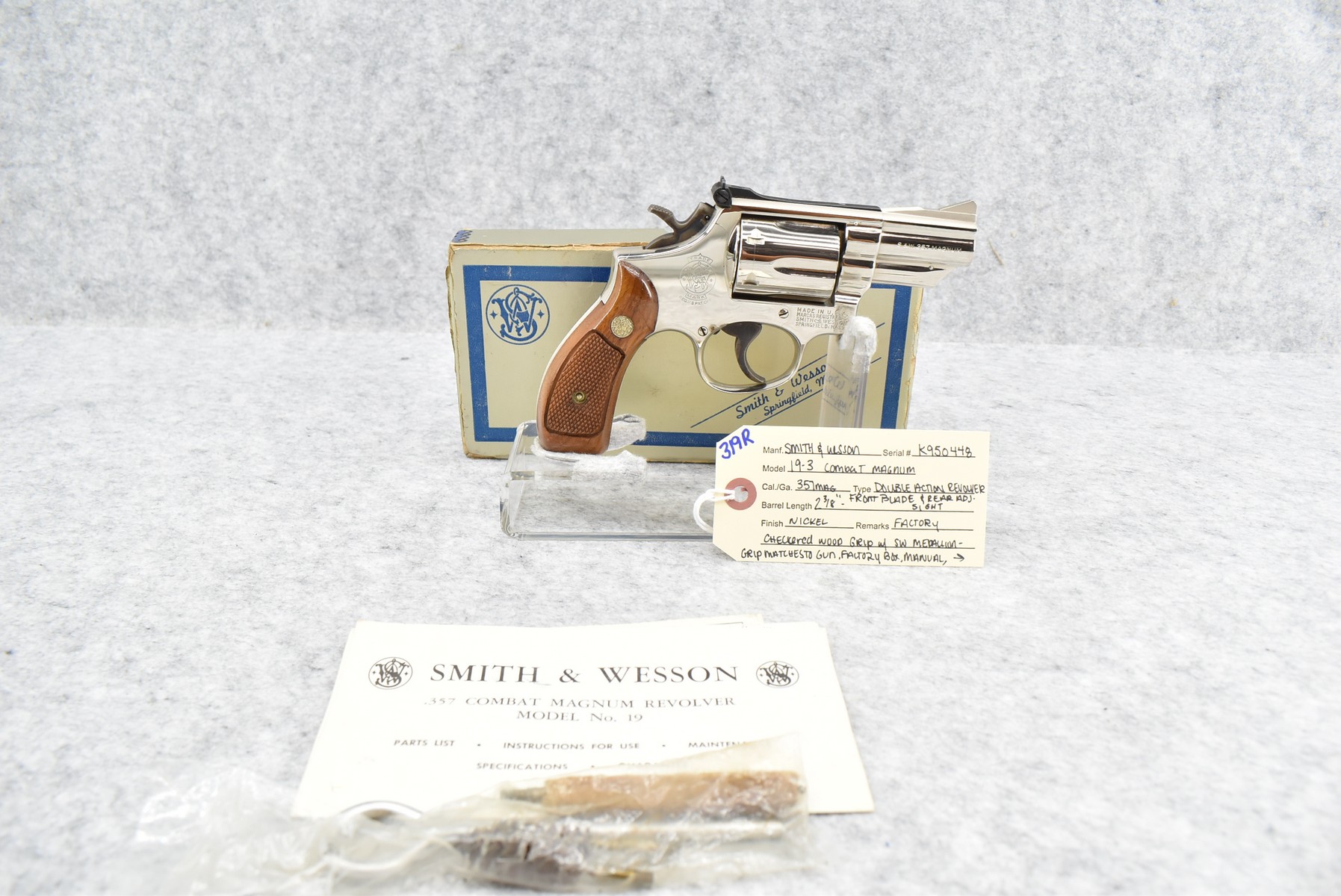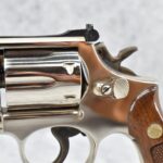 319R. Smith & Wesson – Mod. 19-3 Combat Magnum – 357 Mag. Cal. Double Action Revolver – w/2 3/8” Barrel w/Front Blade & Rear Adj. Sight – Nickel Finish – w/Factory Checkered Wood Grips w/S&W Medallion – Grip Numbers to Gun – w/Factory Box, Manual & Cleaning Kit