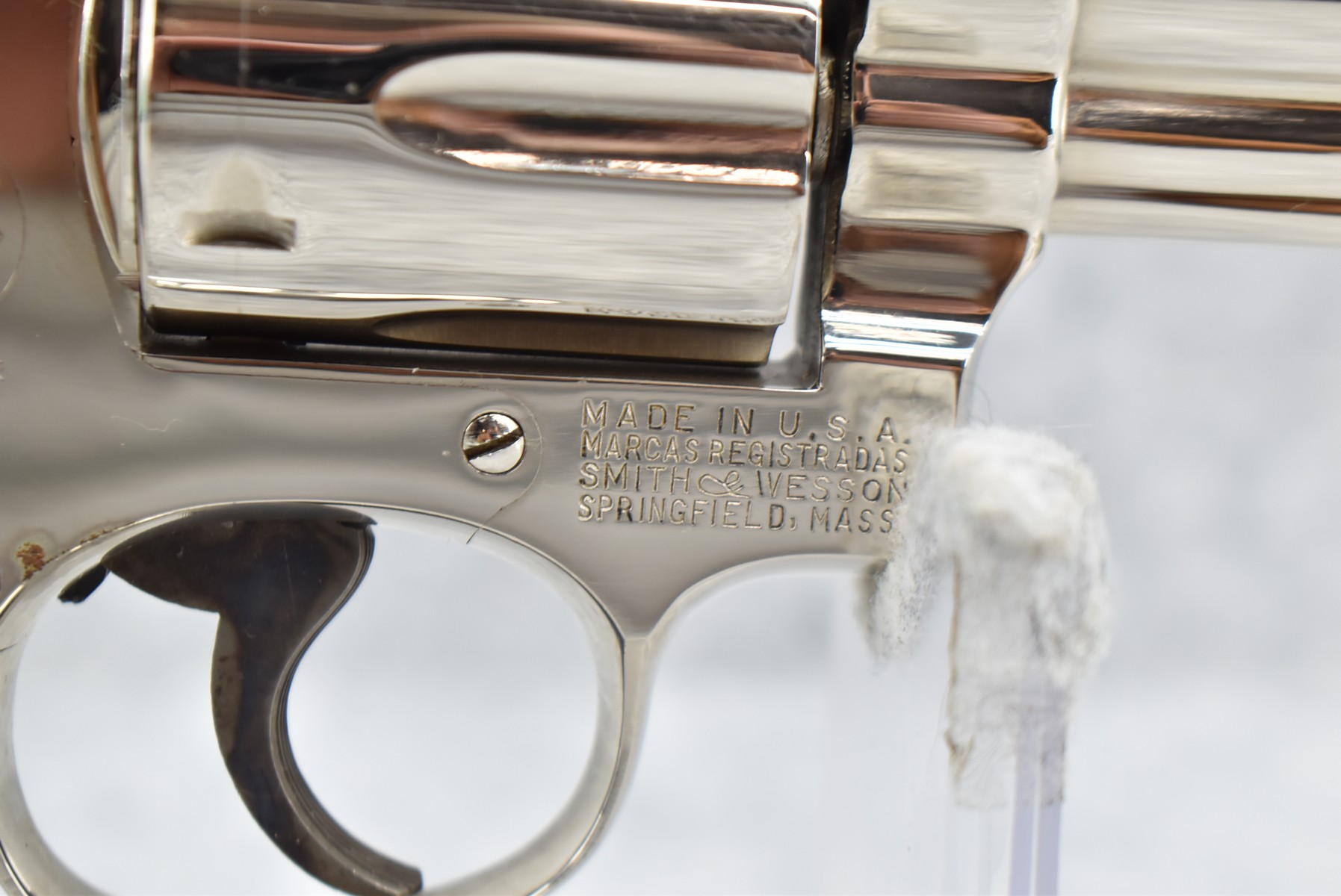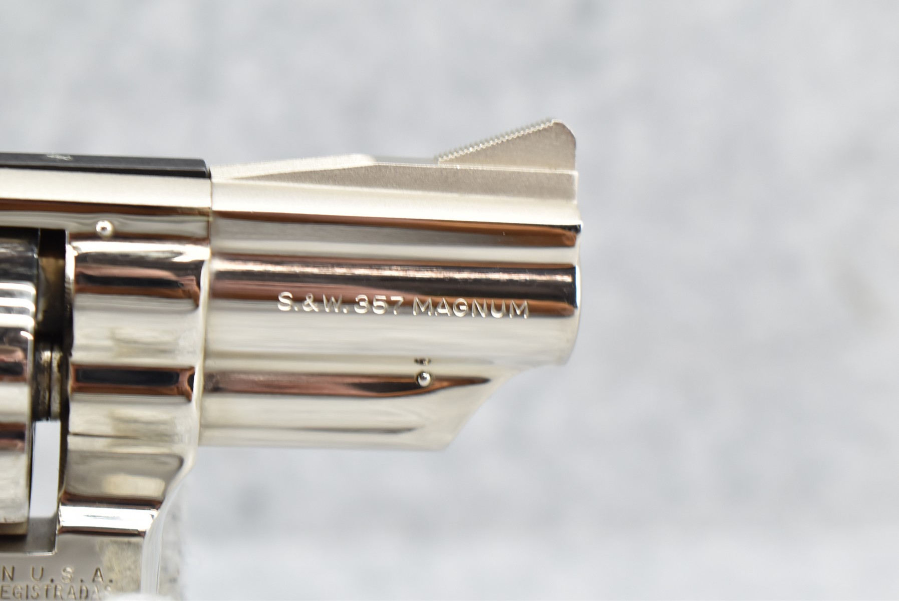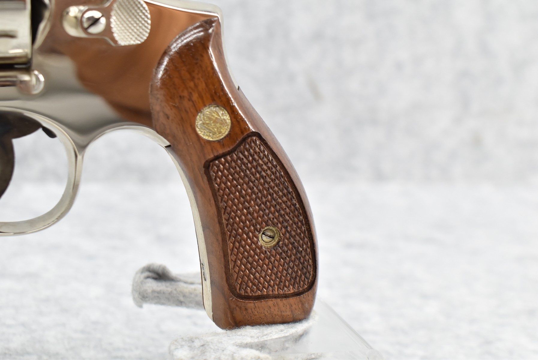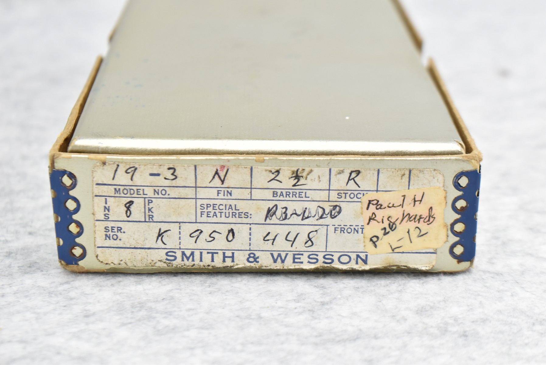 319R. Smith & Wesson – Mod. 19-3 Combat Magnum – 357 Mag. Cal. Double Action Revolver – w/2 3/8” Barrel w/Front Blade & Rear Adj. Sight – Nickel Finish – w/Factory Checkered Wood Grips w/S&W Medallion – Grip Numbers to Gun – w/Factory Box, Manual & Cleaning Kit