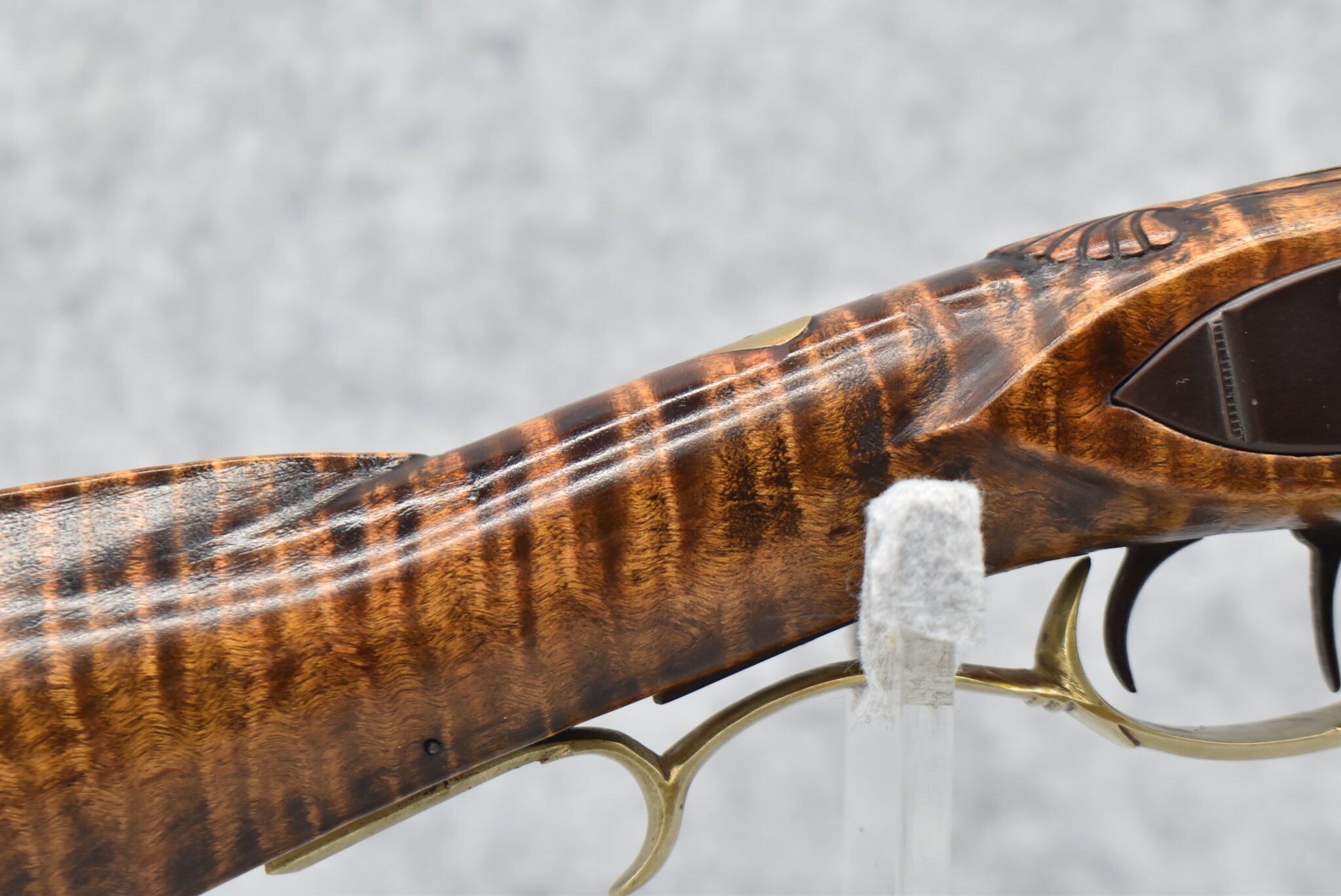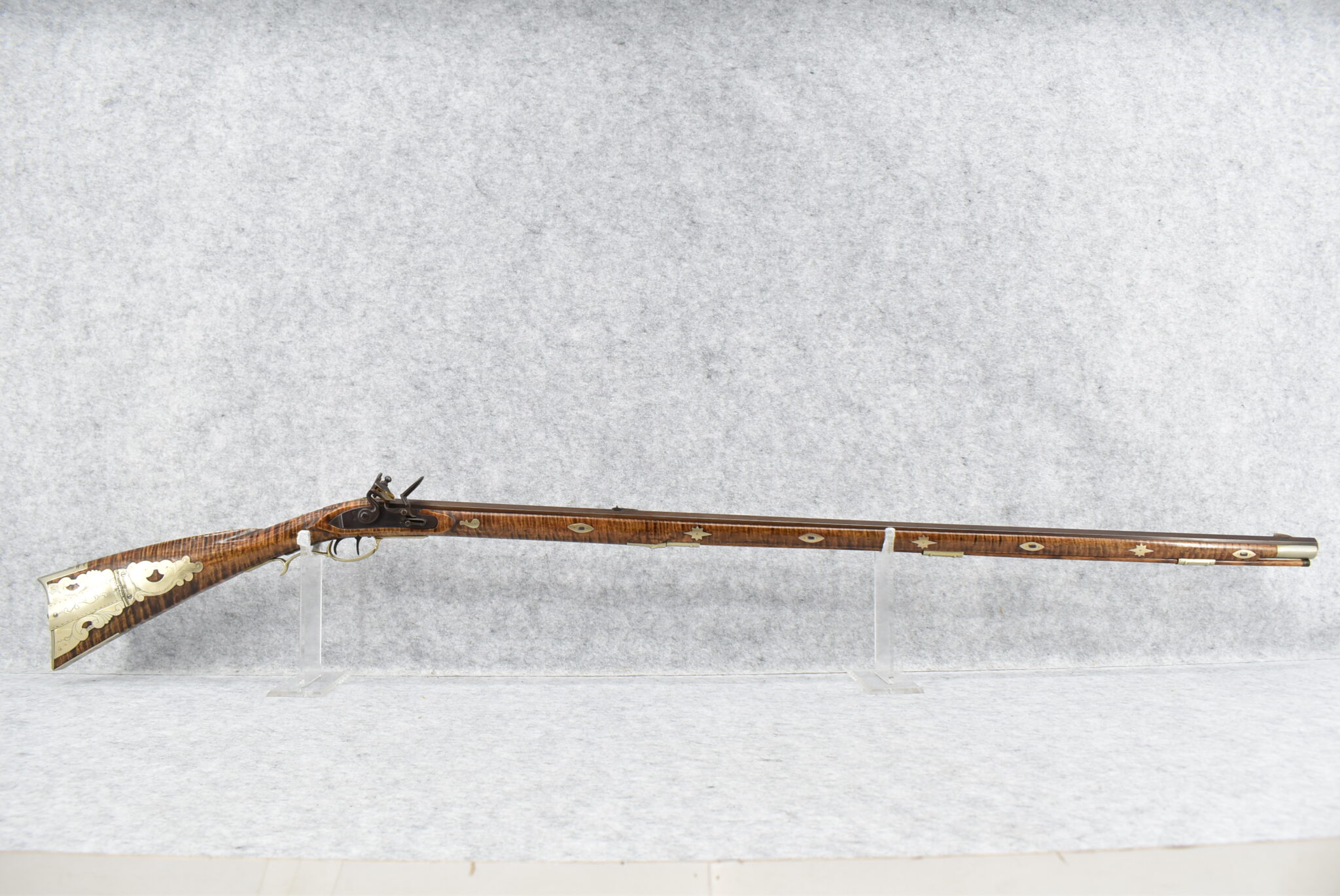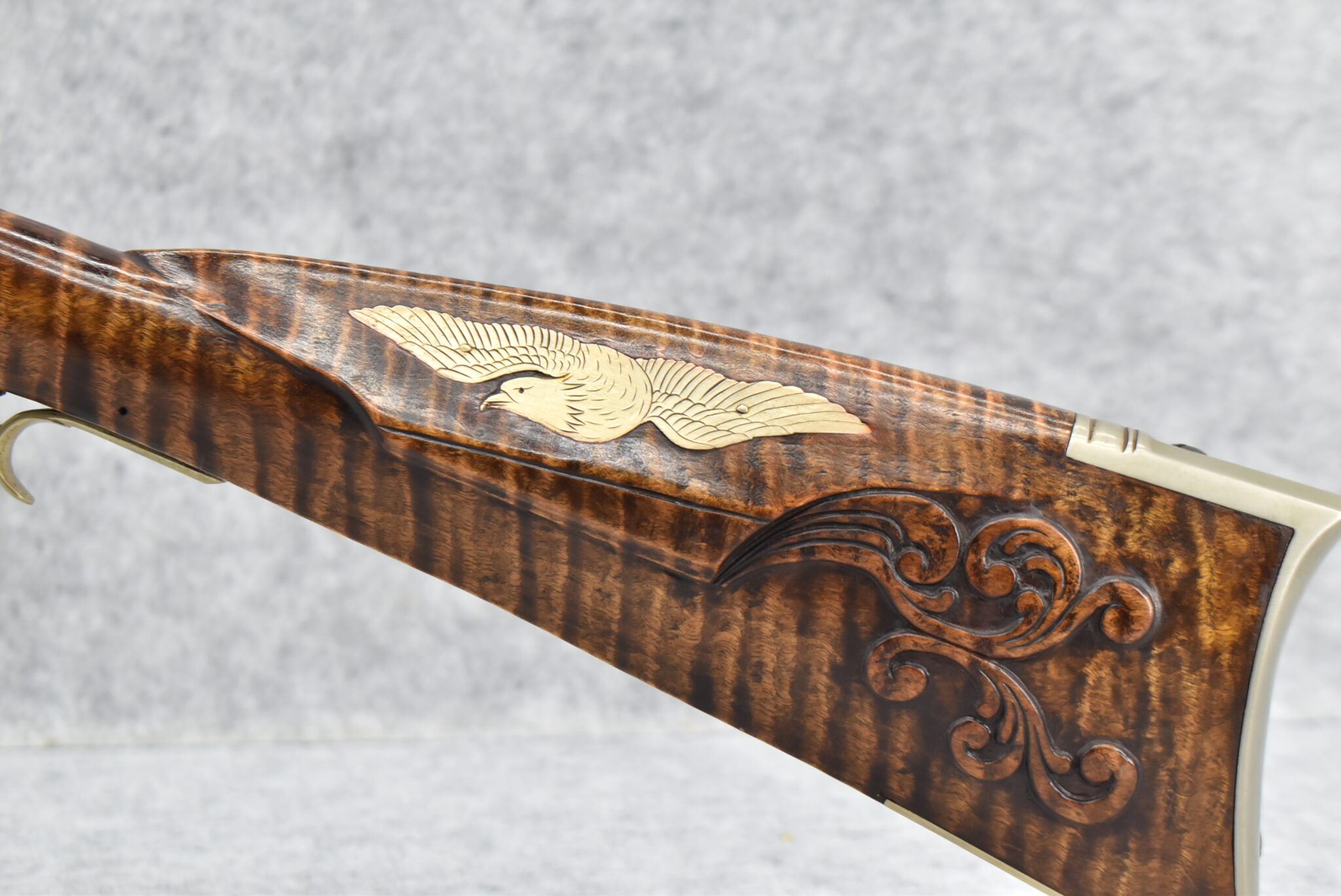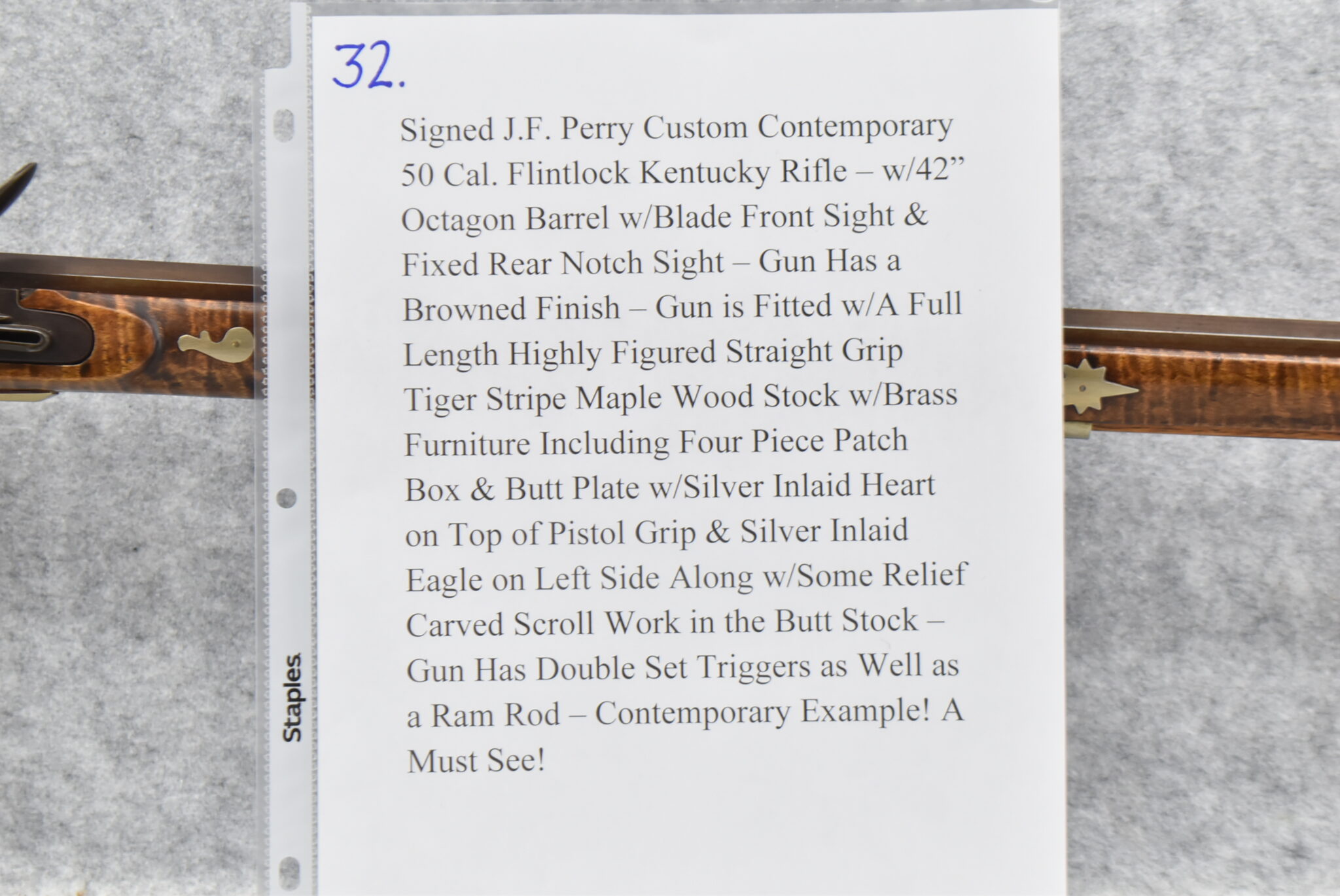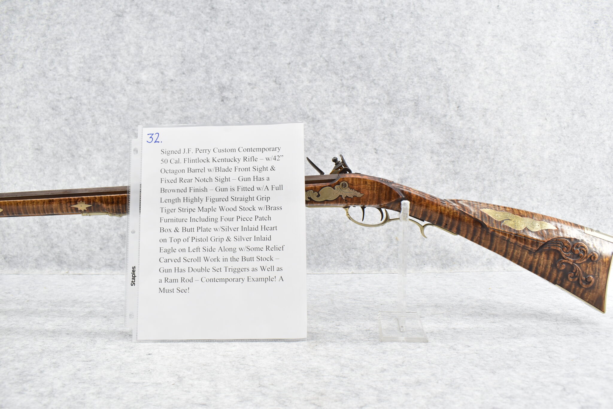 32.          Signed J.F. Perry Custom Contemporary 50 Cal. Flintlock Kentucky Rifle – w/42” Octagon Barrel w/Blade Front Sight & Fixed Rear Notch Sight – Gun Has a Browned Finish – Gun is Fitted w/A Full Length Highly Figured Straight Grip Tiger Stripe Maple Wood Stock w/Brass Furniture Including Four Piece Patch Box & Butt Plate w/Silver Inlaid Heart on Top of Pistol Grip & Silver Inlaid Eagle on Left Side Along w/Some Relief Carved Scroll Work in the Butt Stock – Gun Has Double Set Triggers as Well as a Ram Rod – Contemporary Example! A Must See!
