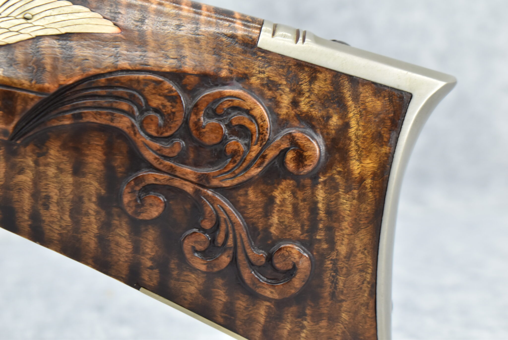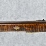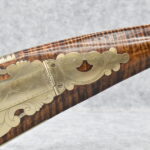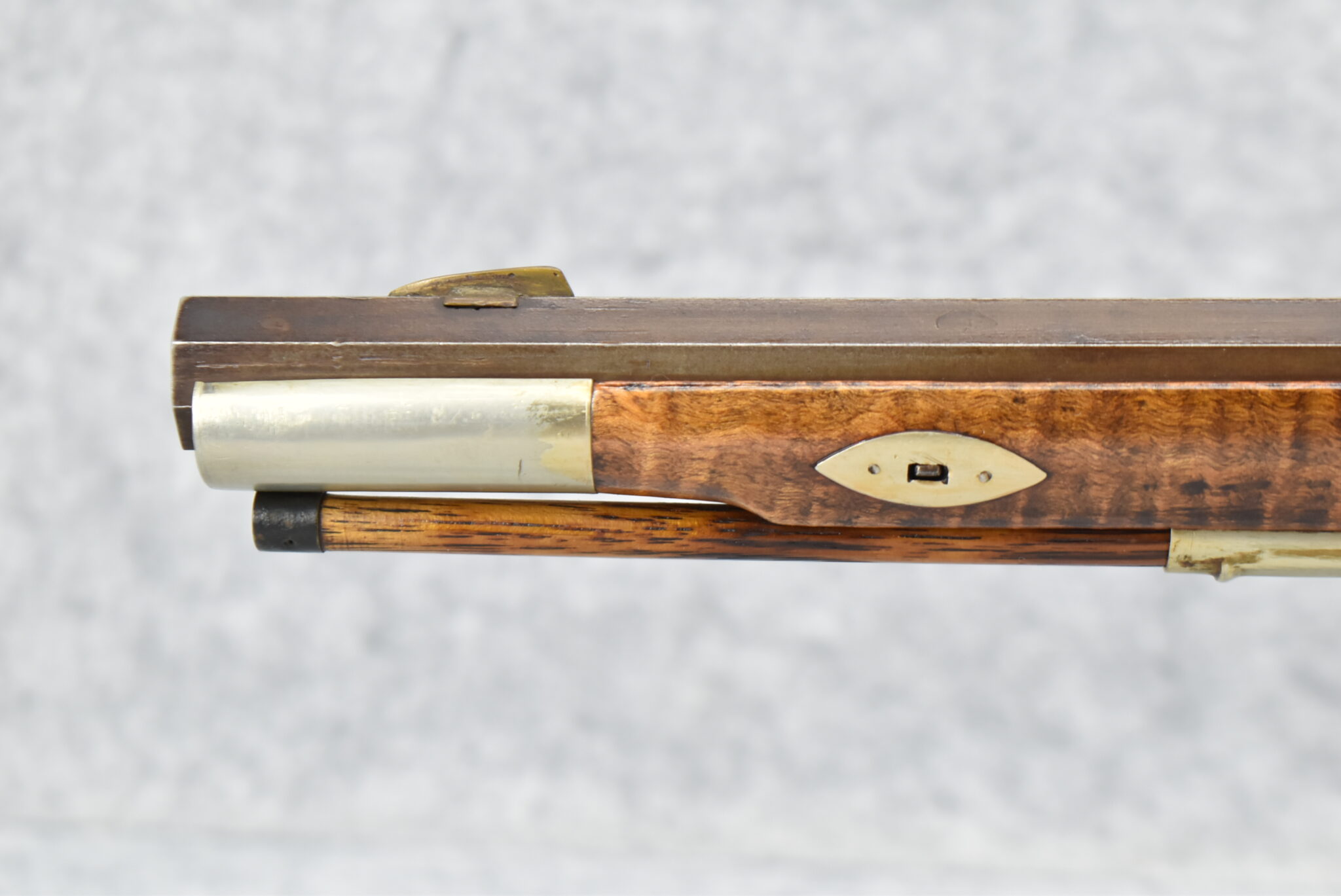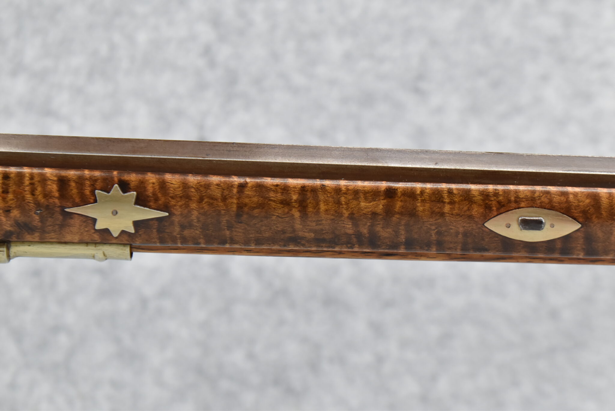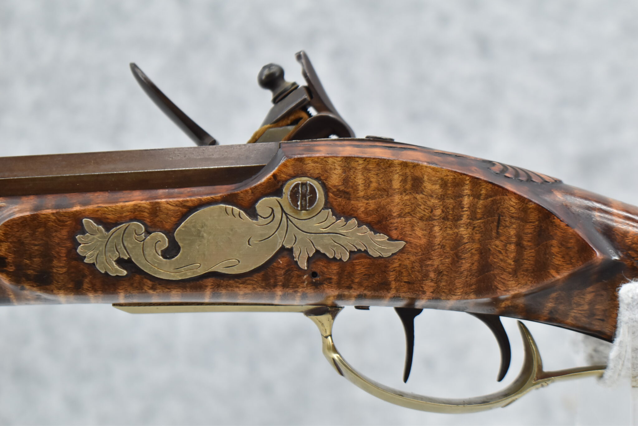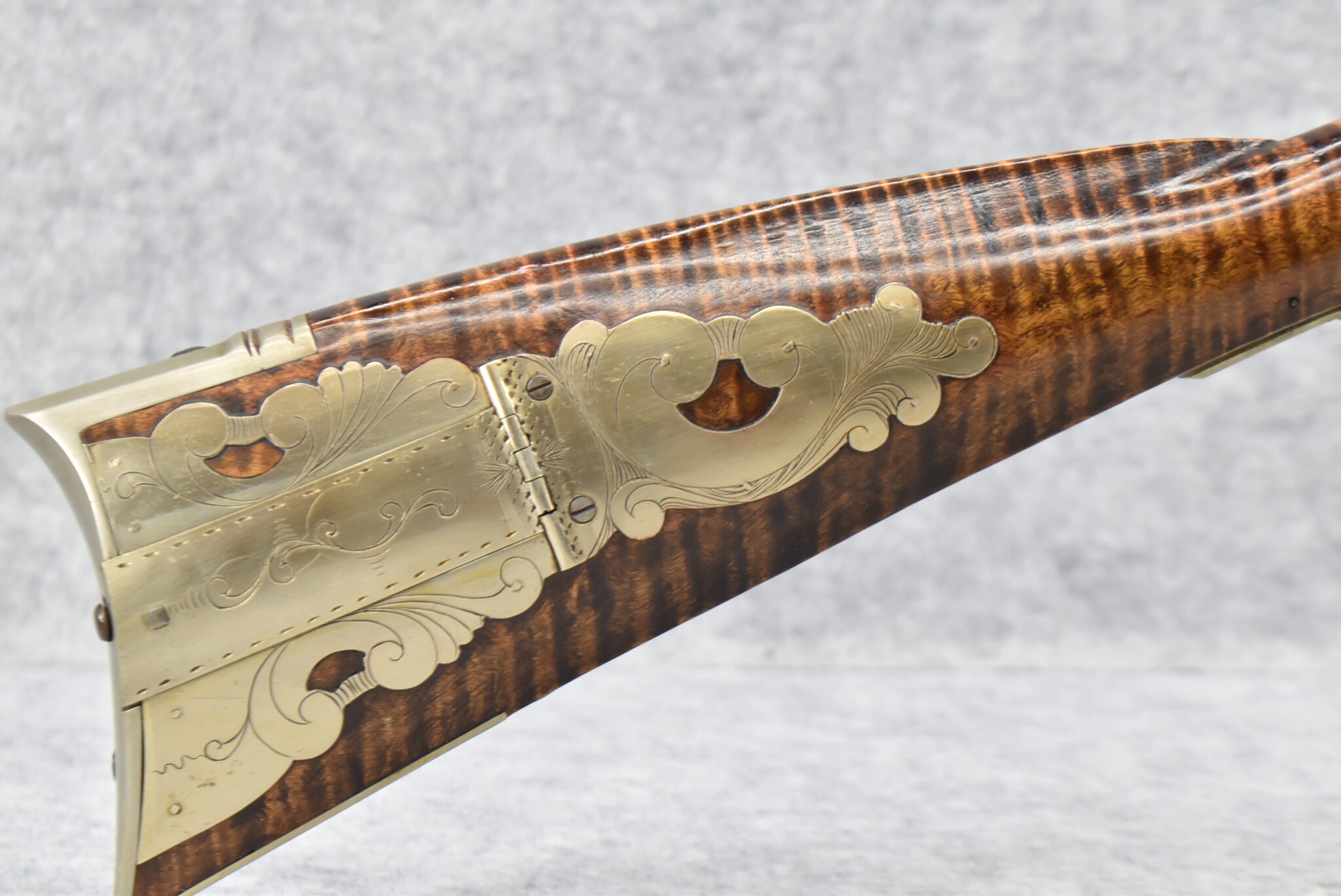 32.          Signed J.F. Perry Custom Contemporary 50 Cal. Flintlock Kentucky Rifle – w/42” Octagon Barrel w/Blade Front Sight & Fixed Rear Notch Sight – Gun Has a Browned Finish – Gun is Fitted w/A Full Length Highly Figured Straight Grip Tiger Stripe Maple Wood Stock w/Brass Furniture Including Four Piece Patch Box & Butt Plate w/Silver Inlaid Heart on Top of Pistol Grip & Silver Inlaid Eagle on Left Side Along w/Some Relief Carved Scroll Work in the Butt Stock – Gun Has Double Set Triggers as Well as a Ram Rod – Contemporary Example! A Must See!