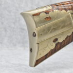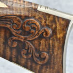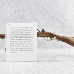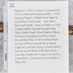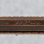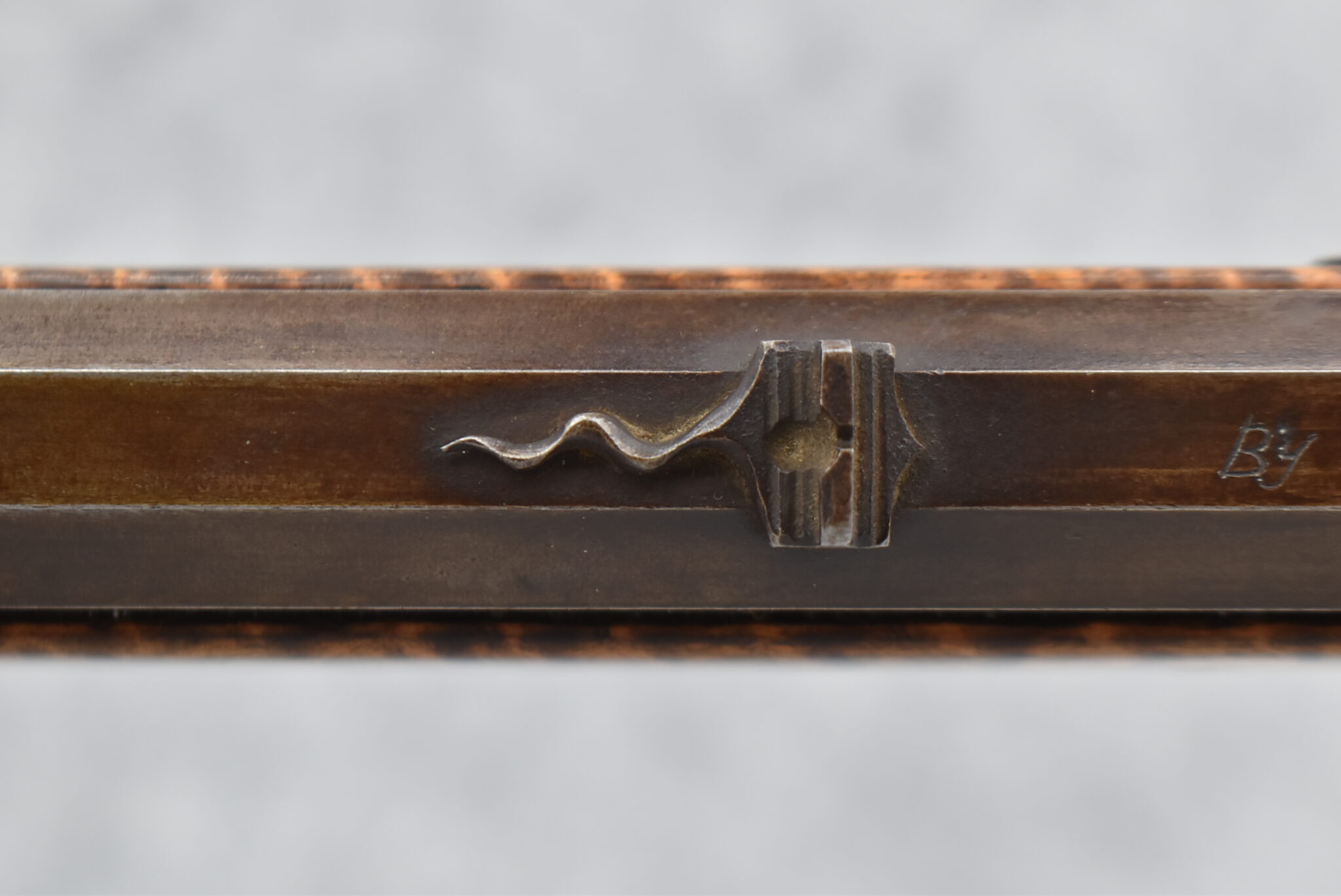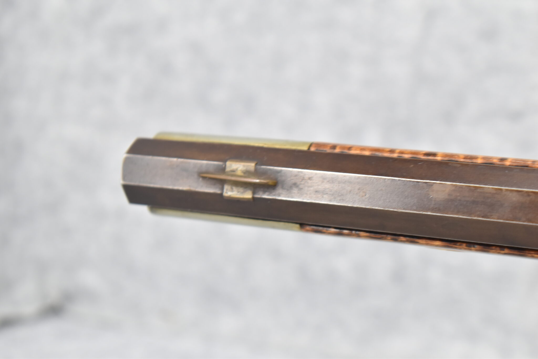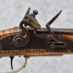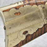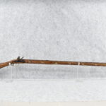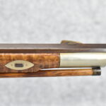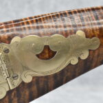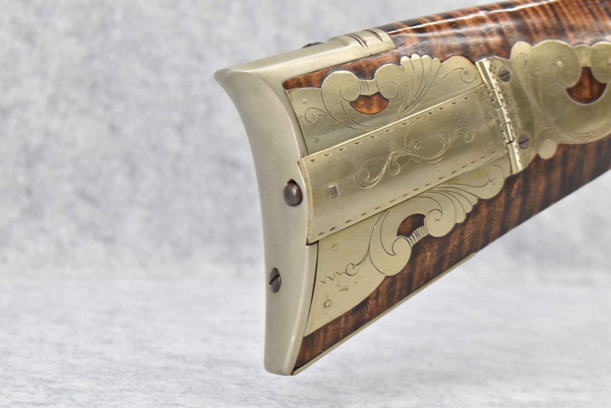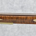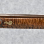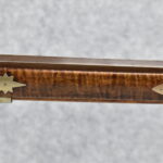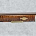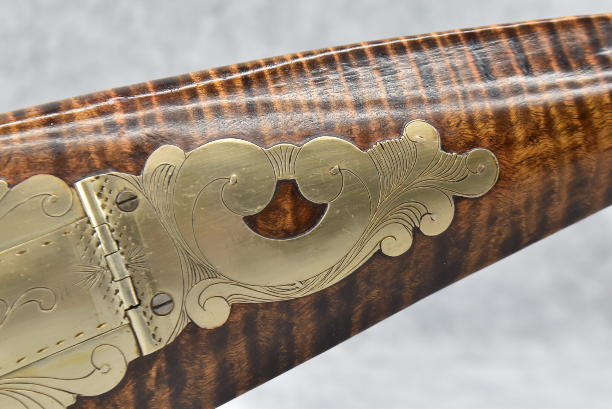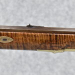 32.          Signed J.F. Perry Custom Contemporary 50 Cal. Flintlock Kentucky Rifle – w/42” Octagon Barrel w/Blade Front Sight & Fixed Rear Notch Sight – Gun Has a Browned Finish – Gun is Fitted w/A Full Length Highly Figured Straight Grip Tiger Stripe Maple Wood Stock w/Brass Furniture Including Four Piece Patch Box & Butt Plate w/Silver Inlaid Heart on Top of Pistol Grip & Silver Inlaid Eagle on Left Side Along w/Some Relief Carved Scroll Work in the Butt Stock – Gun Has Double Set Triggers as Well as a Ram Rod – Contemporary Example! A Must See!