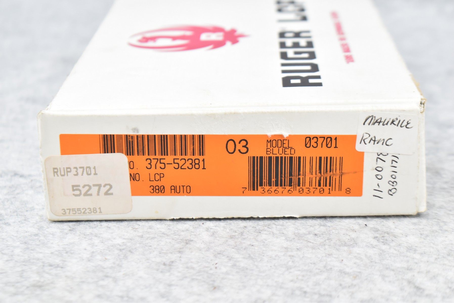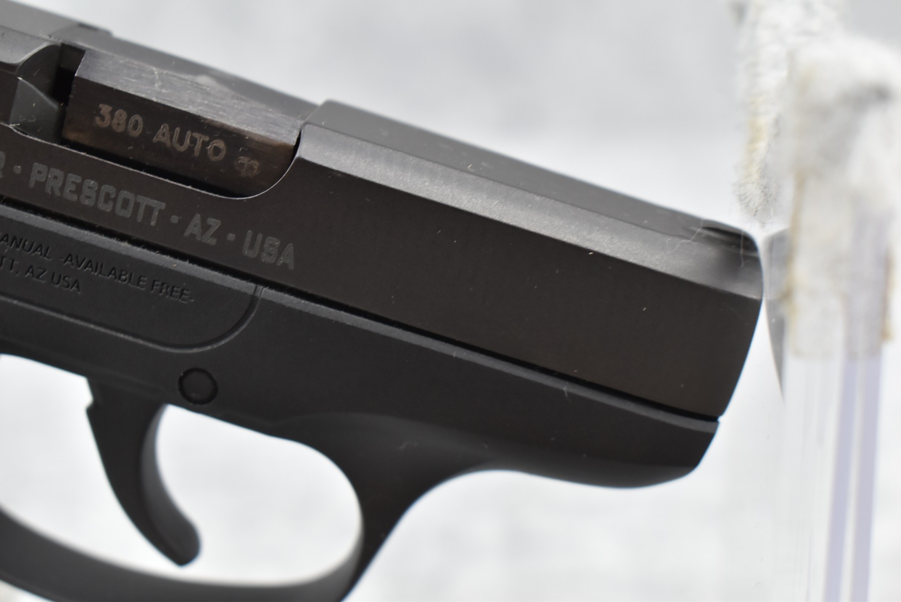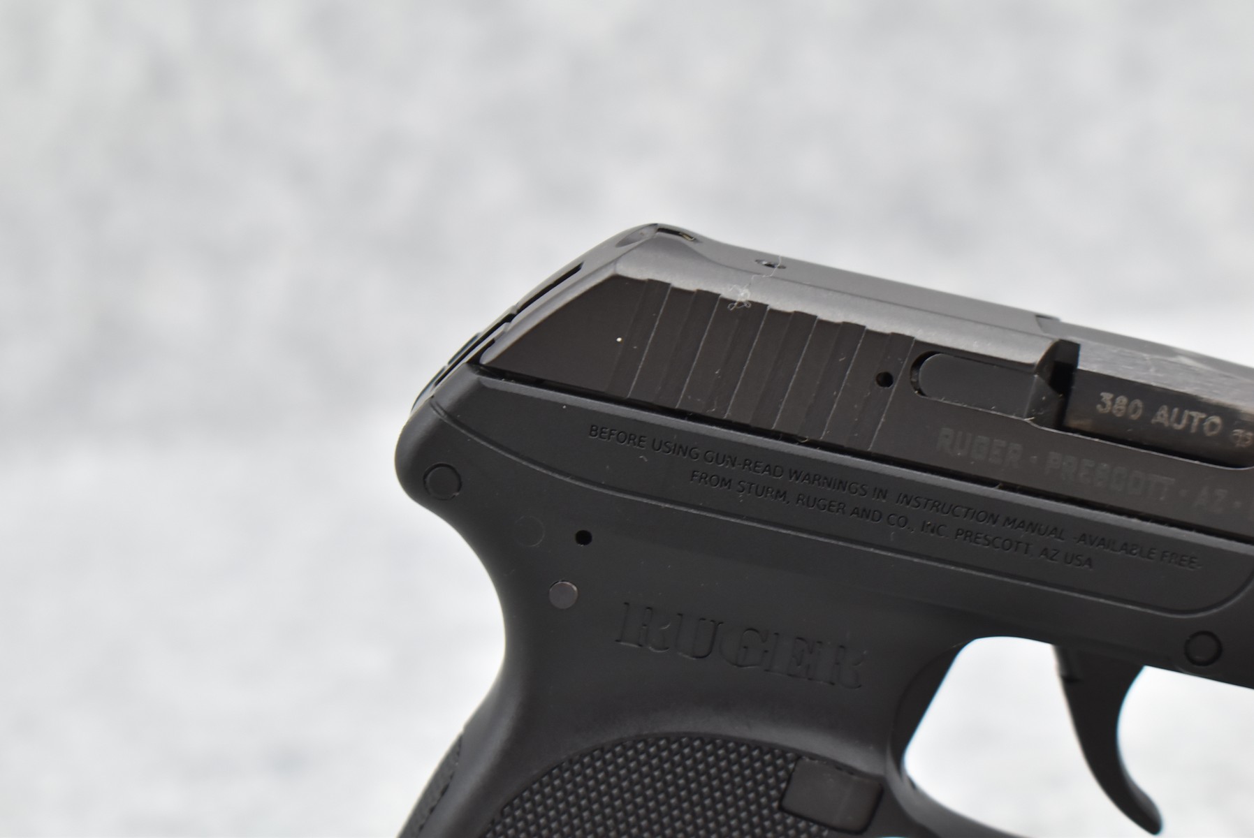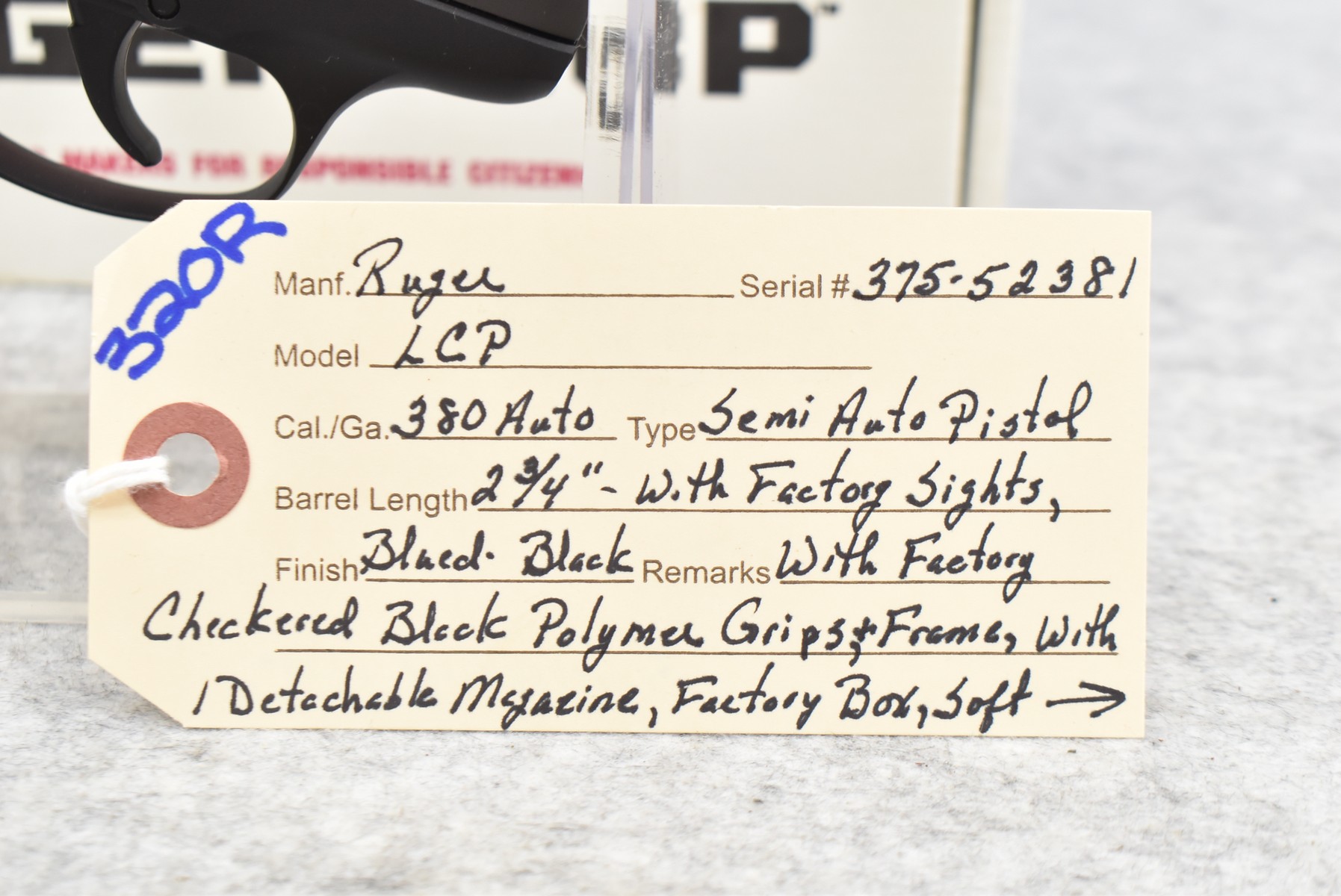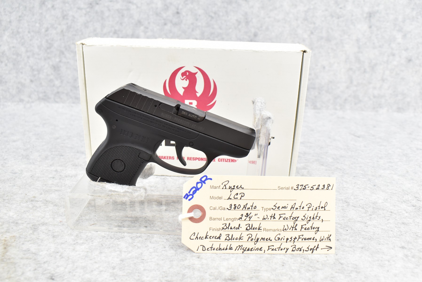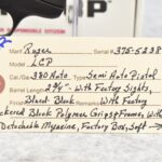 320R. Ruger – Mod. LCP – 380 Auto Cal. Semi-Auto Pistol – w/2 ¾” Barrel w/Factory Sights – Blued Finish – w/Factory Checkered Black Polymer Grips & Frame – w/Detachable Magazine – As New w/Factory Box, Soft Case & Accessories