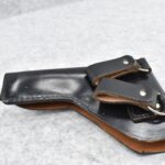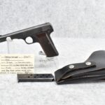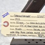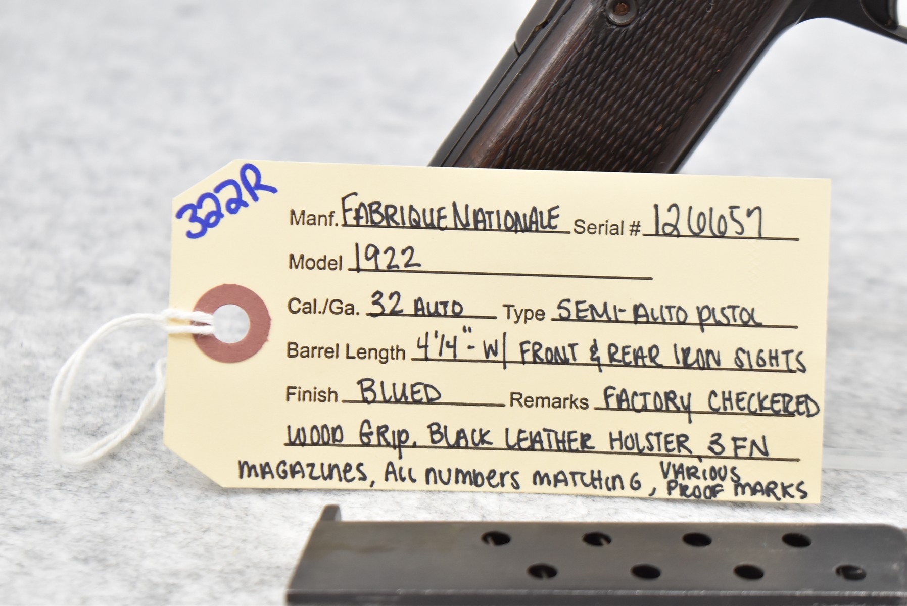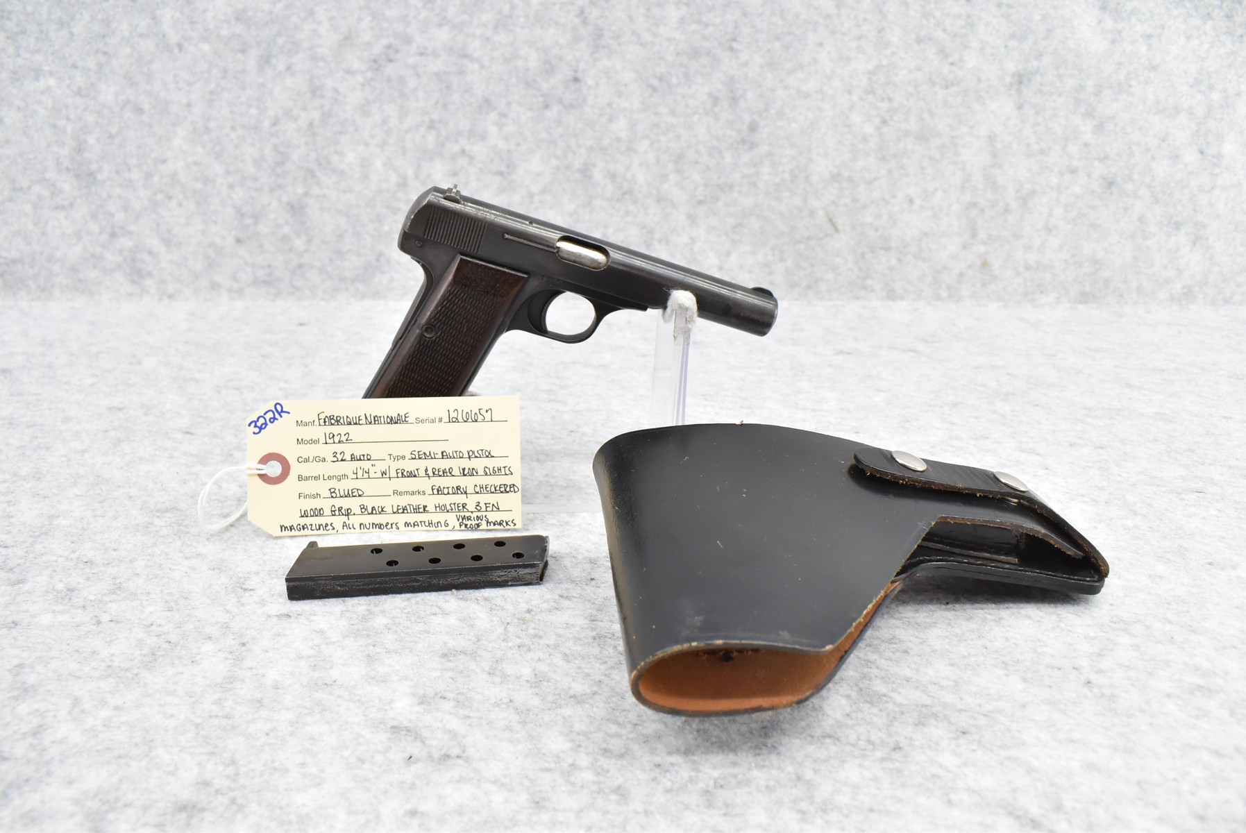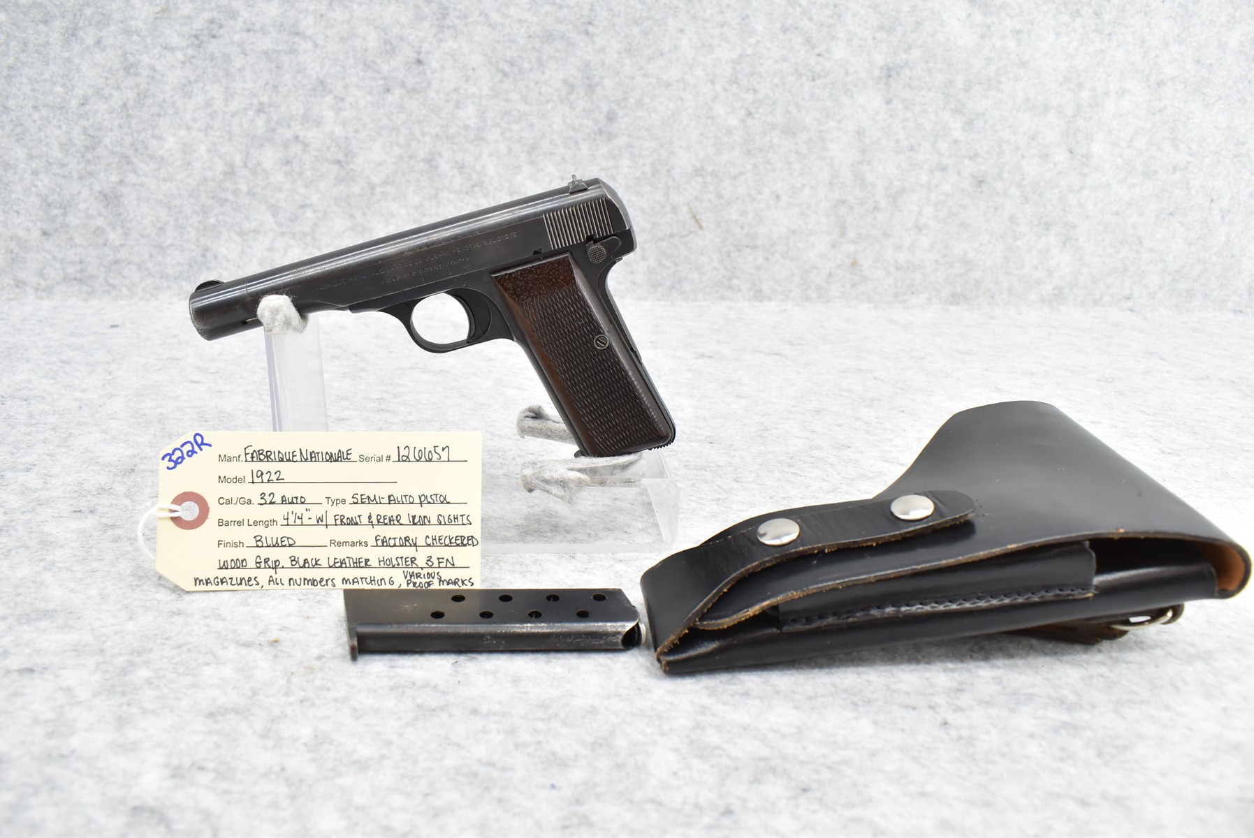 322R.     Fabrique Nationale – Mod. 1922 – 32 Auto Cal. Semi-Auto Pistol – w /4 ¼” Barrel w/Front & Rear Iron Sights – Blued Finish – w/Factory Checked Wood Grip – w/3 FN Magazines – w/Various German Proof Marks – All Numbers Matching – w/Black Leather Holster