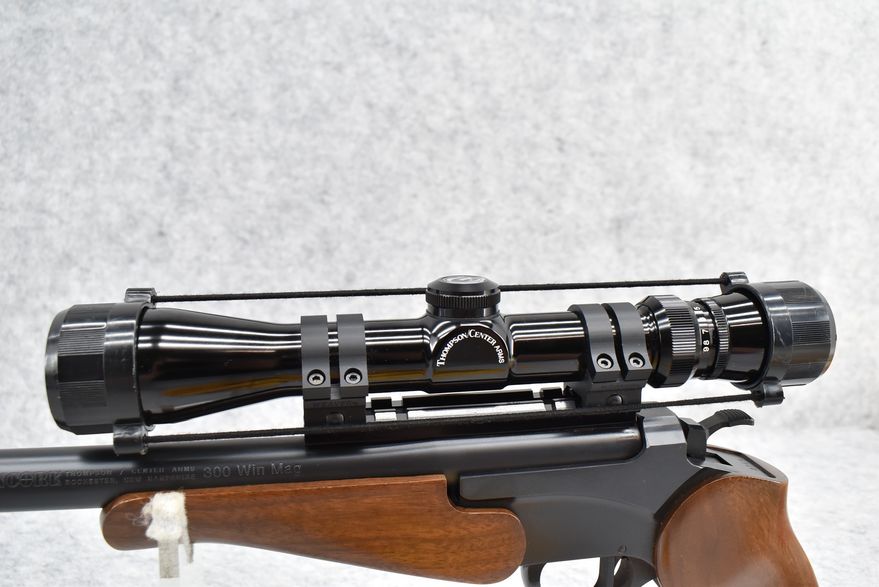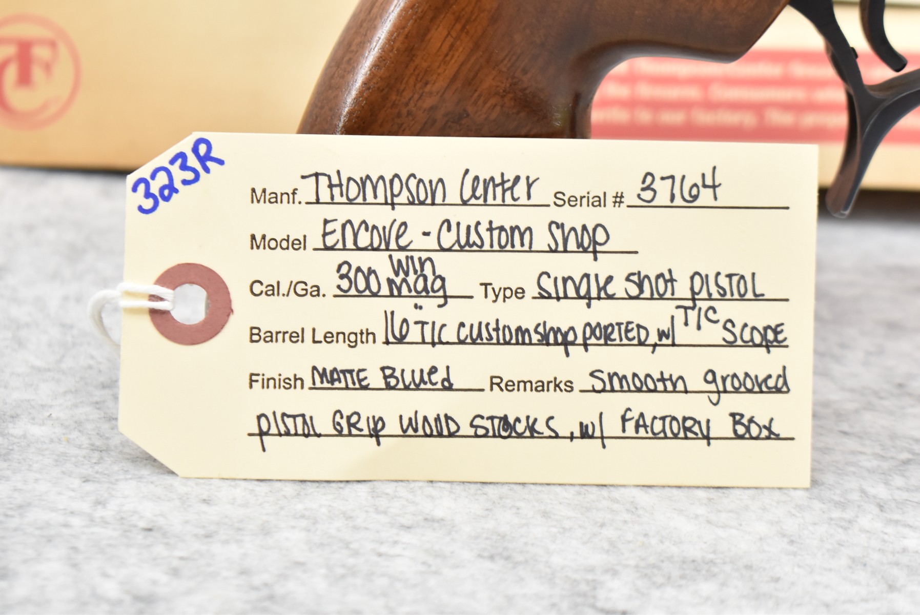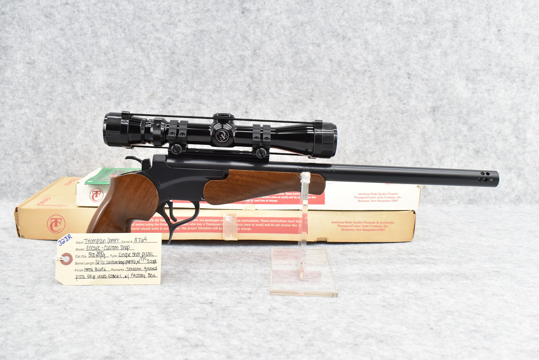 323R. Thompson Center – Mod. Encore – 300 Win. Mag. Cal. Single Shot Pistol – w/16” Thompson Center Custom Shop Ported Barrel – Matte Blued Finish – w/Smooth Grooved Pistol Grip Wood & Rubber Stocks – w/Thompson Center Scope – w/Factory Boxes & Manual