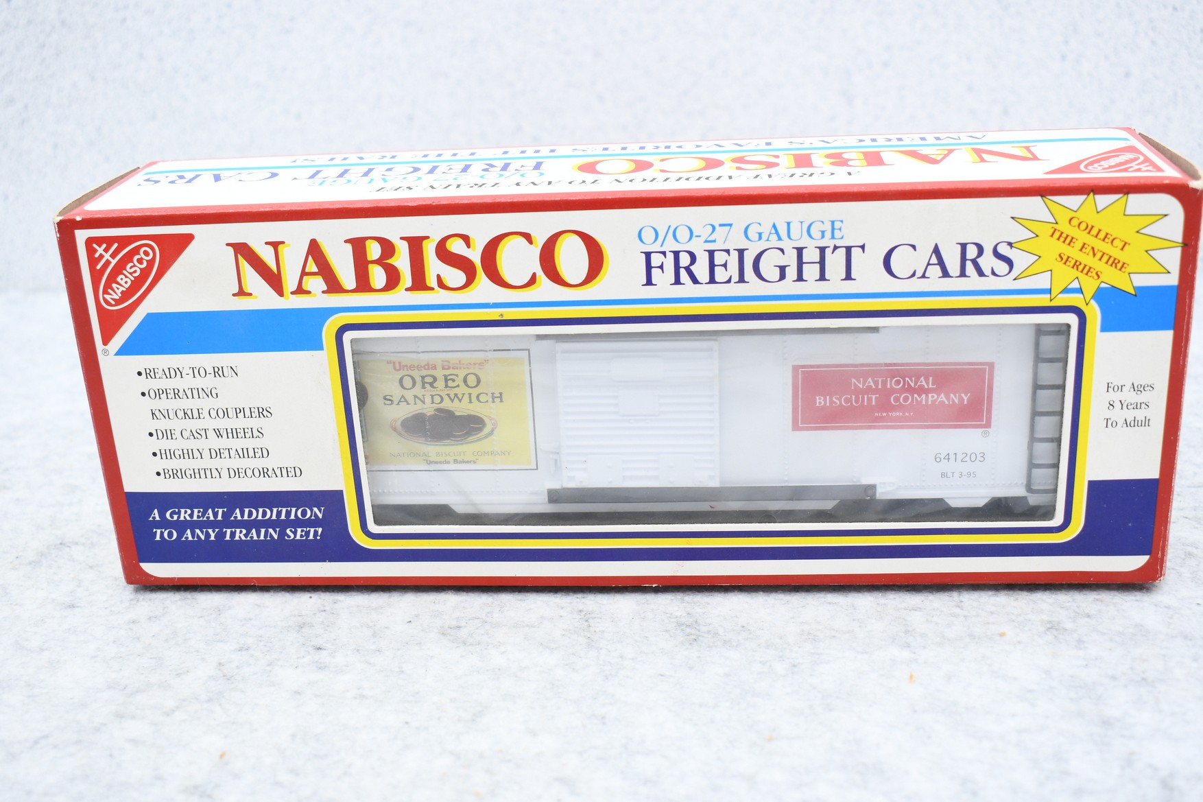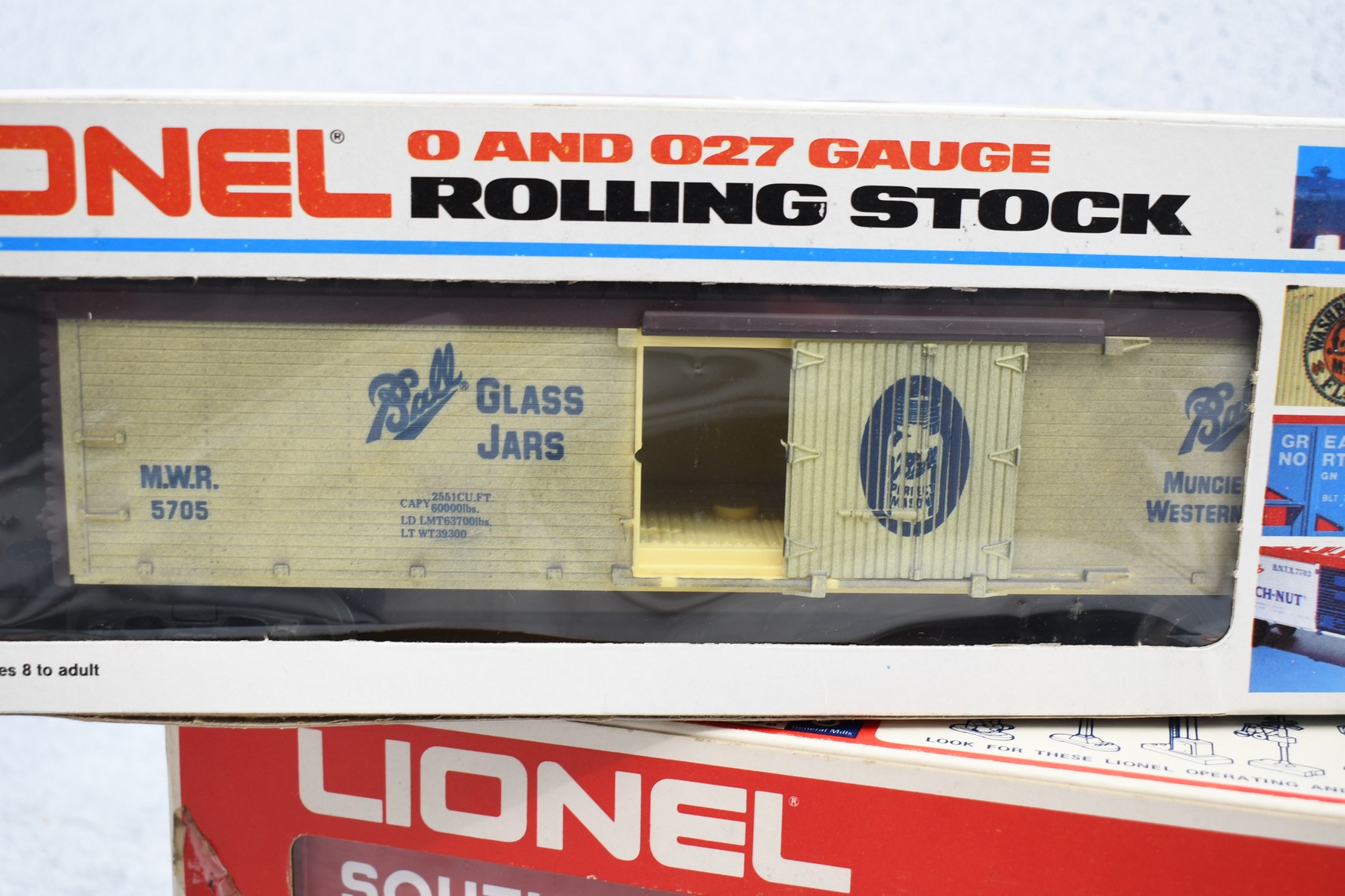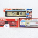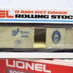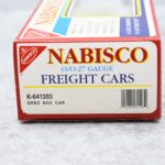 324. Lot of 3 O gauge train cars including K-Line Nabisco Oreo boxcar, Lionel 6-9700 Southern boxcar & Lionel 6-5705 Ball Glass Jars reefer. All with boxes