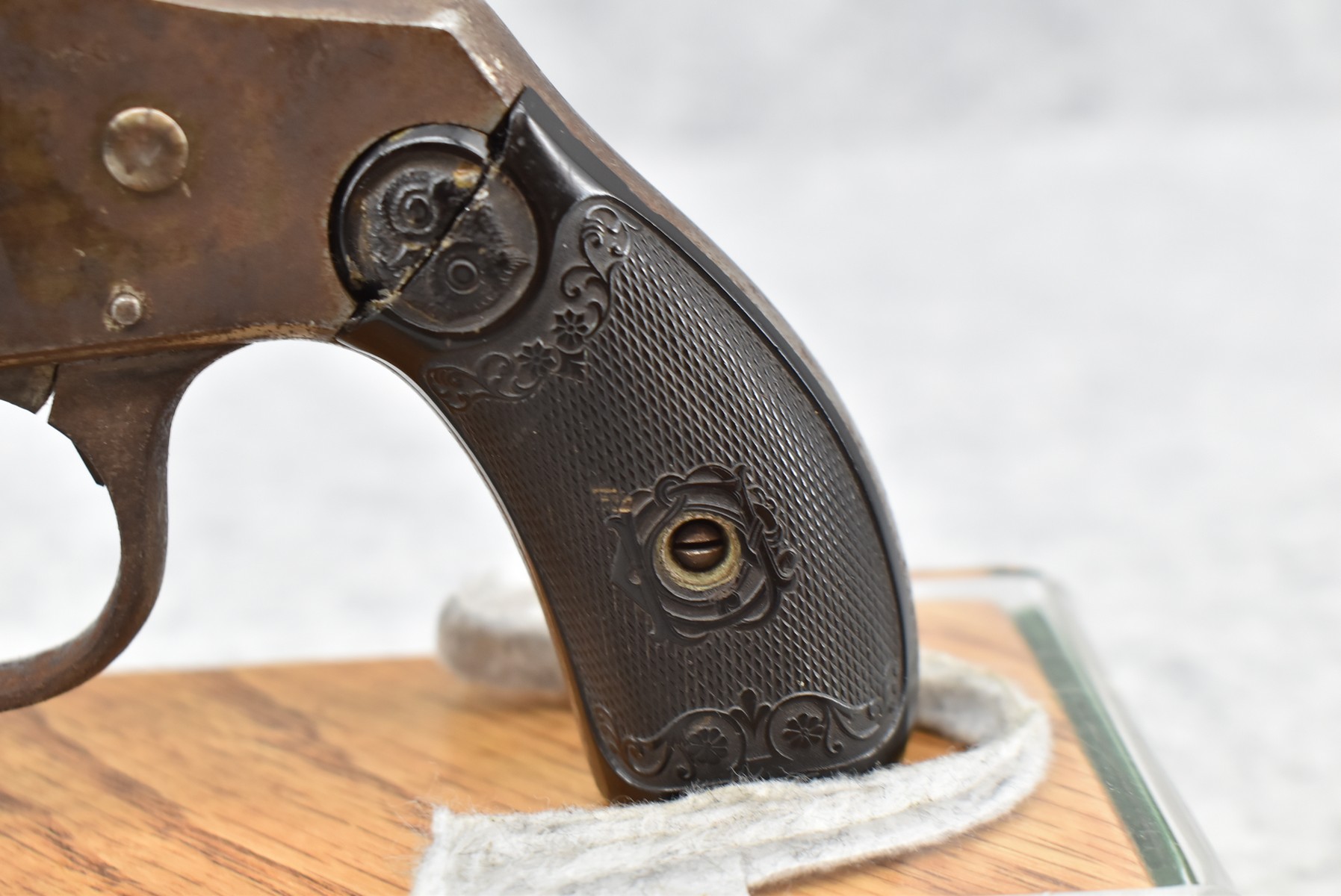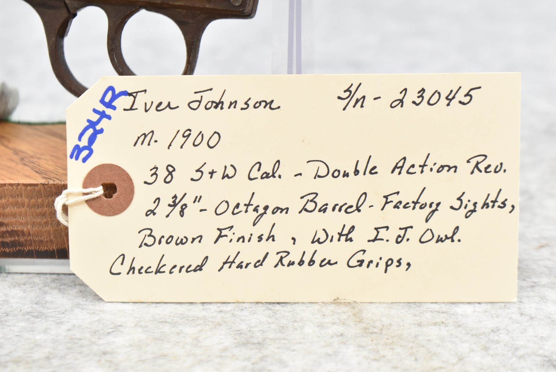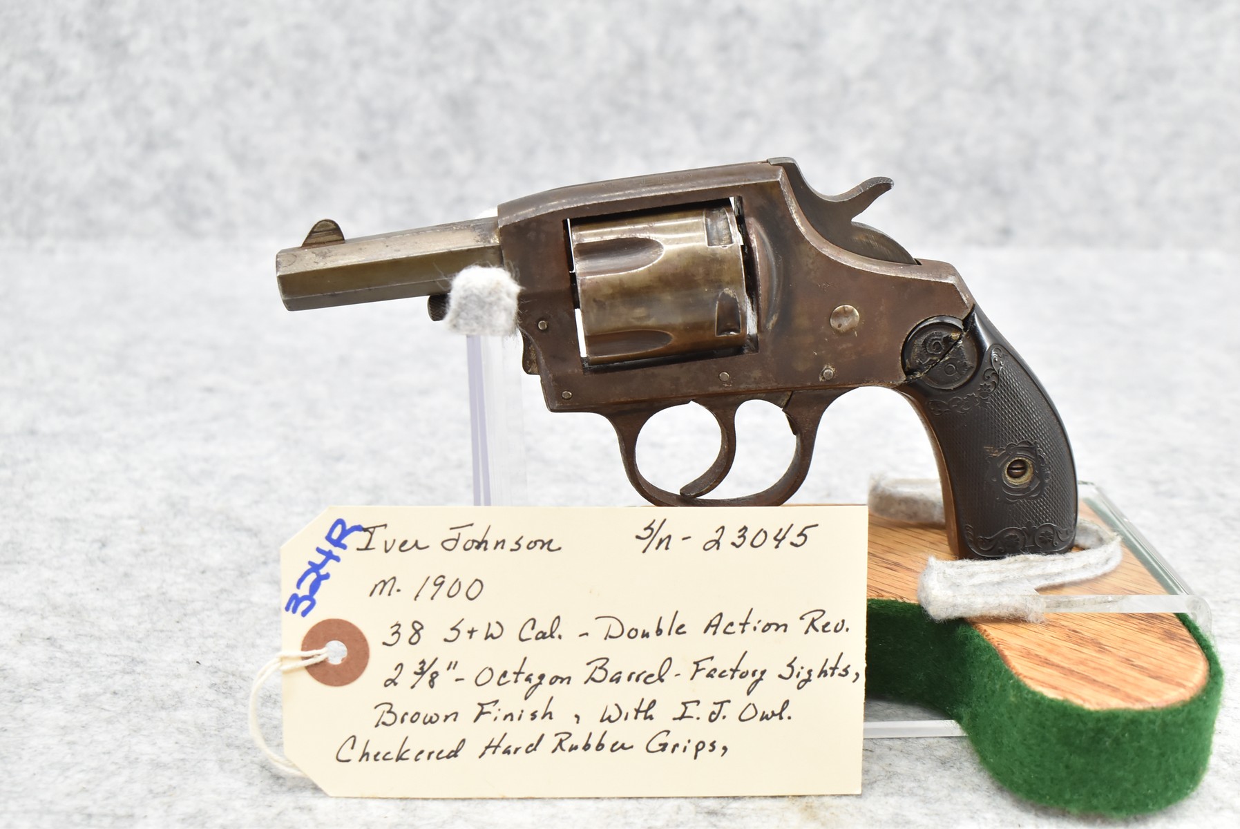 324R. Iver Johnson – Mod. 1900 – 38 S&W Cal. Double Action Revolver – w/2 3/8” Octagon Barrel w/Factory Sights – Brown Finish – w/Iver Johnson Owl Checkered Hard Rubber Grips