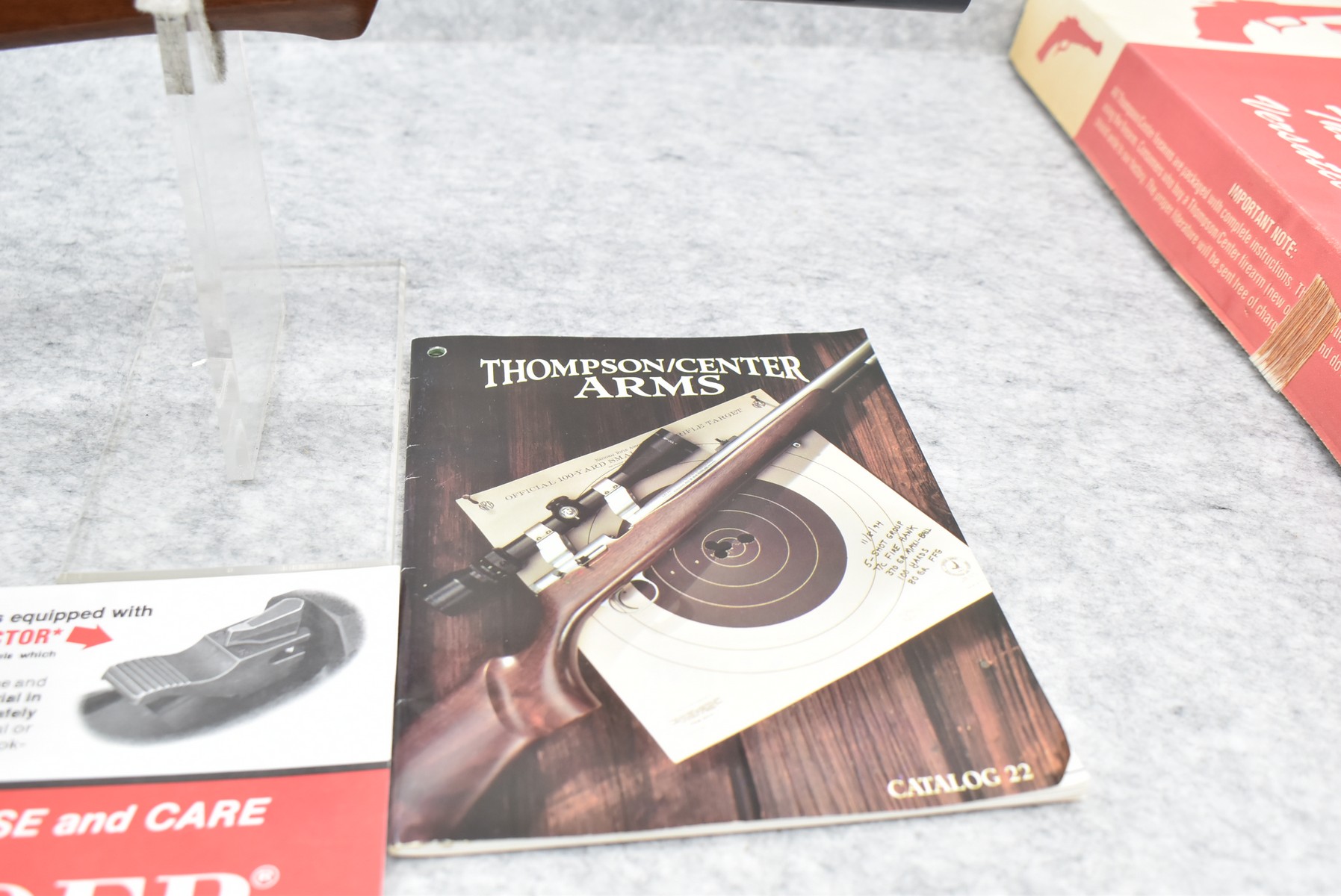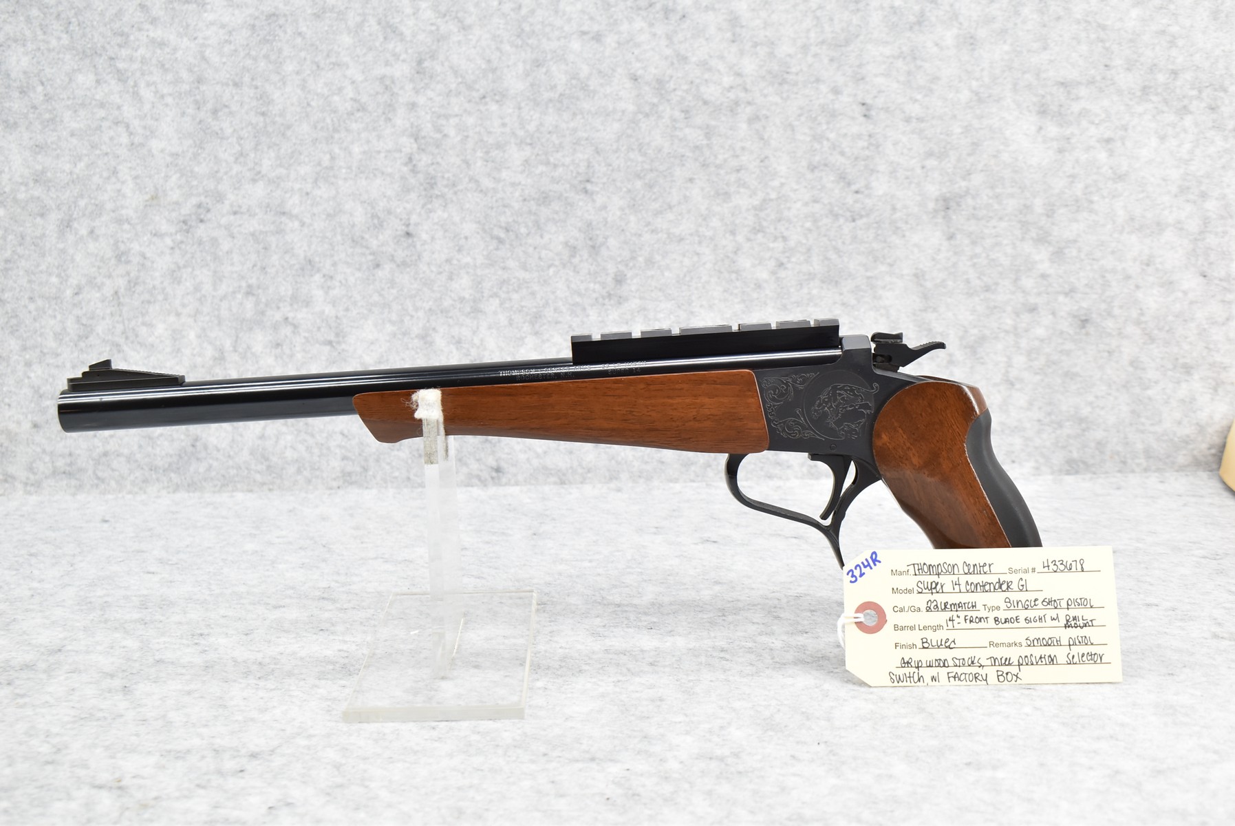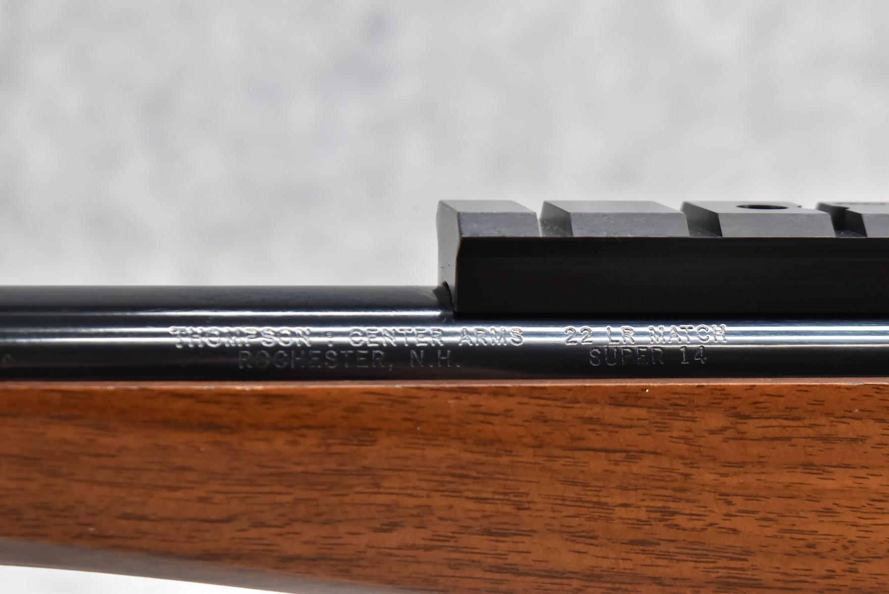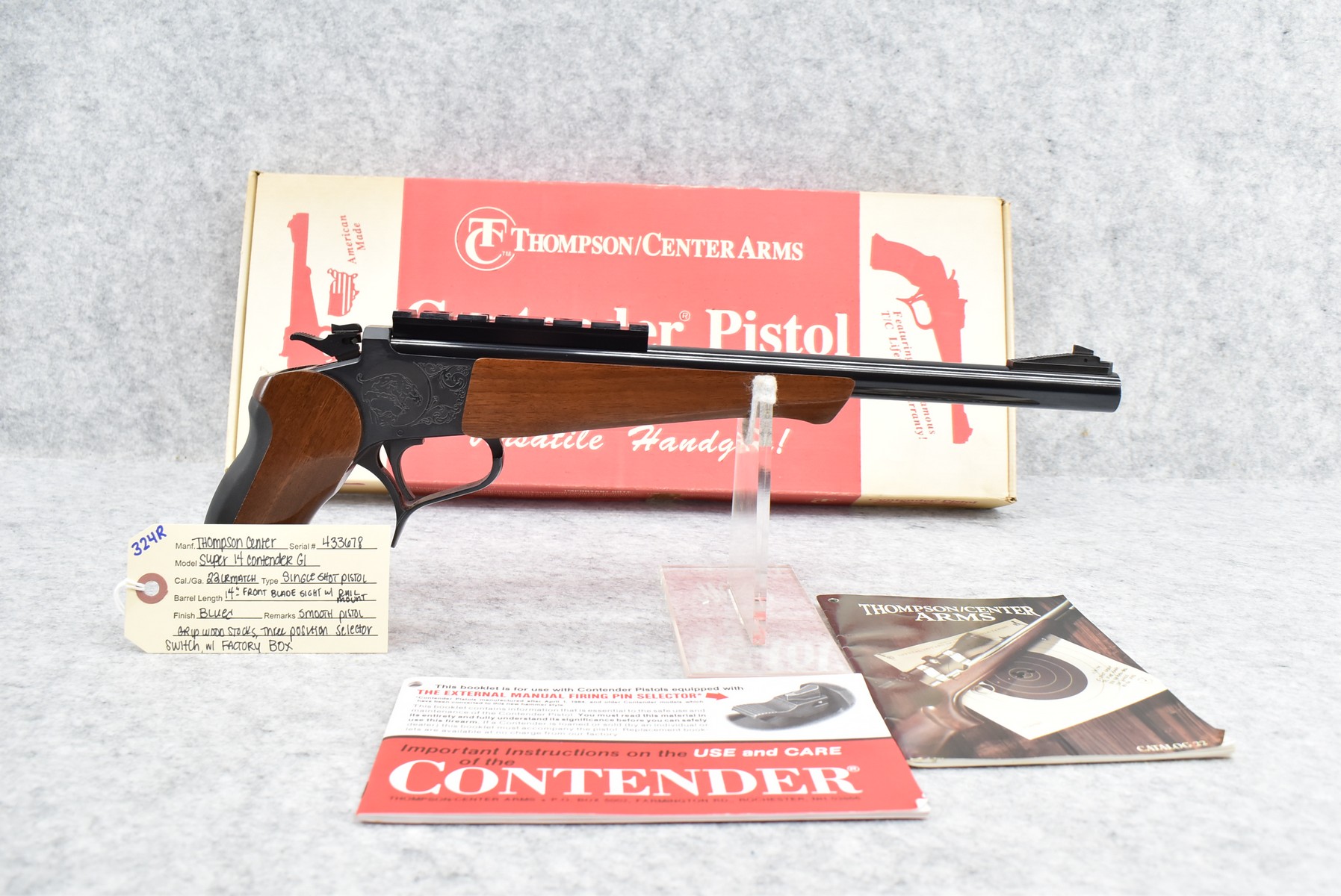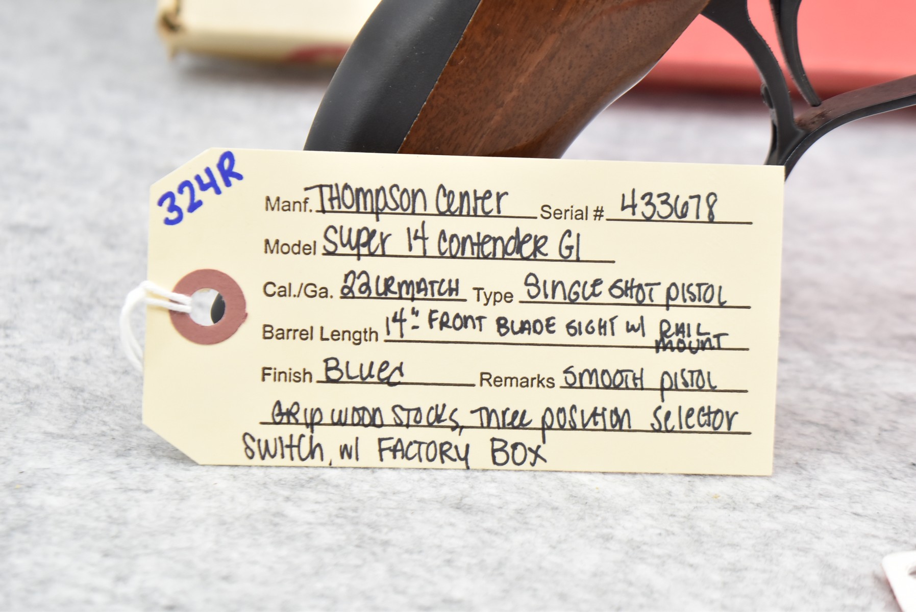 324R. Thompson Center – Mod. Contender – 22LR Match Cal. Single Shot Pistol – w/Super 14” Barrel w/Front Blade Sight – Blued Finish – w/Smooth Pistol Grip Wood Stocks – w/Rail Mount – w/Factory Box & Manual