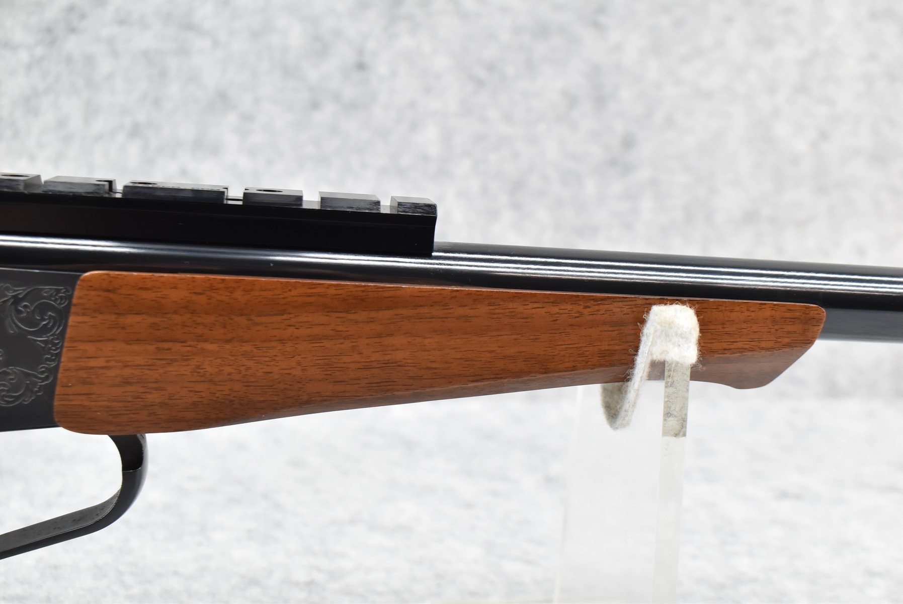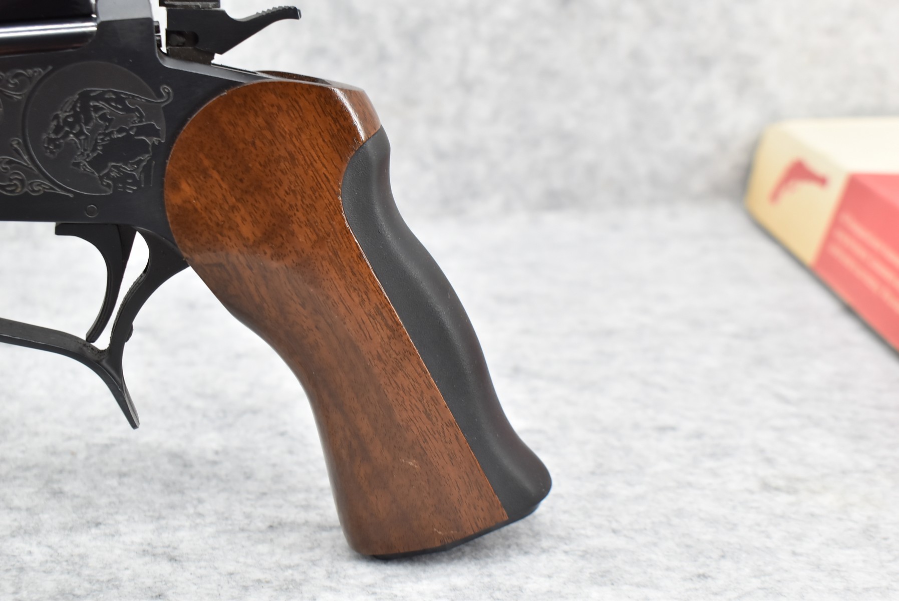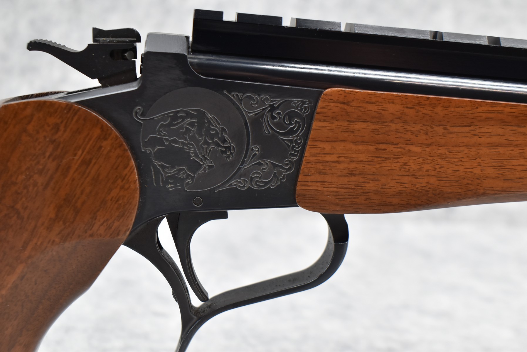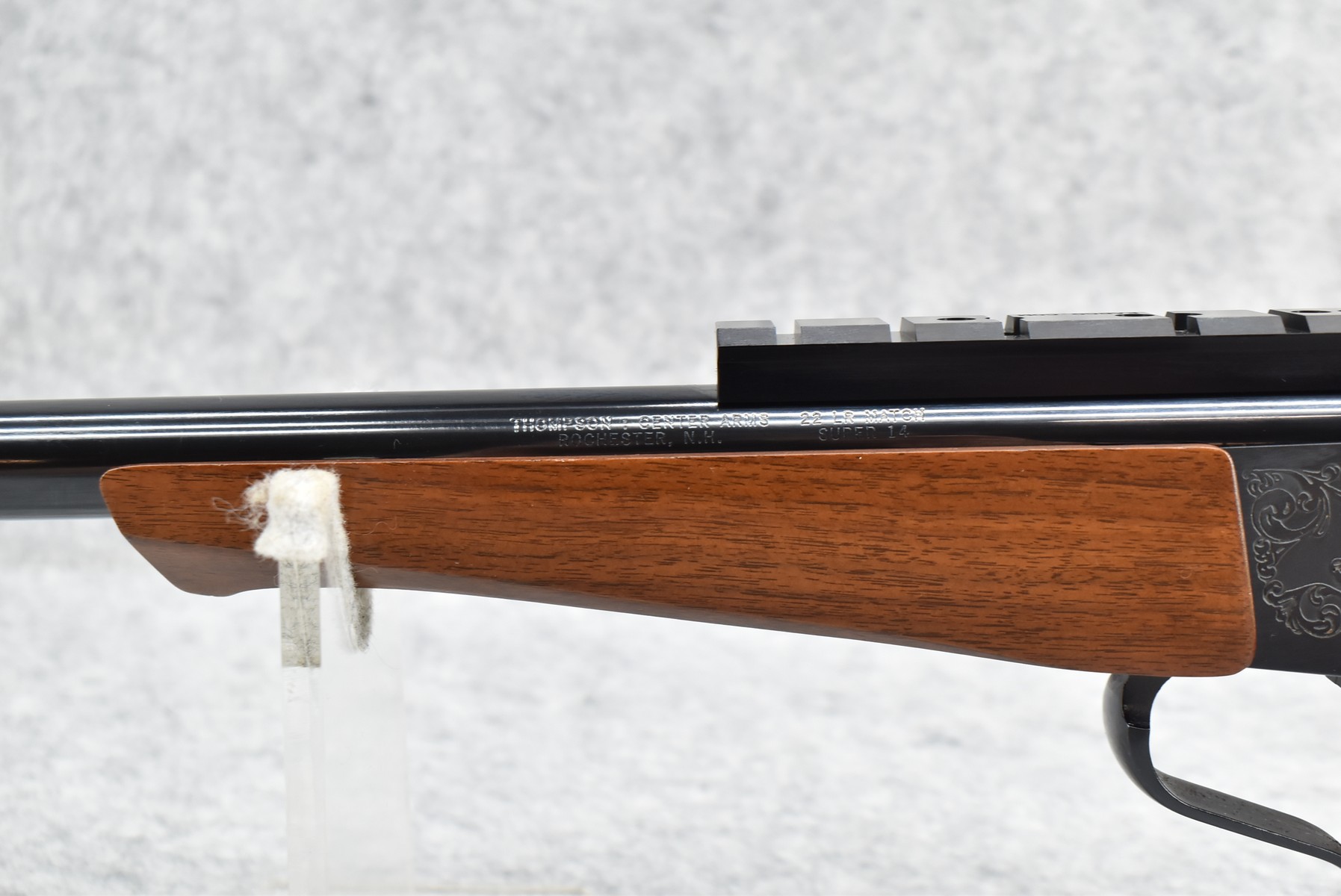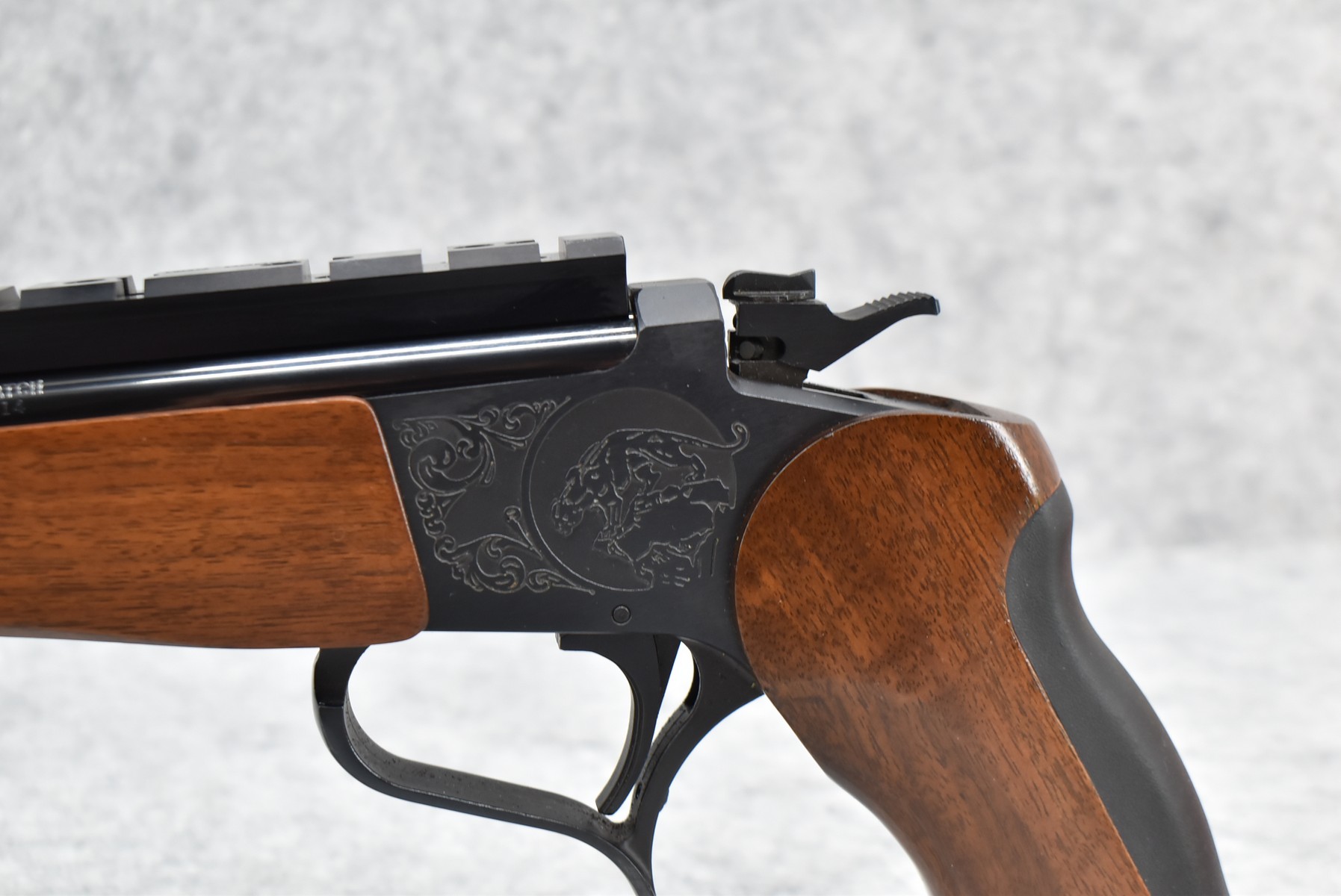 324R. Thompson Center – Mod. Contender – 22LR Match Cal. Single Shot Pistol – w/Super 14” Barrel w/Front Blade Sight – Blued Finish – w/Smooth Pistol Grip Wood Stocks – w/Rail Mount – w/Factory Box & Manual