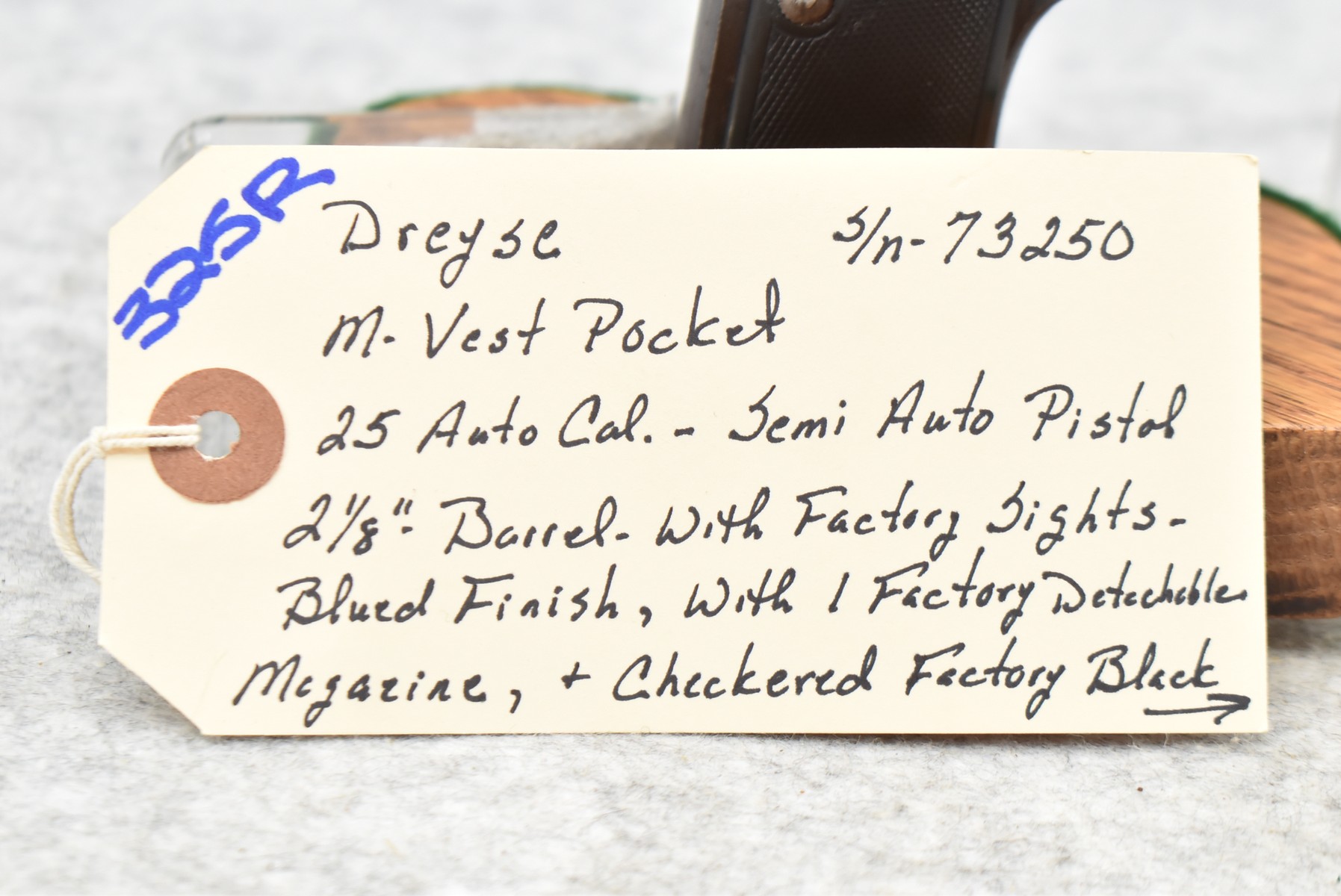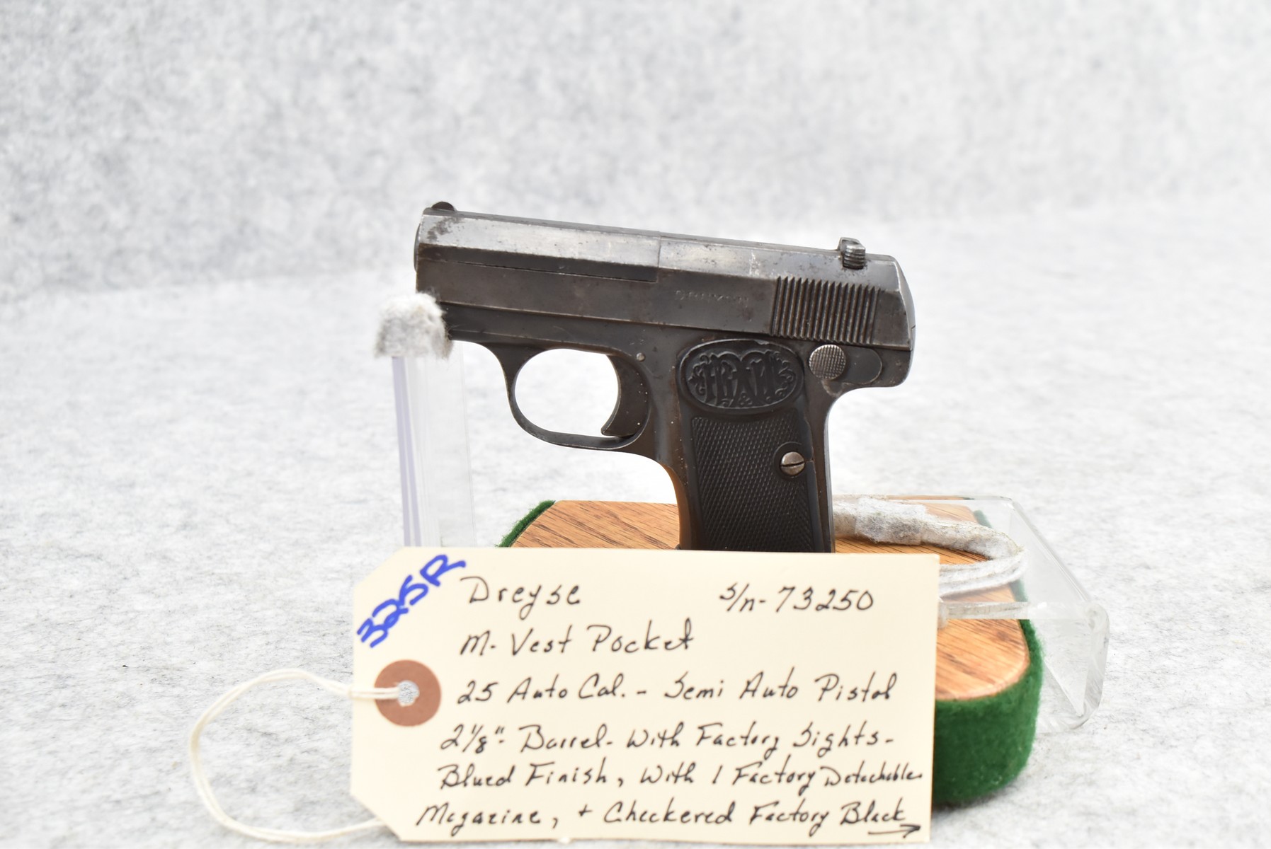 325R. Dreyse – Mod. Vest Pocket – 25 Auto Cal. Semi-Auto Pistol – w/2 1/8” Barrel w/Factory Sights – Blued Finish – w/Factory Detachable Magazine – w/Checkered Factory Black Hard Rubber Grips