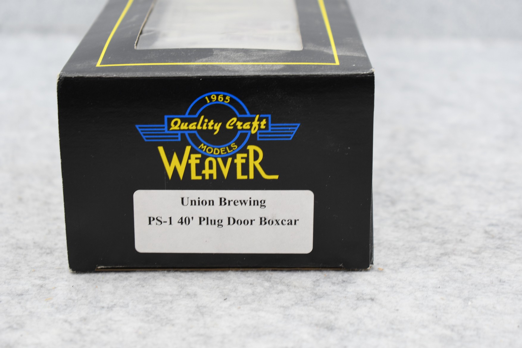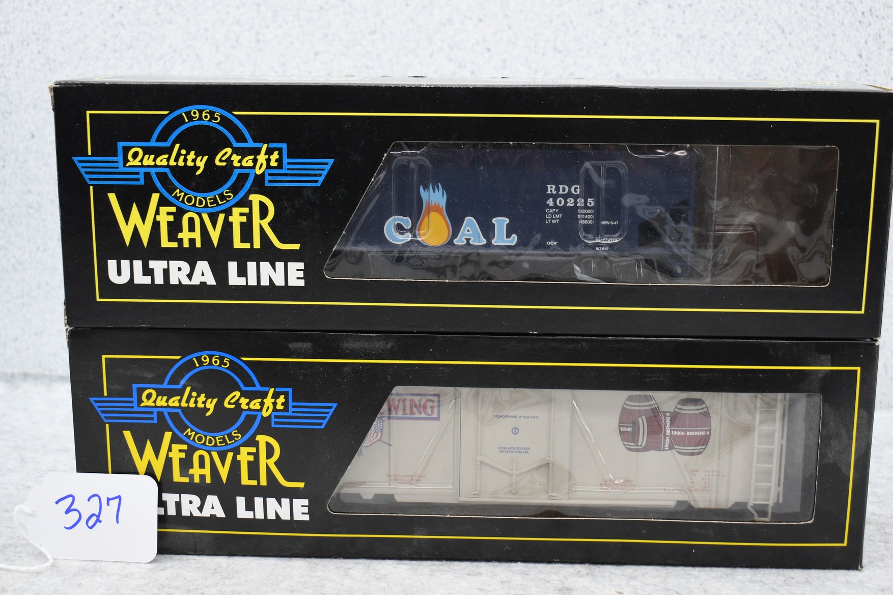 327. Pair of Weaver O gauge train cars including Union Brewing PS-1 Plug door boxcar, Reading 3 bay offset coal car, both NIB