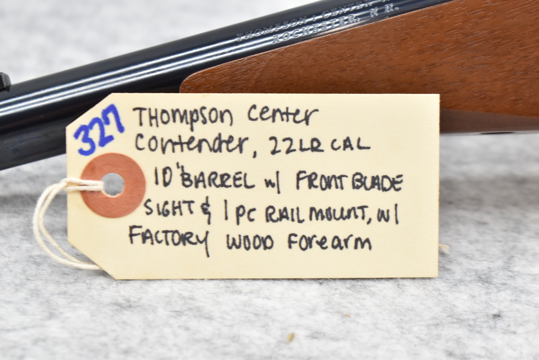 327.        Thompson Center – Mod. Contender – 22LR Cal. 10” Round Barrel w/Front Blade Sight – w/Factory Wood Forearm – w/1pc. Rail Mount – Barrel Only