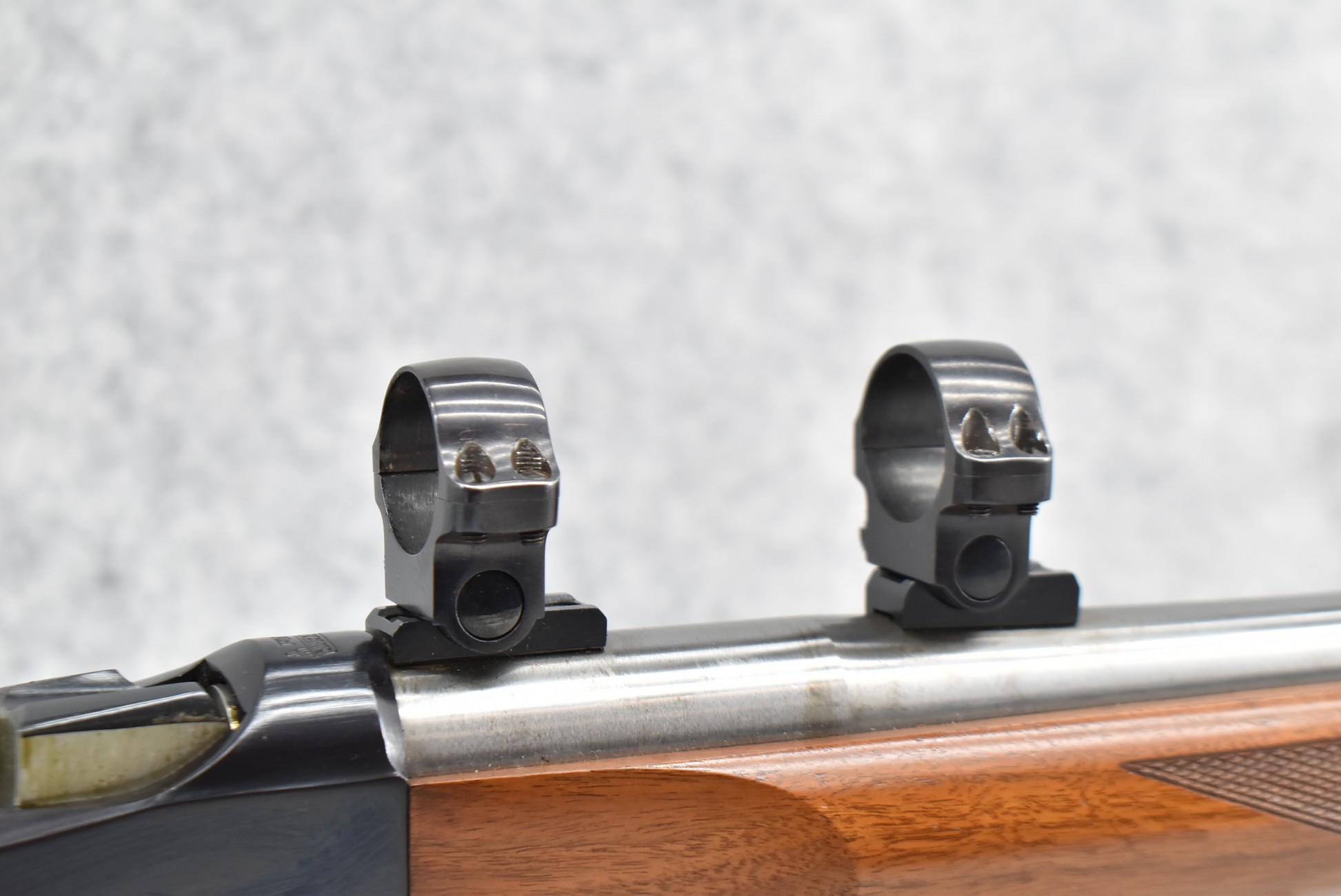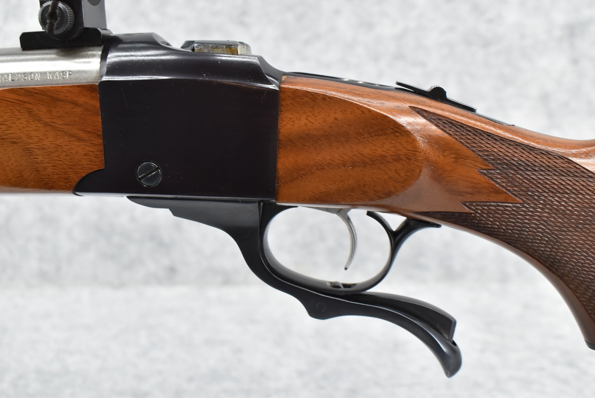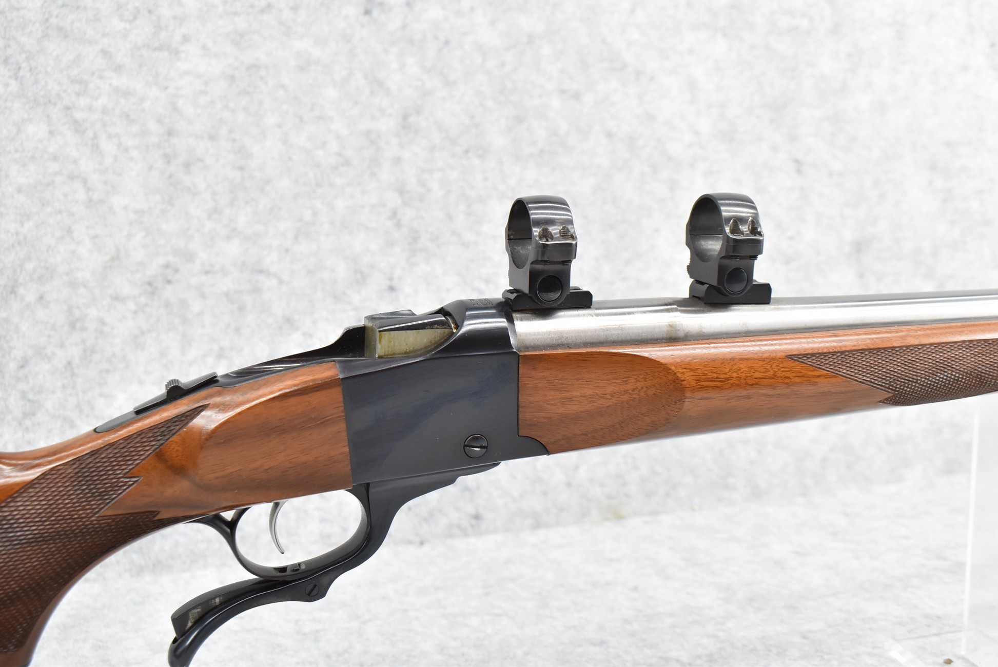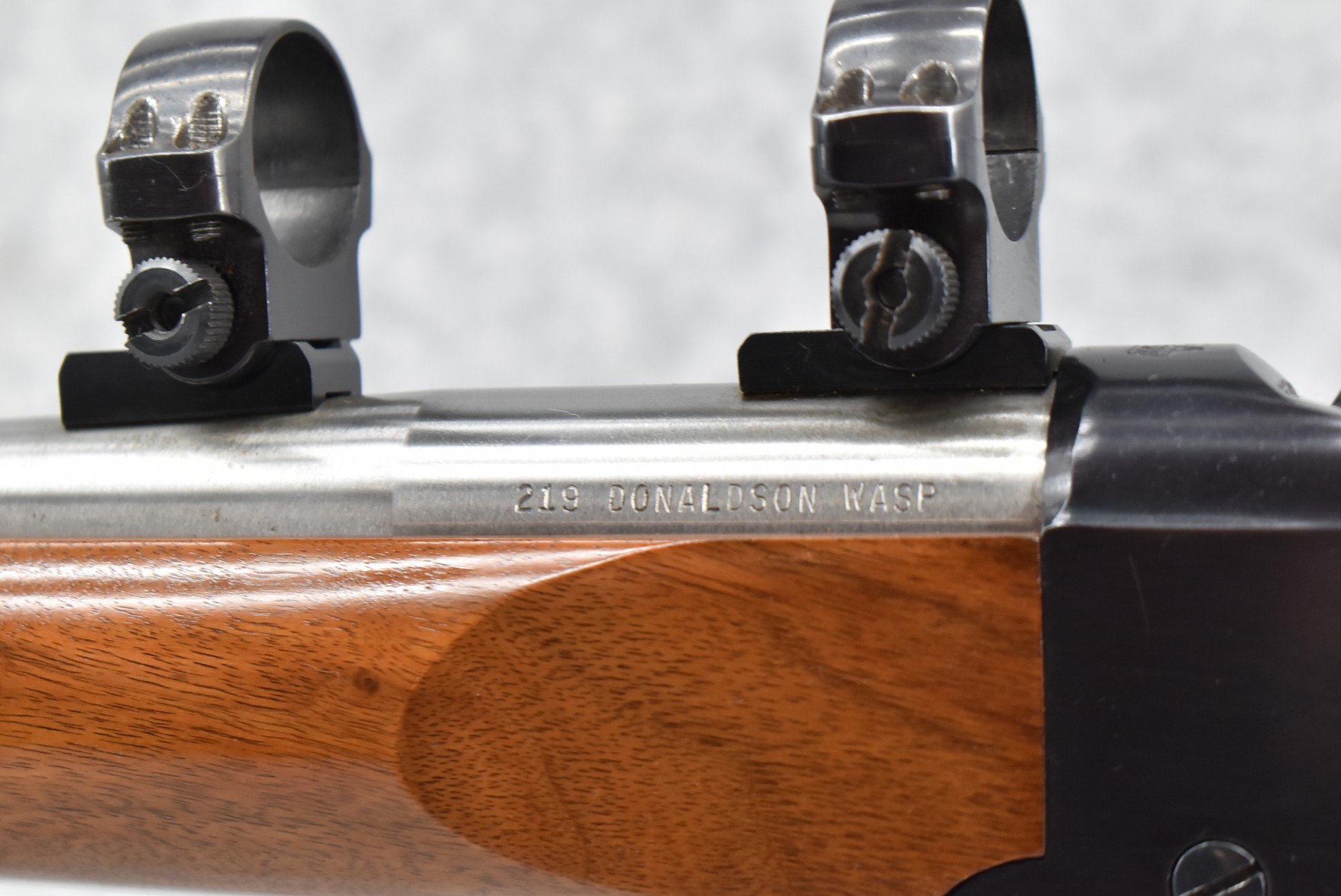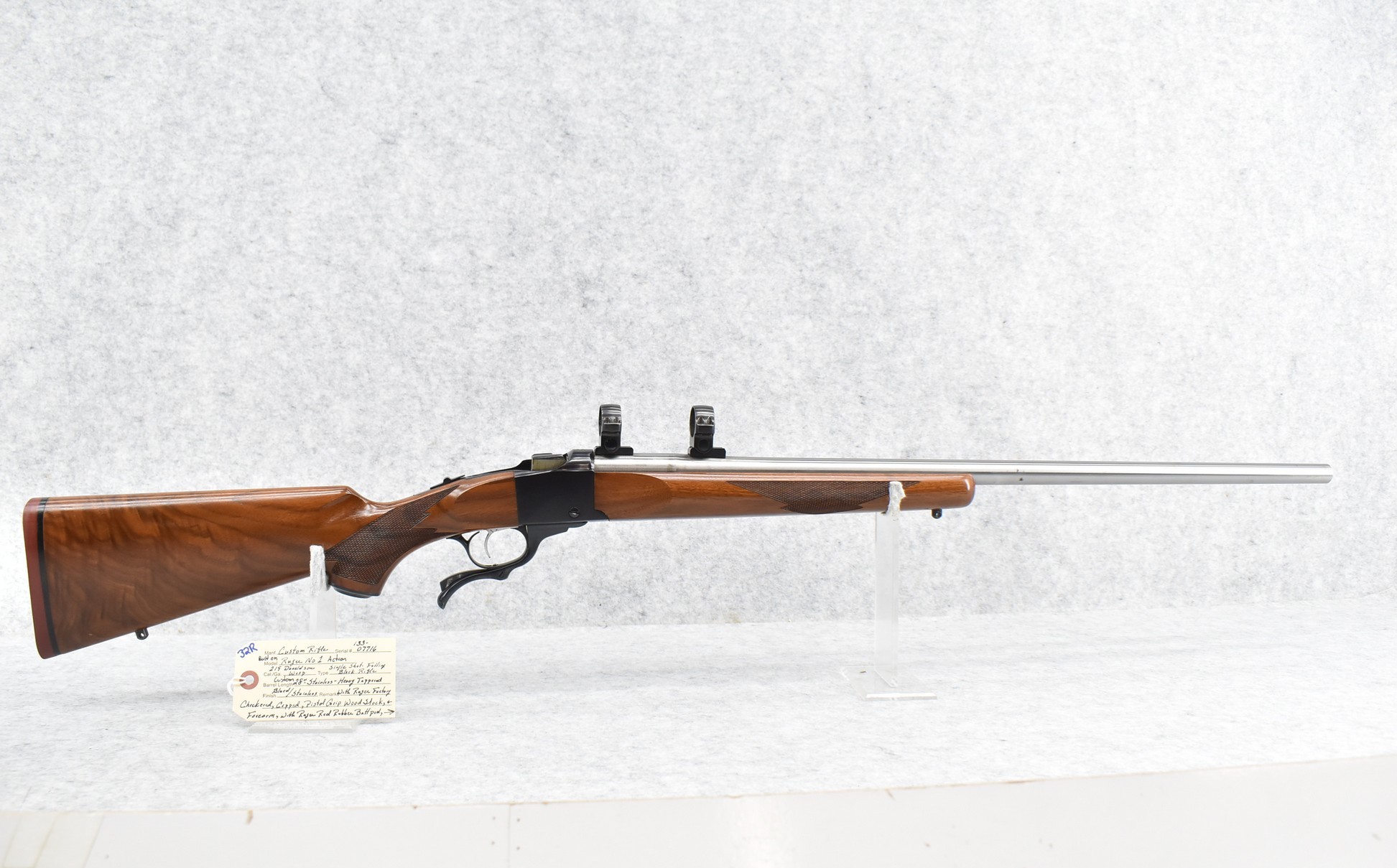 32R. Custom Rifle – Built on Ruger Mod. No. 1 Action – 219 Donalson Wasp Cal. Falling Block Single Shot Rifle – w/Custom 28” Stainless Heavy Tapered Barrel – Blued/Stainless Finish – w/Ruger Factory Checkered Capped Pistol Grip Wood Stock w/Factory Butt Pad – w/Ruger Factory Scope Rings