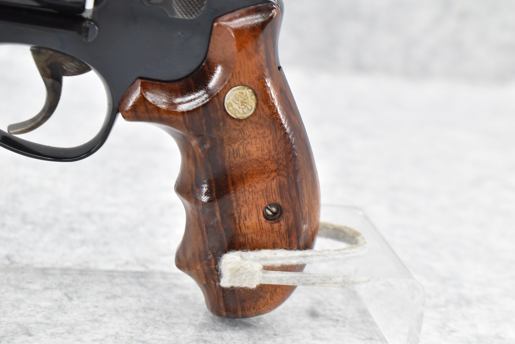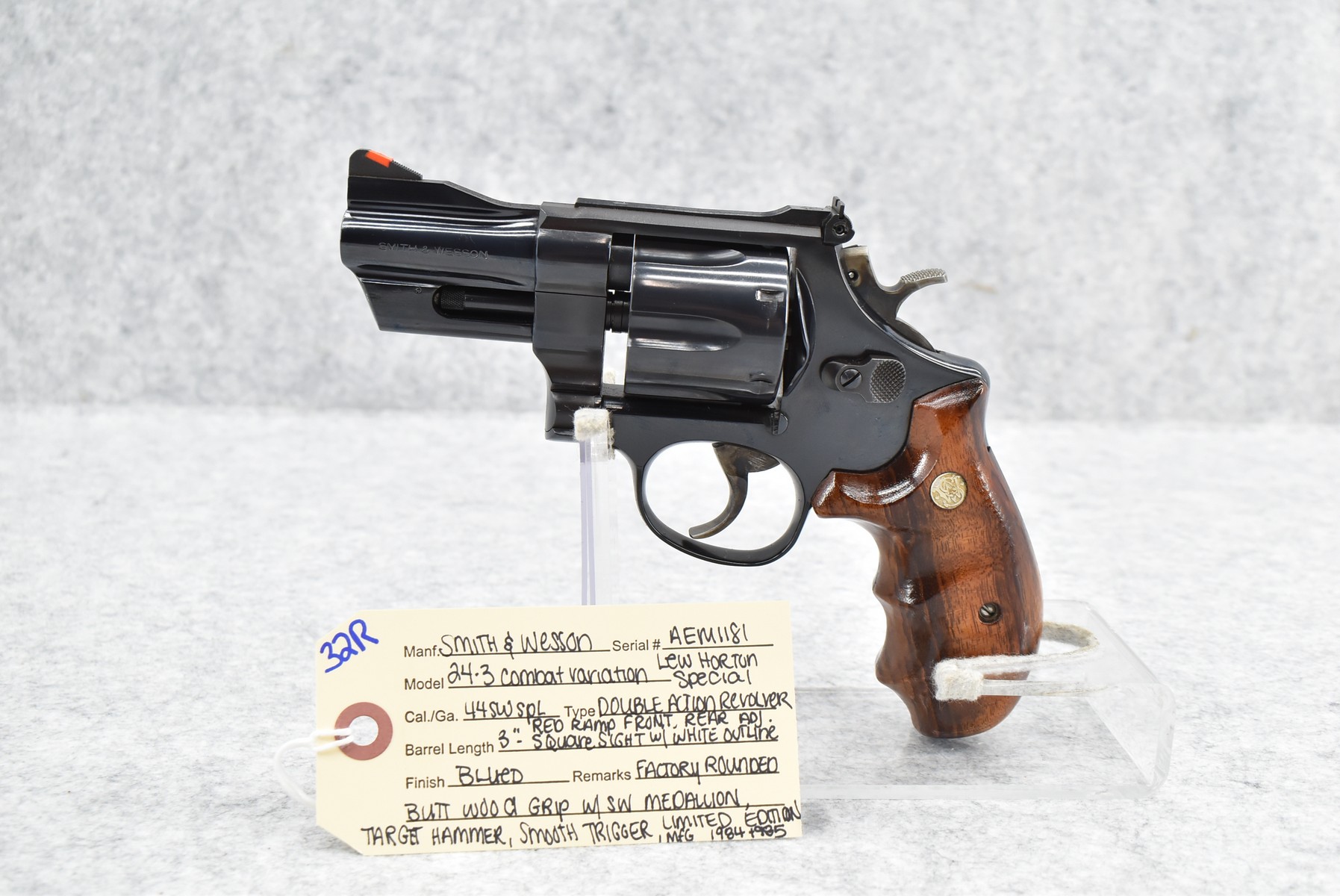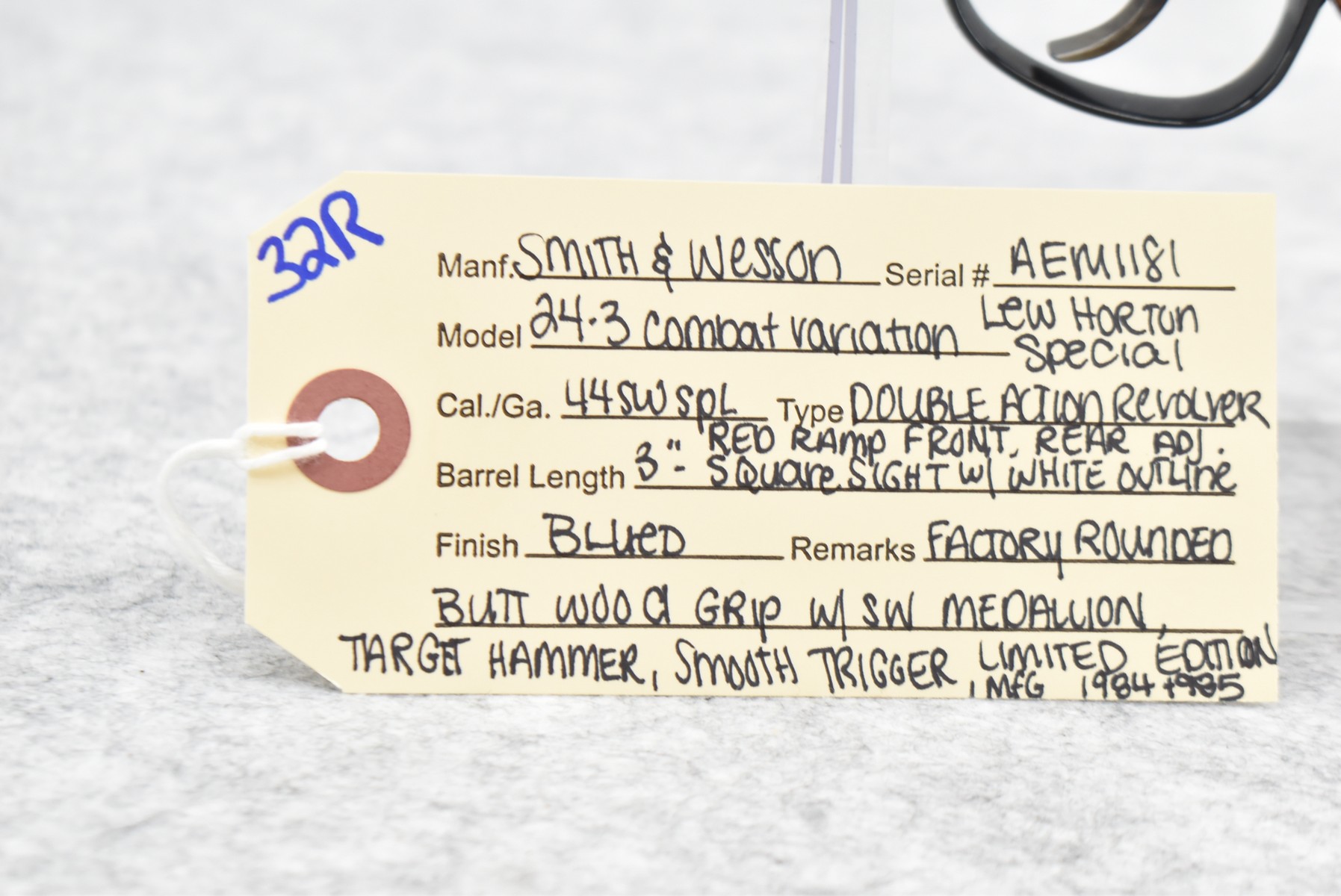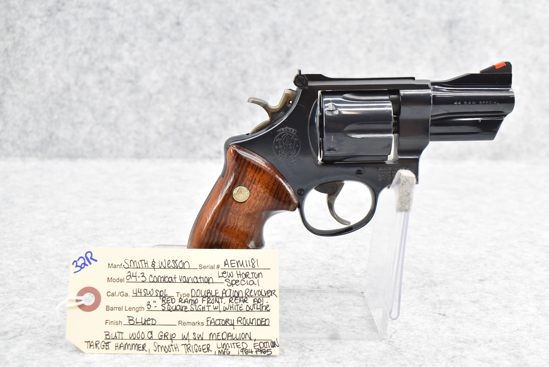 32R. Smith & Wesson – Mod. 24-3 Combat Variation – Lew Horton Special – 44 S&W Spl. Cal. Double Action Revolver – w/3” Red Ramp Front Sight & Rear Adj. Square Sight w/White Outline – Blued Finish – w/Factory Rounded Butt 3-Finger Wood Grip w/S&W Medallion – Limited Edition of Only 1,000 Mfg. Between 1984-1985