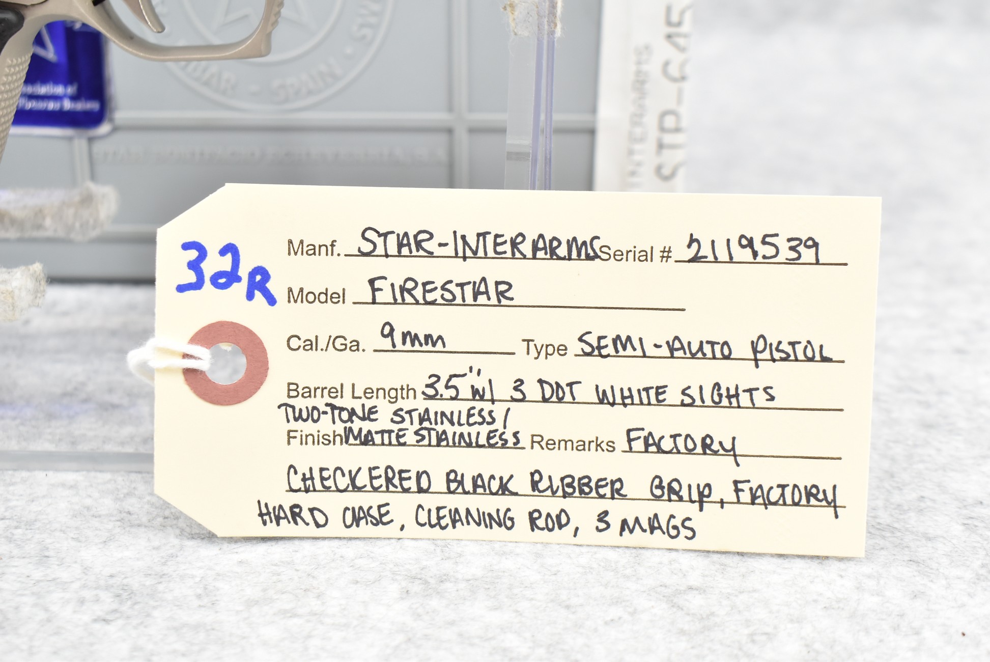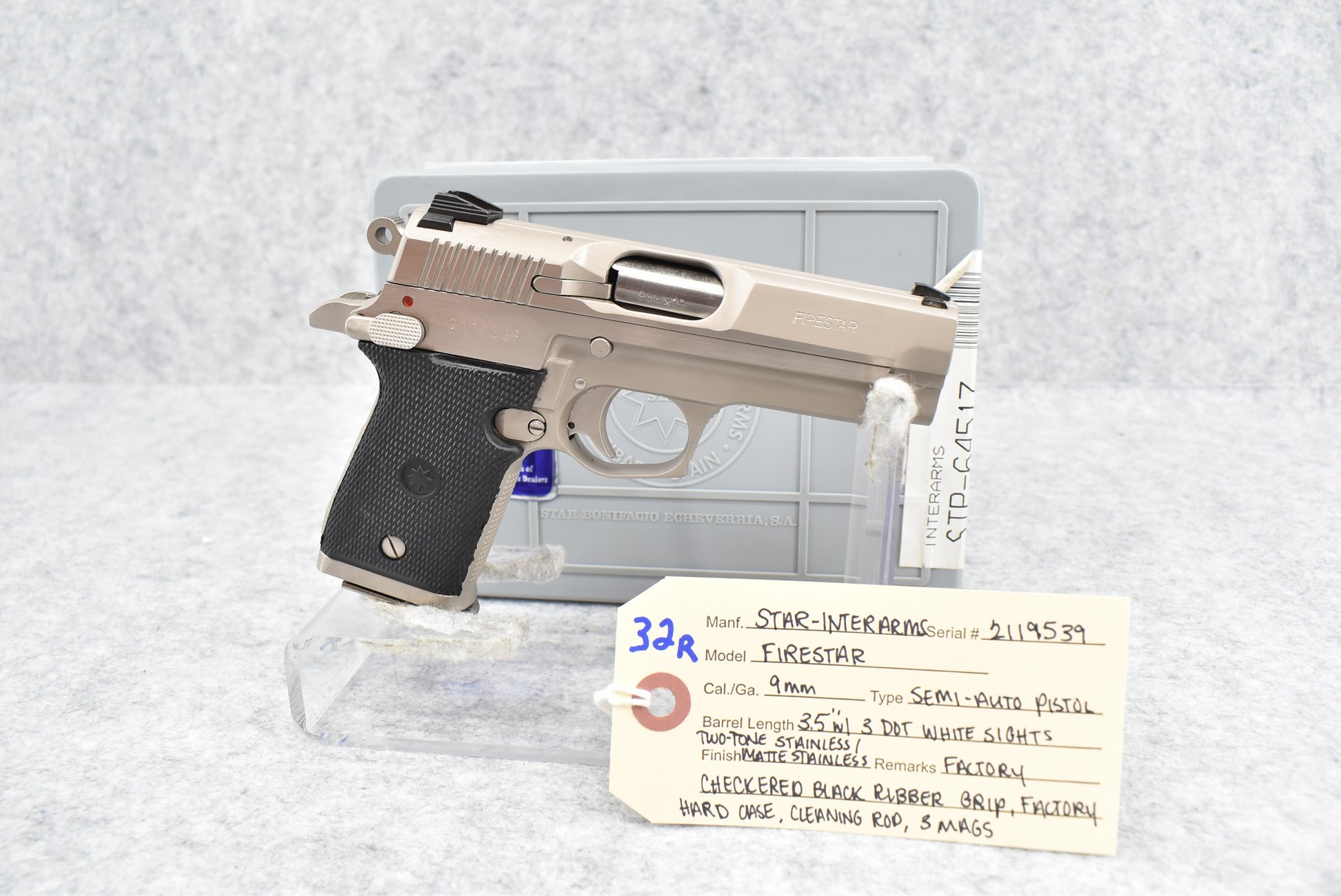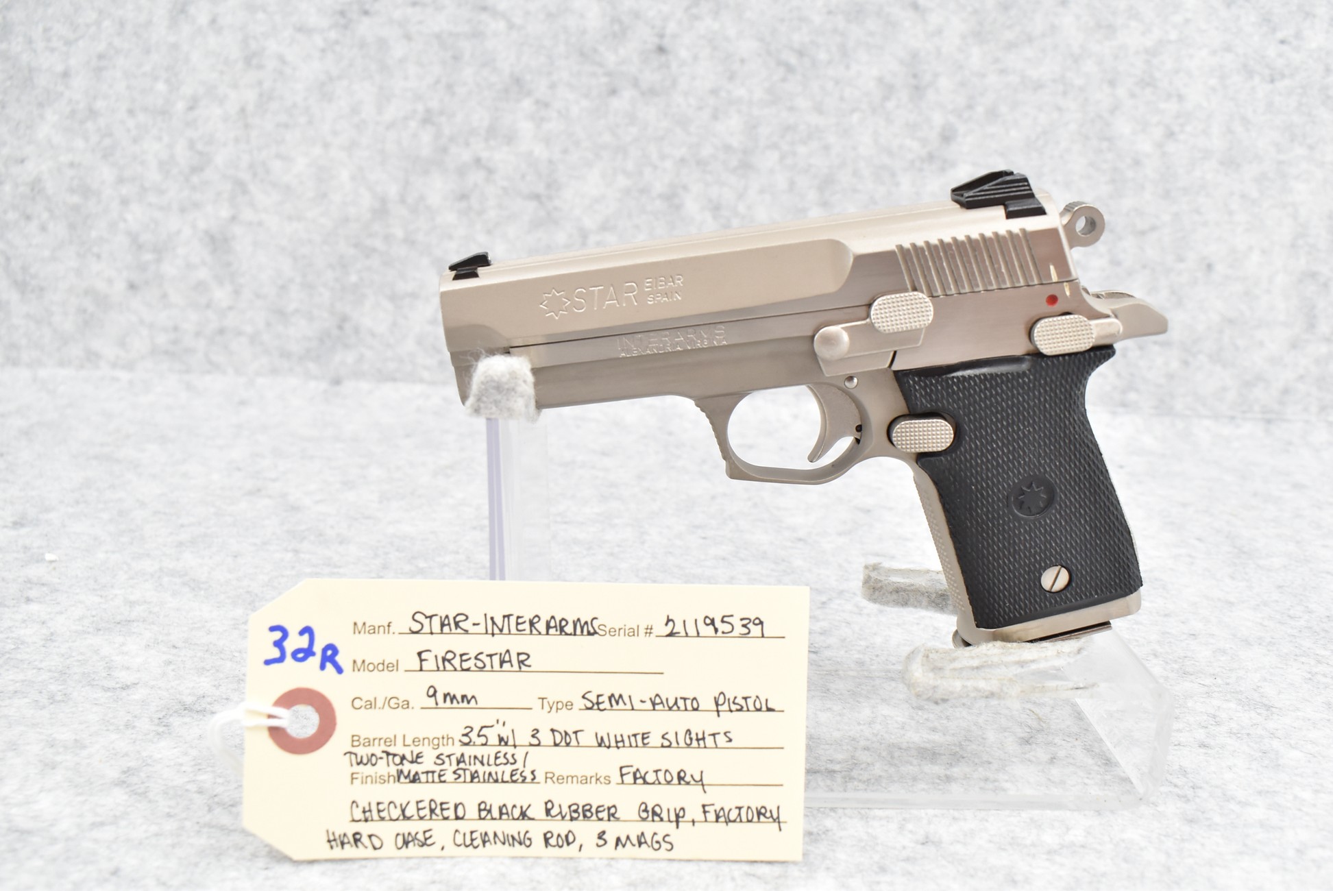 32R. Star – Mod. Firestar – 9mm Cal. Semi-Auto Pistol – w/3.5” Barrel w/3-Dot White Sights – Stainless/Matte Stainless Two-Tone Finish – w/Factory Checkered Black Rubber Grip – w/Factory Hard Case, Cleaning Rod & 3 Mags
