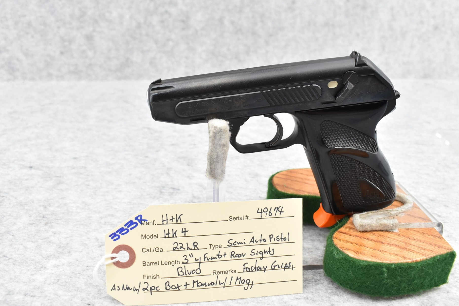 333R. H&K – Mod. HK4 – 22LR Cal. Semi-Auto Pistol – w/3” Barrel w/Front & Rear Sights – Blued Finish – w/Factory Grips – As New w/2pc. Box, Manual & Mag