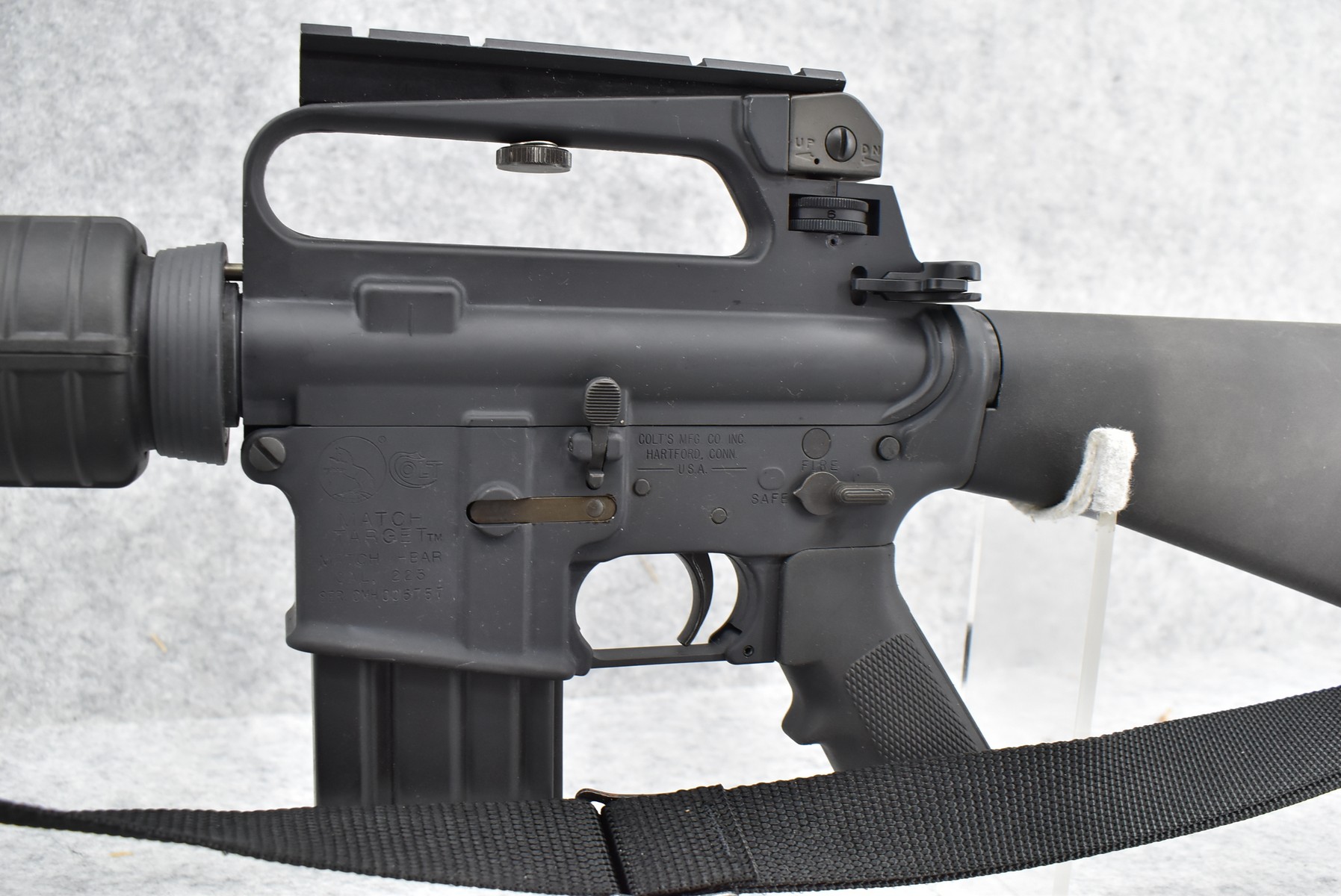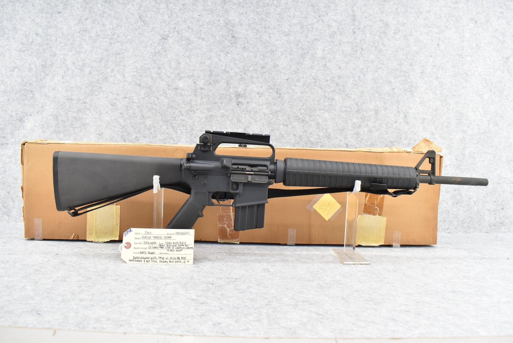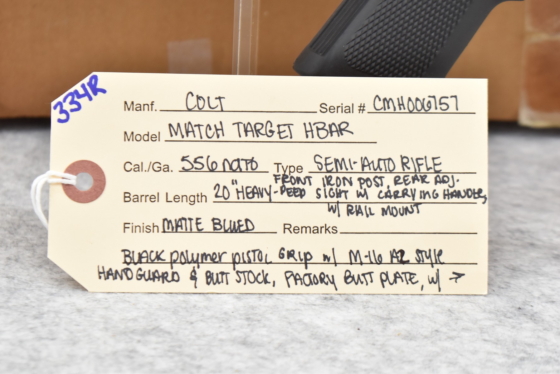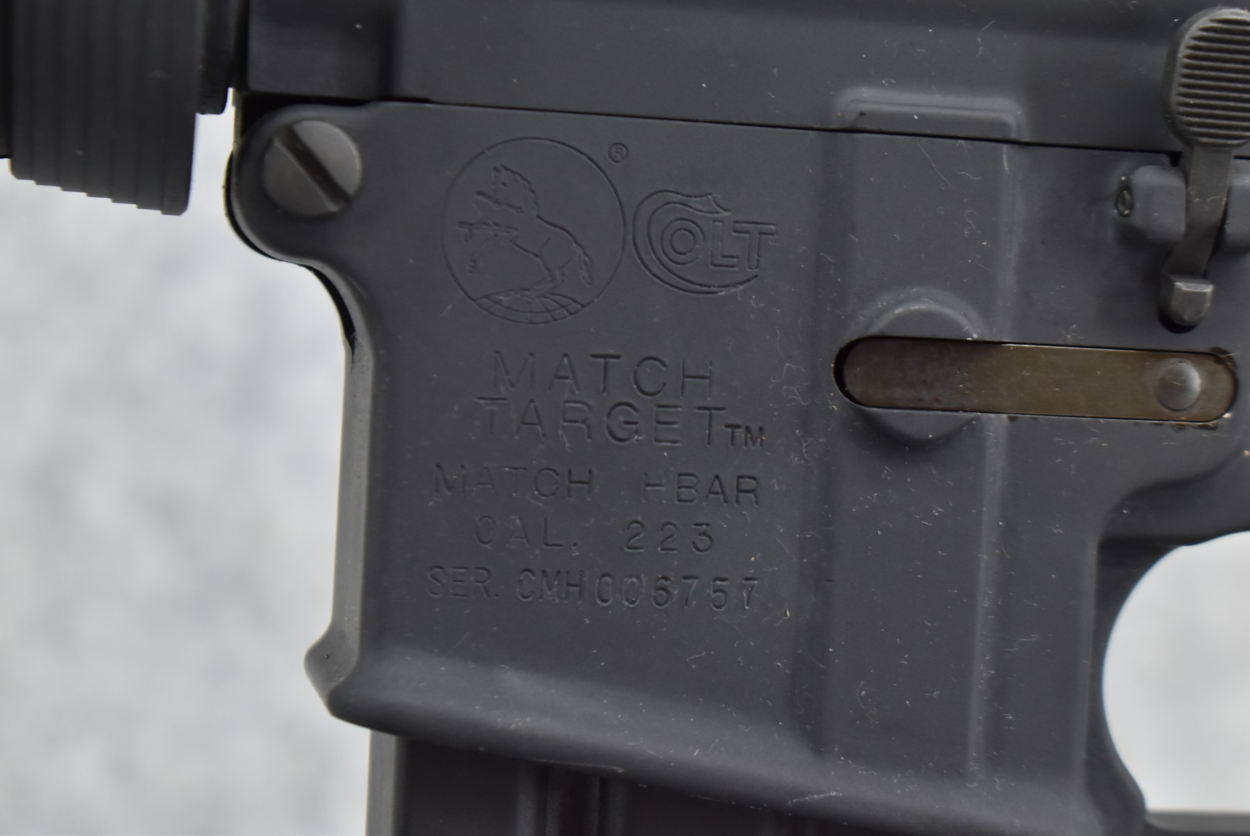 334R. Colt – Mod. Match Target HBAR – 5.56 NATO Cal. Semi-Auto Rifle – w/20” Heavy Barrel w/Front Iron Post & Rear Adj. Peep Sight – Matte Blued Finish – w/Black Polymer Pistol Grip w/M-16 AR Style Hand Guard & Fixed Butt Stock w/Factory Butt Plate – w/Magazine – w/Sling – w/Carrying Handle w/Rail Mount – w/Factory Box & Manual (MARYLAND COMPLIANT)