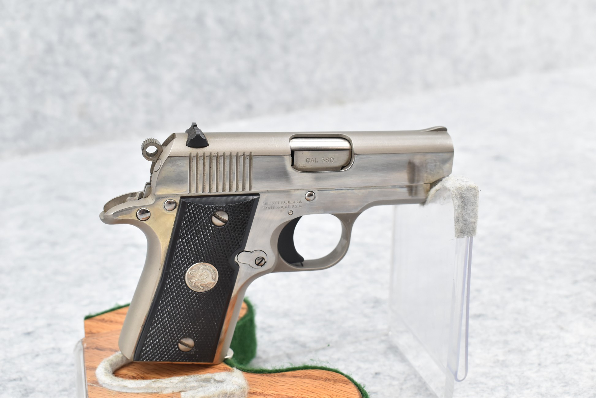 335R. Colt – Mod. Mustang MKIV/Series 80 – 380 Auto Cal. Semi-Auto Pistol – w/2 ¾” Barrel w/Iron Sights – Nickel Finish – w/Factory Colt Grips w/Colt Medallion – w/Factory Hard Case, Sleeve, Manual & 2 Factory Colt Magazines