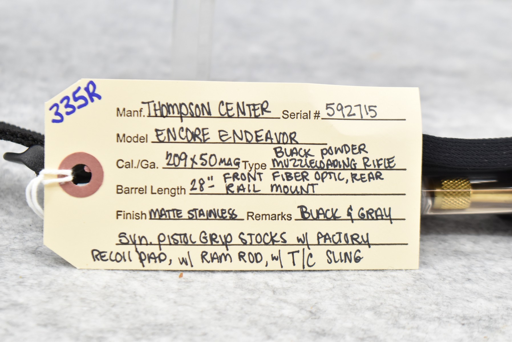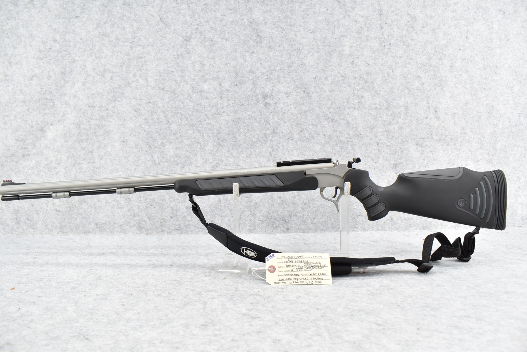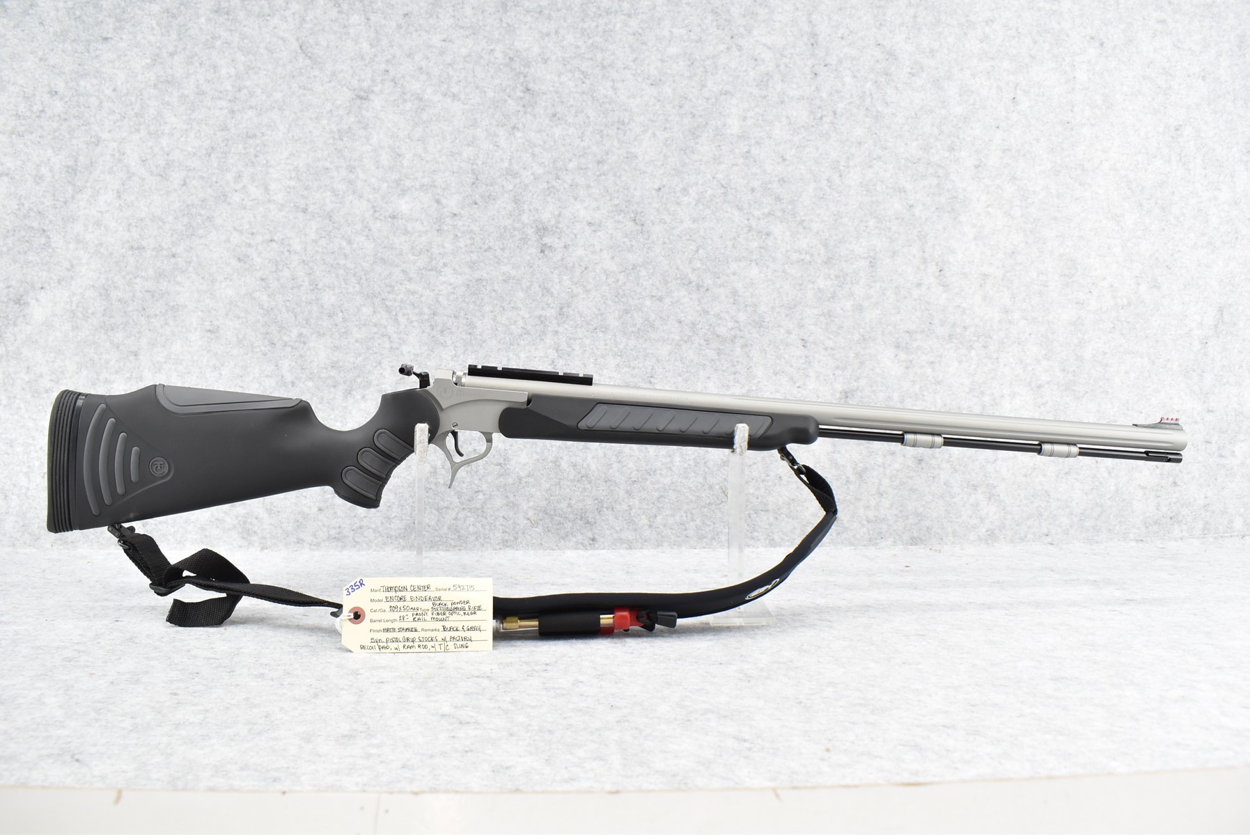 335R. Thompson Center – Mod. Encore Endeavor – 209×50 Mag. Cal. Black Powder Muzzleloading Rifle – w/28” Barrel w/Front Fiber Optic Sight – Matte Stainless Finish – w/Black & Gray Synthetic Pistol Grip Stocks w/Factory Recoil Pad – w/Factory Sling – w/Ram Rod – w/Scope Rail Mount