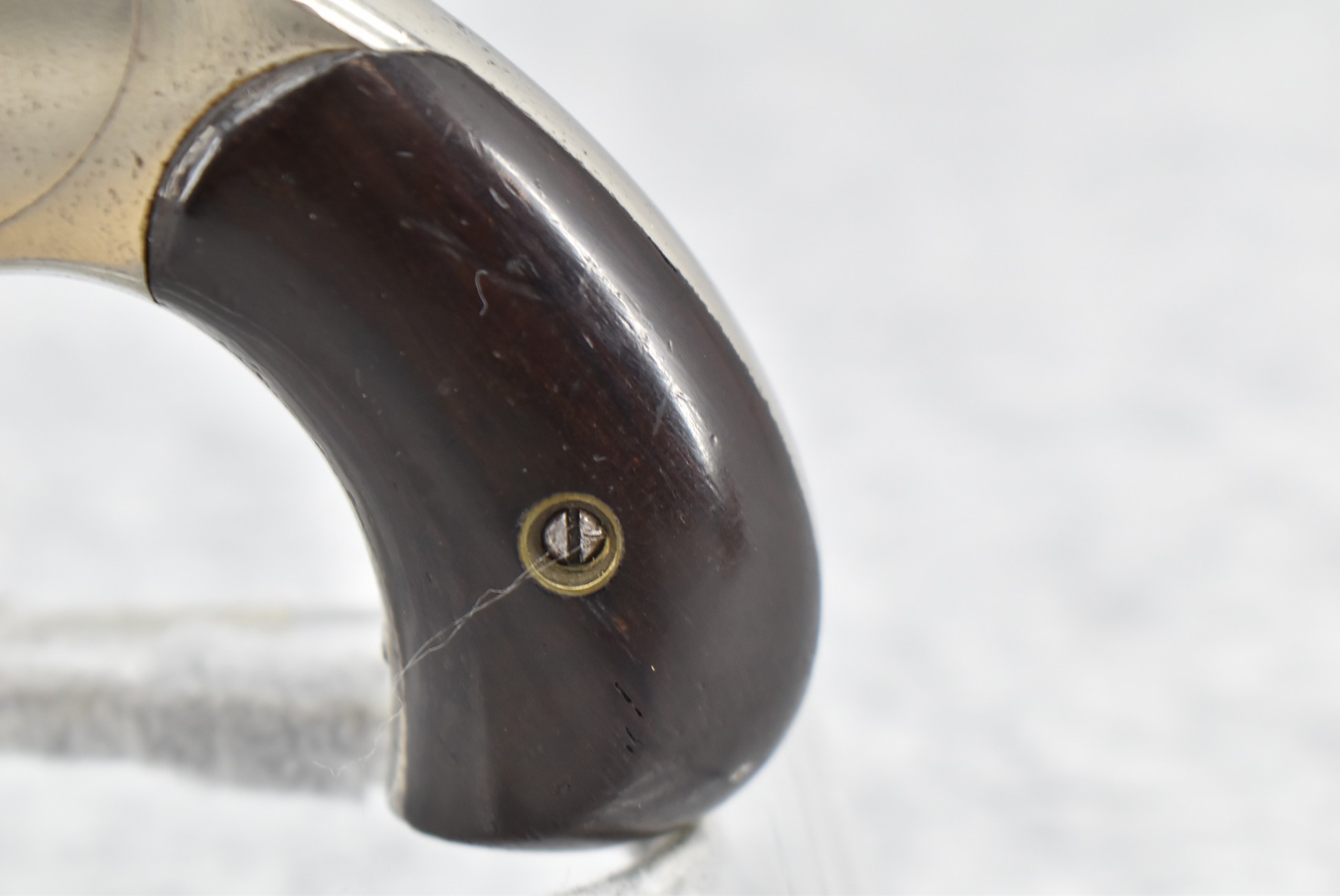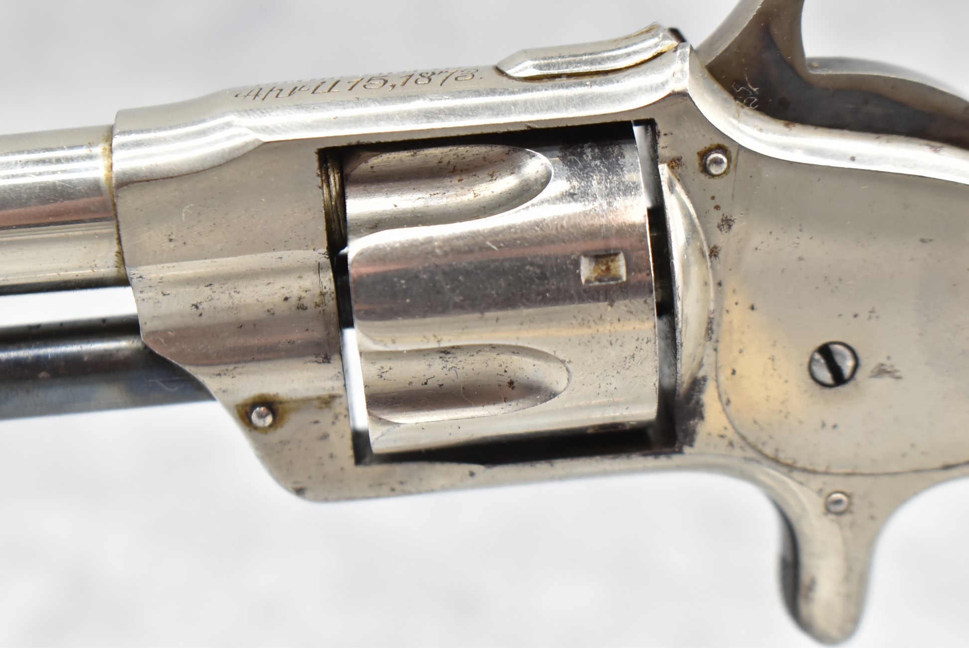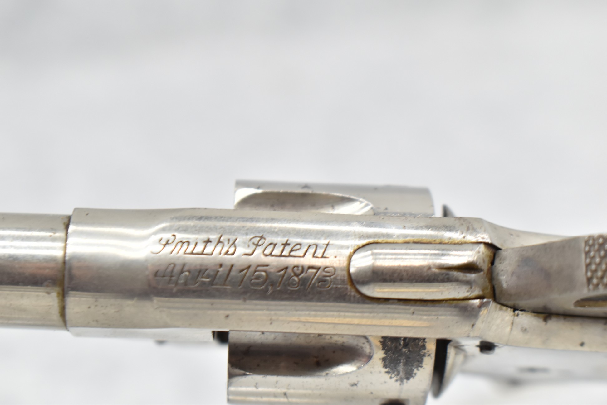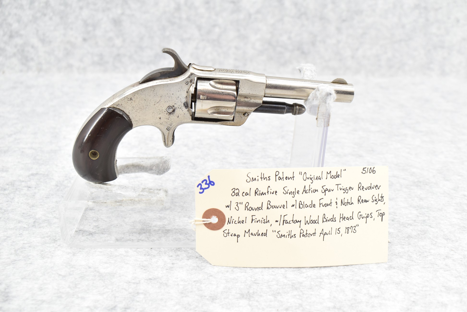 336. Smiths Patent – “Original Model” – 32 Cal. RF Cal. Single Action Spur Trigger Revolver – w/3” Round Barrel w/Blade Front & Notch Rear Sights – Nickel Finish – w/Factory Wood Birds Head Grips – Top Strap Marked “Smiths Patent April 15, 1873”