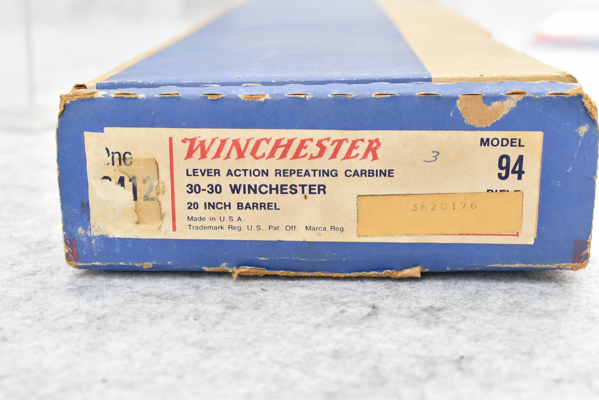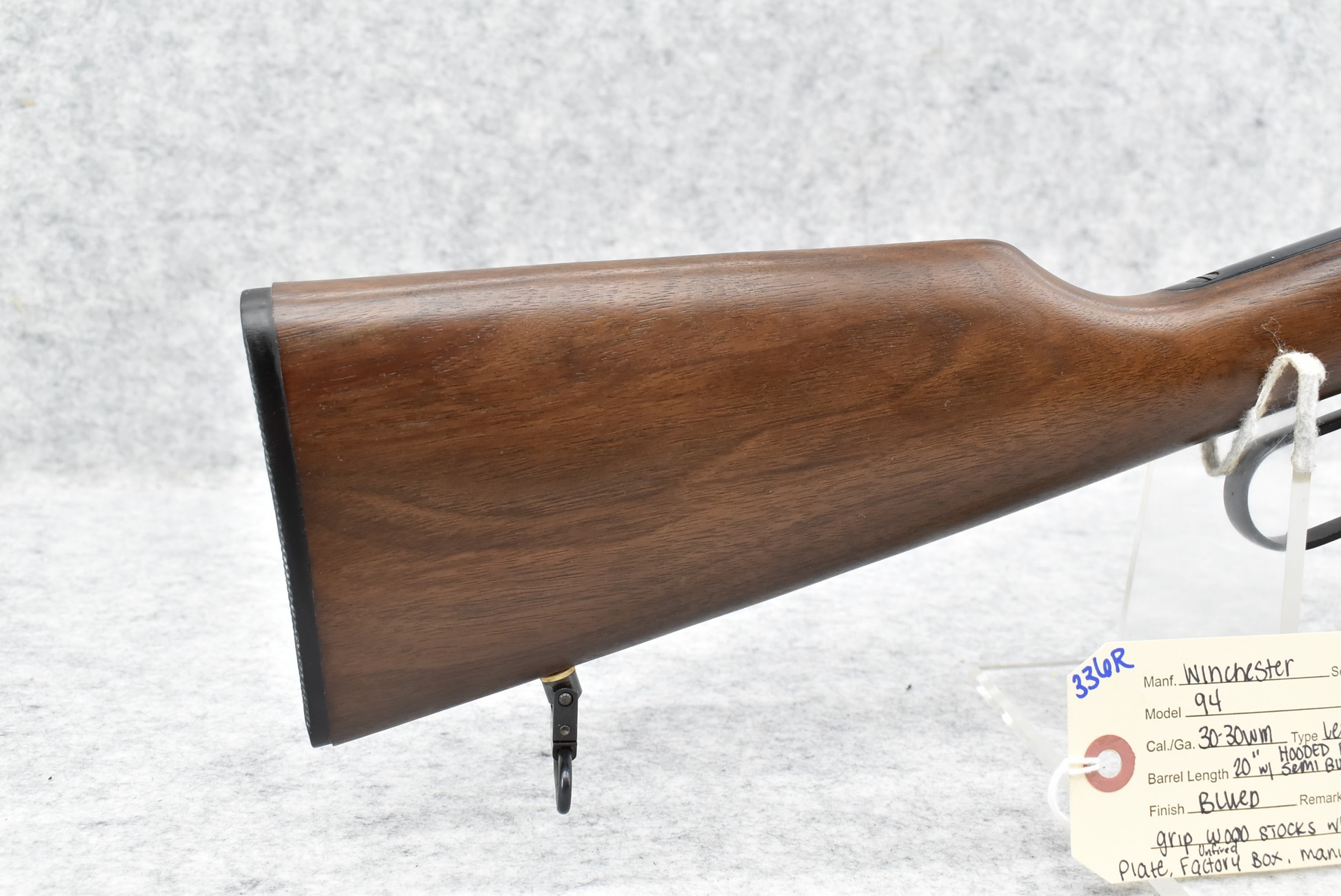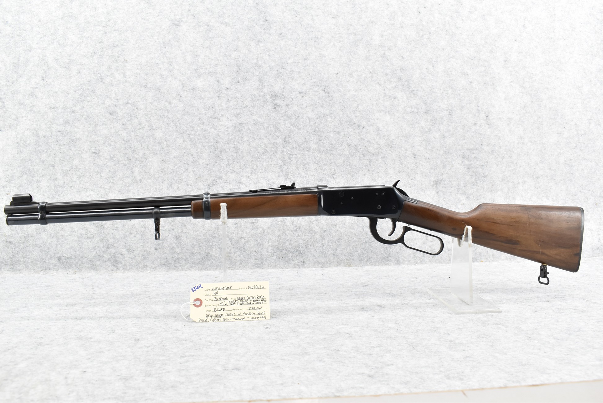 336R. Winchester – Mod. 94 – 30-30 Win. Cal. Lever Action Rifle – w/20” Barrel w/Hooded Front & Rear Adj. Semi Buckhorn Sights – Blued Finish – w/Straight Grip Wood Stocks w/Factory Butt Plate – Unfired w/Factory Box, Manual & Hang Tag