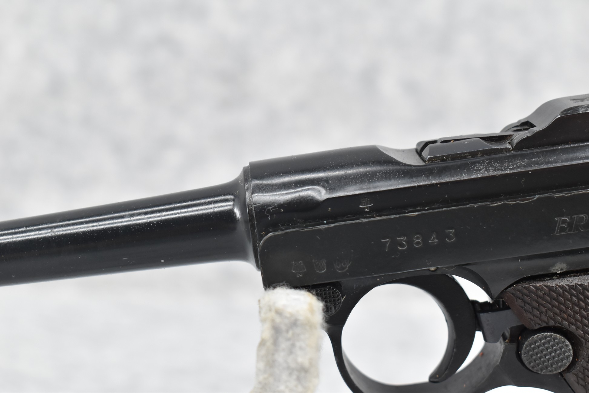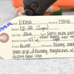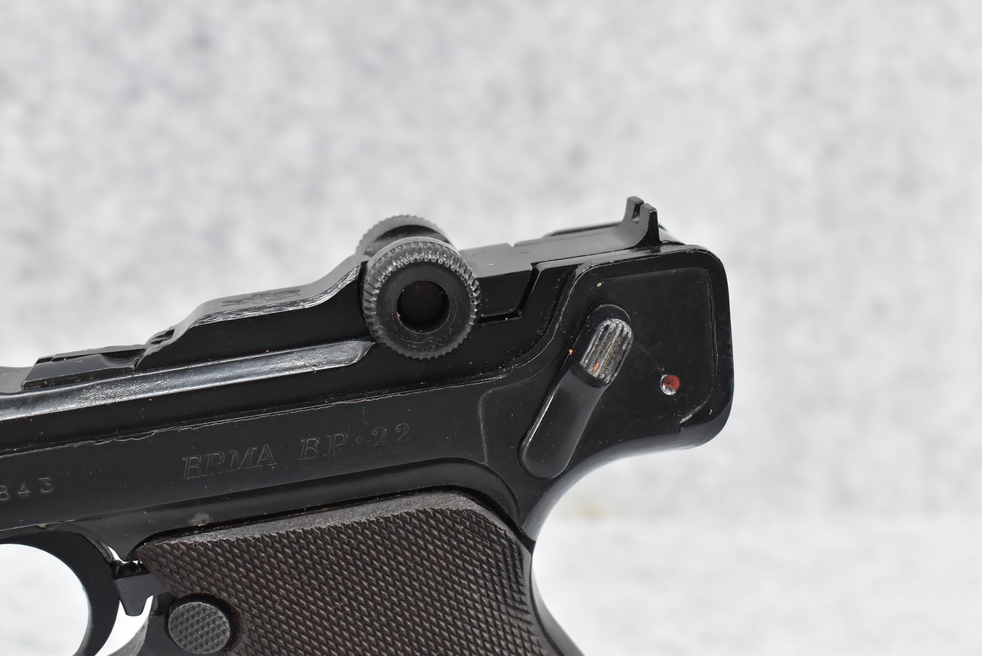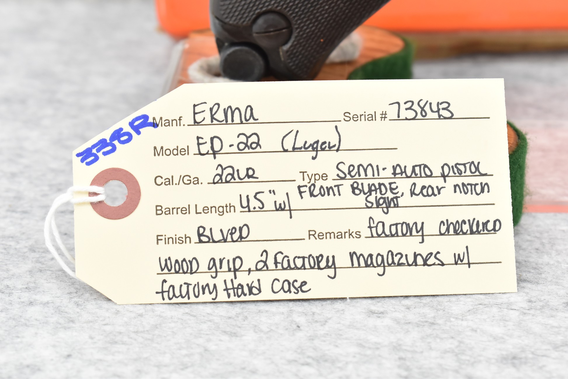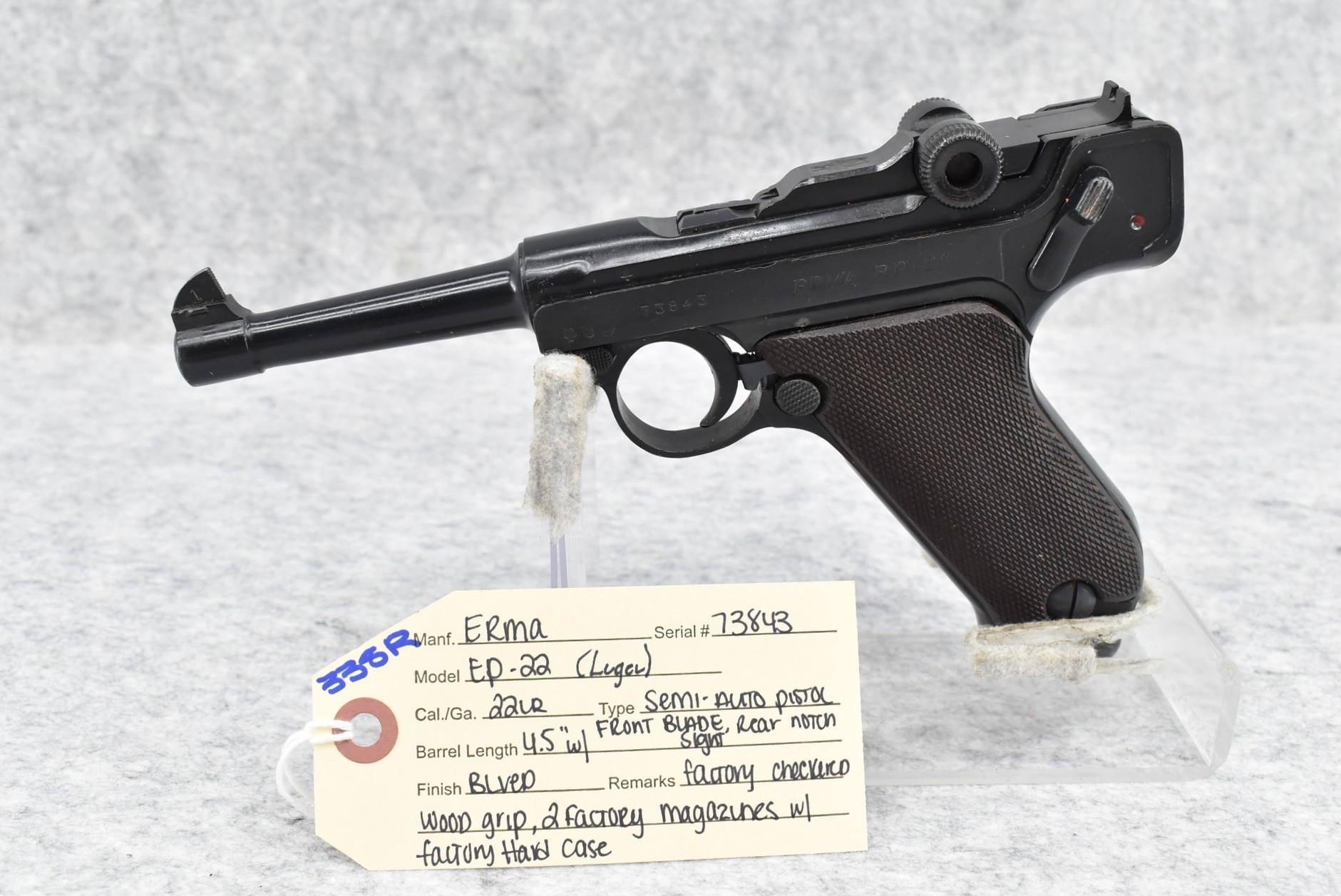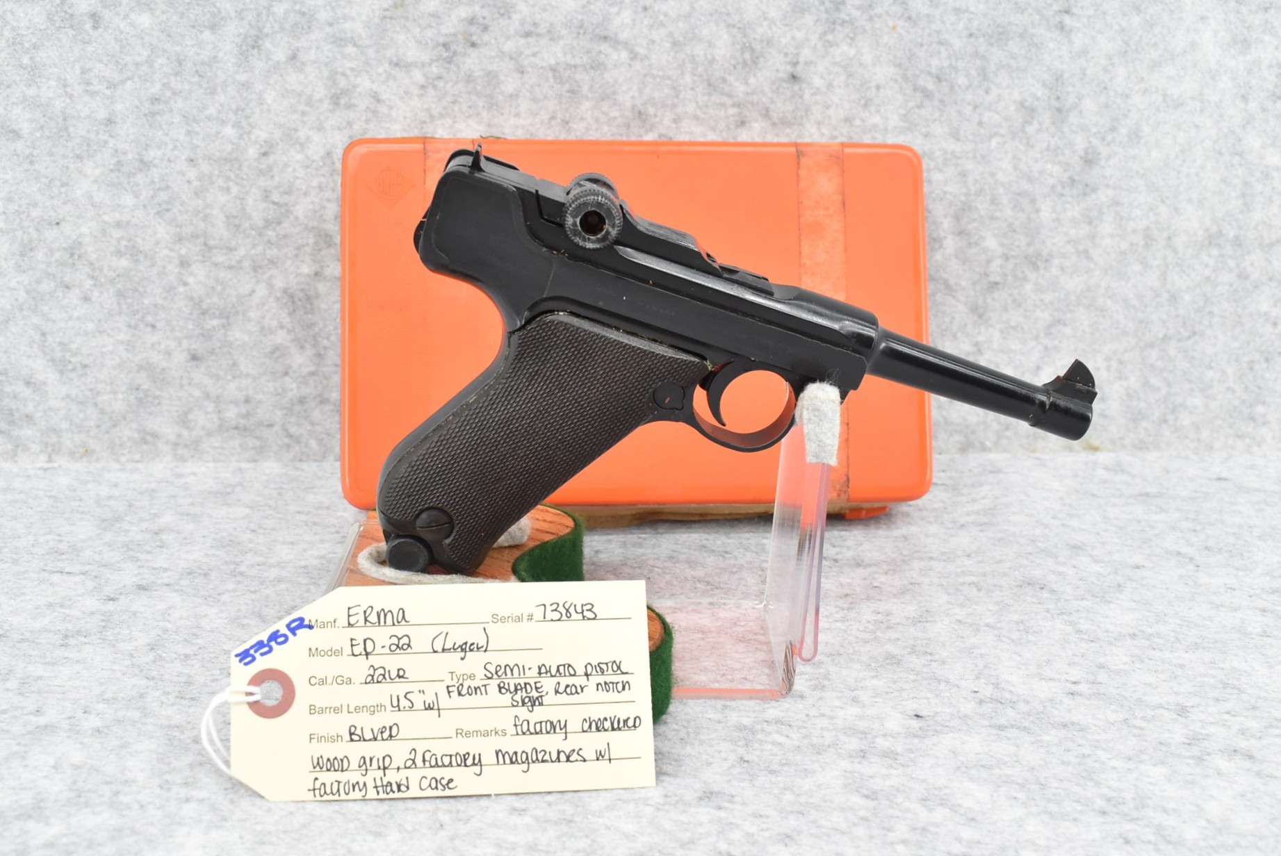 338R. Erma – Mod. EP-22 (Luger) – 22LR Cal. Semi-Auto Pistol – w/4.5” Barrel w/Front Blade & Rear Notch Sights – Blued Finish – w/Factory Checkered Wood Grip – w/2 Factory Mags – w/Factory Hard Case