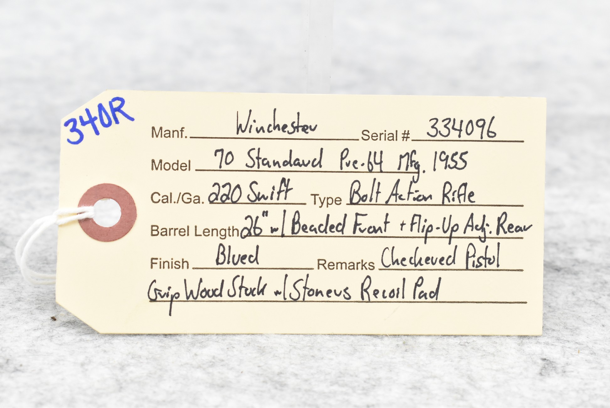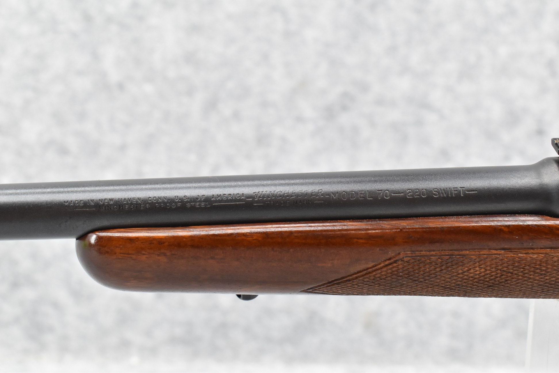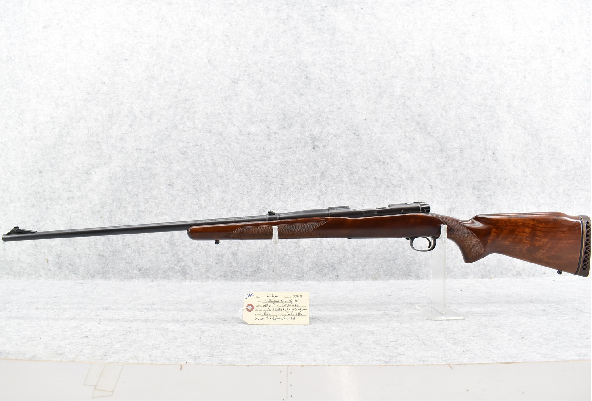 340R. Winchester – Mod. 70 Standard (Pre-64) – 220 Swift Cal. Bolt Action Rifle – w/26” Barrel w/Beaded Front & Flip Up Adj. Rear Sights – Blued Finish – w/Checkered Pistol Grip Wood Stock w/Stoneus Recoil Pad – Mfg. 1955