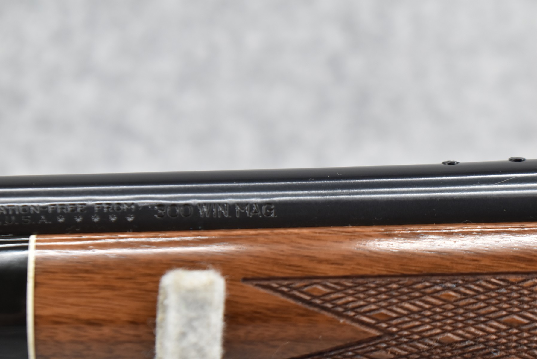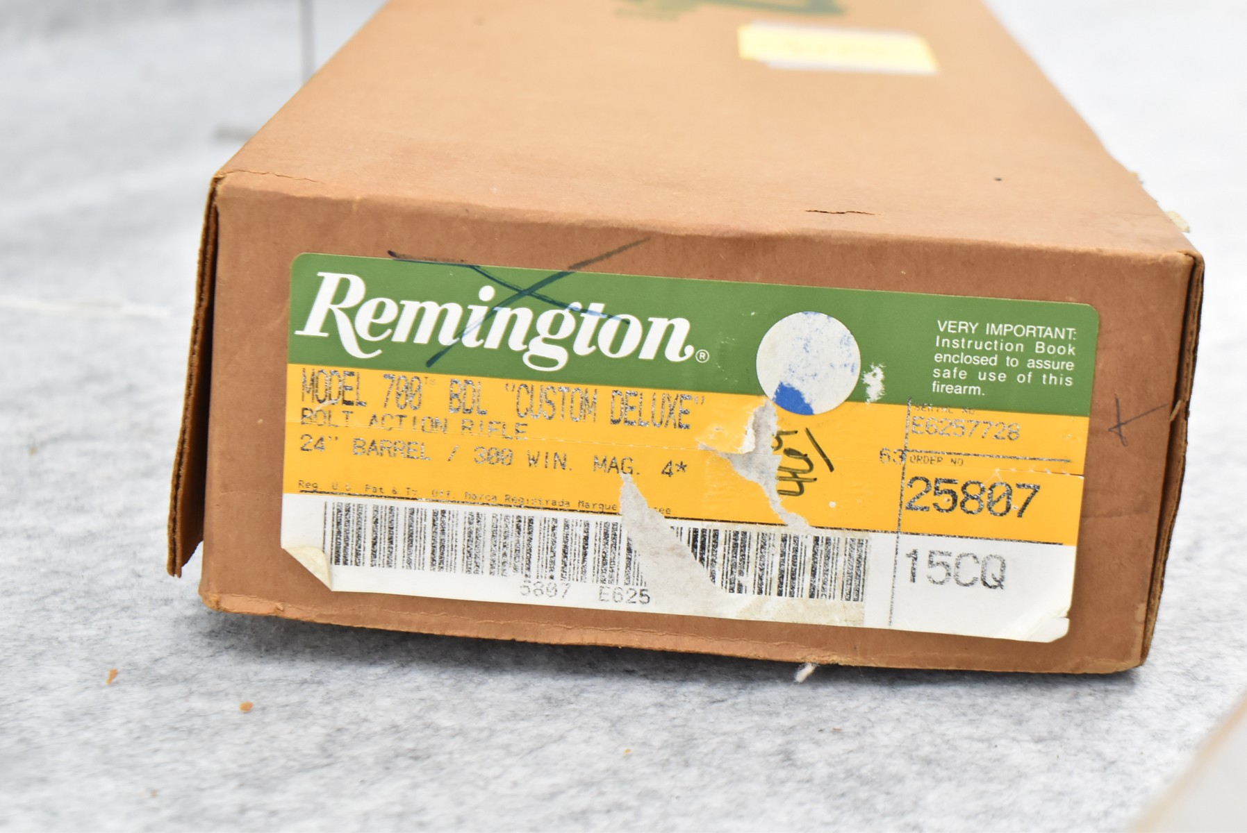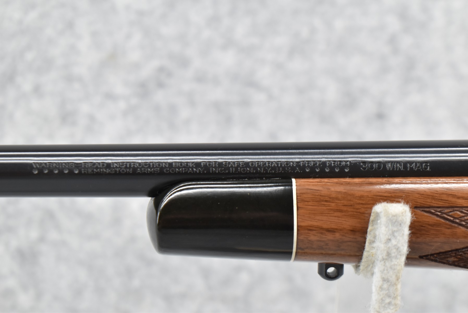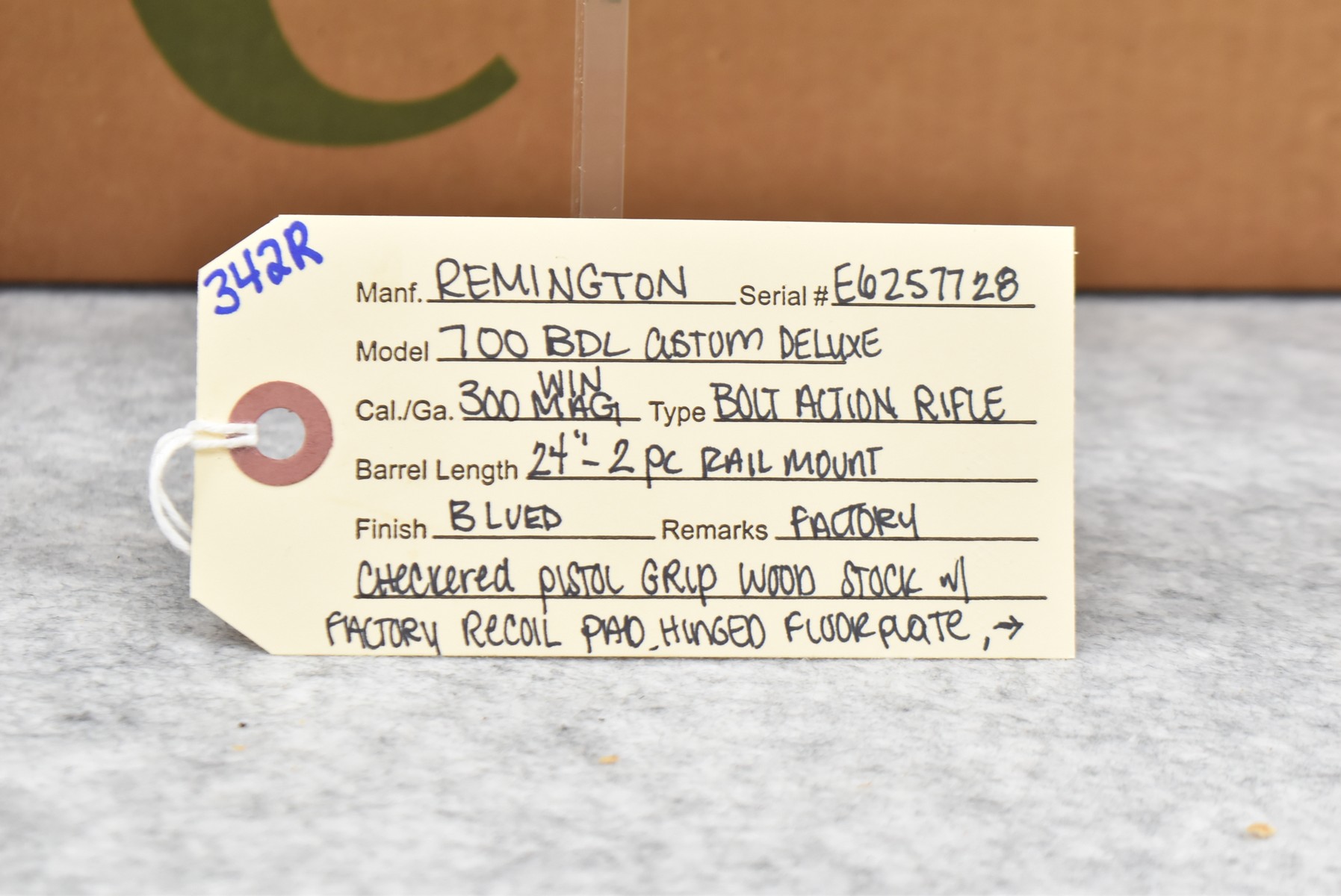 342R. Remington – Mod. 700 BDL Custom Deluxe – 300 Win. Mag. Cal. Bolt Action Rifle – w/24” Barrel – Blued Finish – w/Factory Checkered Pistol Grip Wood Stock w/Factory Recoil Pad – w/2pc. Rail Mount – w/Factory Box