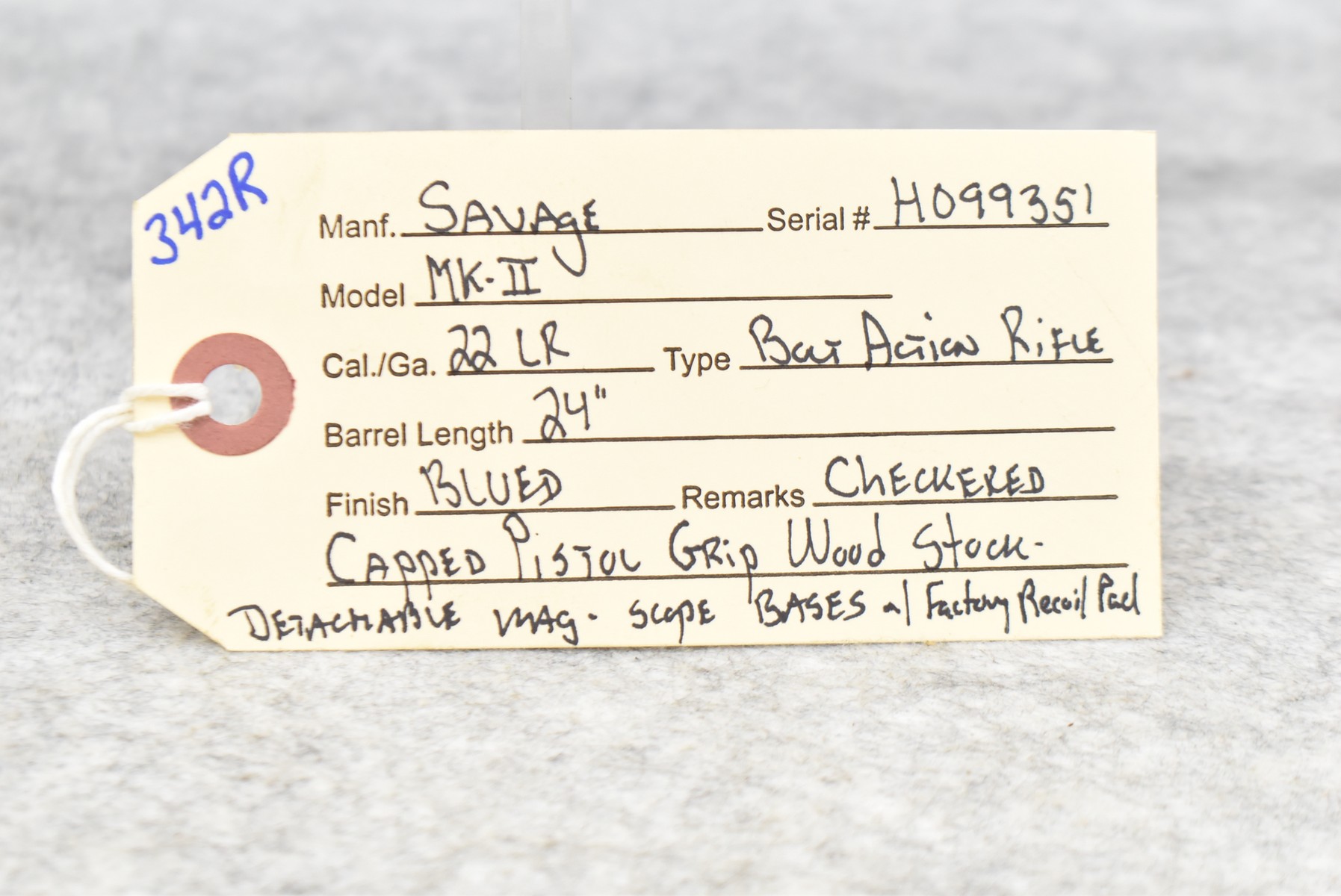 342R. Savage – Mod. MK II – 22LR Cal. Bolt Action Rifle – w/24” Barrel – Blued Finish – w/Checkered Capped Pistol Grip Wood Stock w/Factory Recoil Pad – w/Detachable Mag – w/Scope Bases