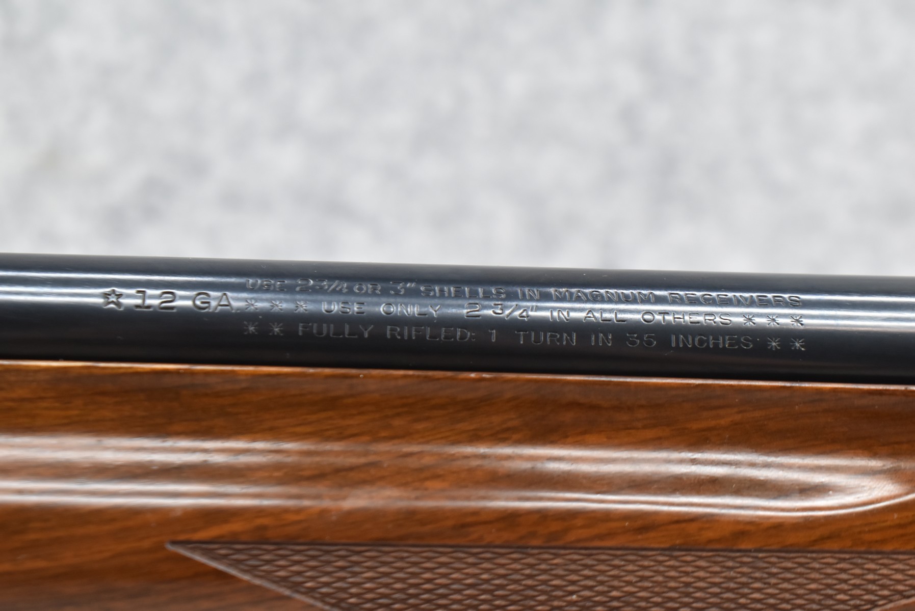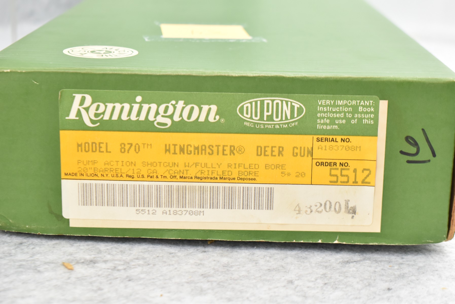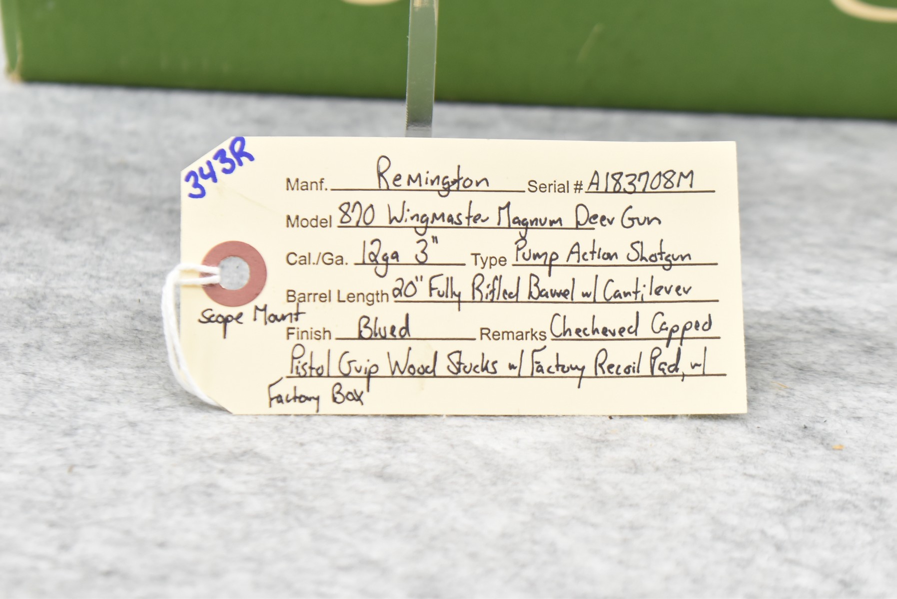343R. Remington – Mod. 870 Wingmaster Magnum Deer Gun – 12ga. 3” Pump Action Shotgun – w/20” Fully Rifled Barrel (w/Cantilever Scope Mount) – Blued Finish – w/Checkered Cappd Pistol Grip Wood Stocks w/Factory Recoil Pad –w/Factory Box