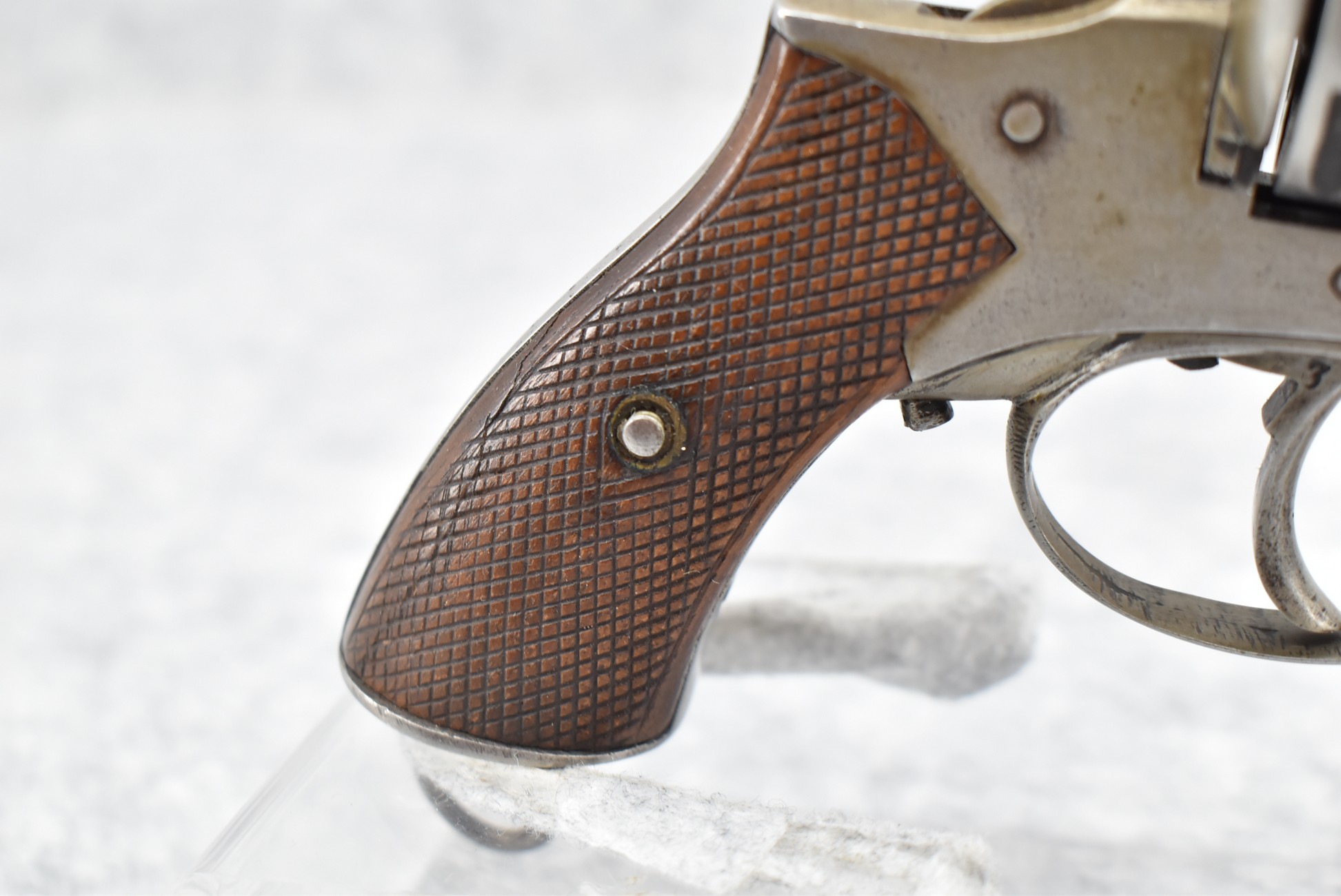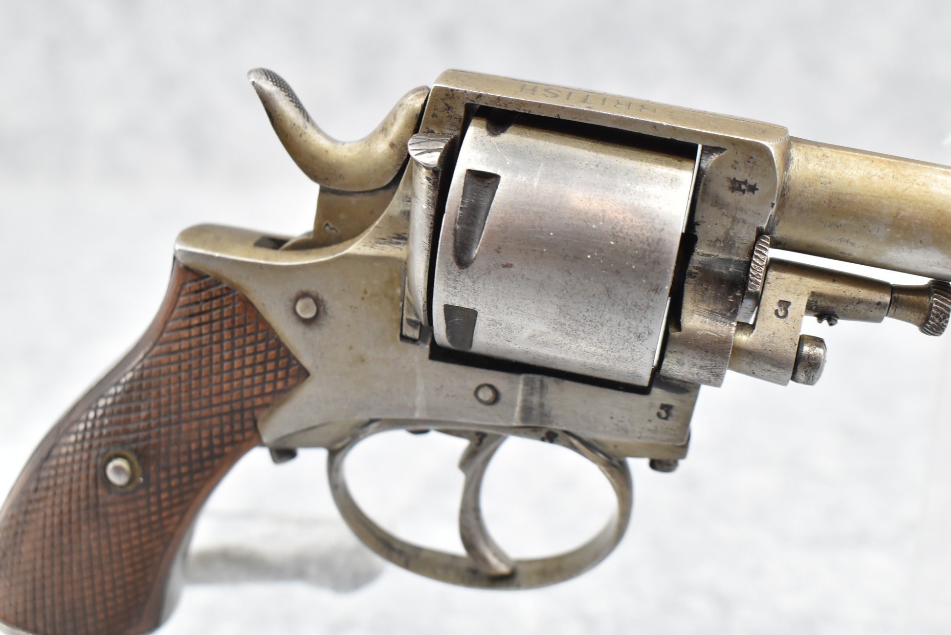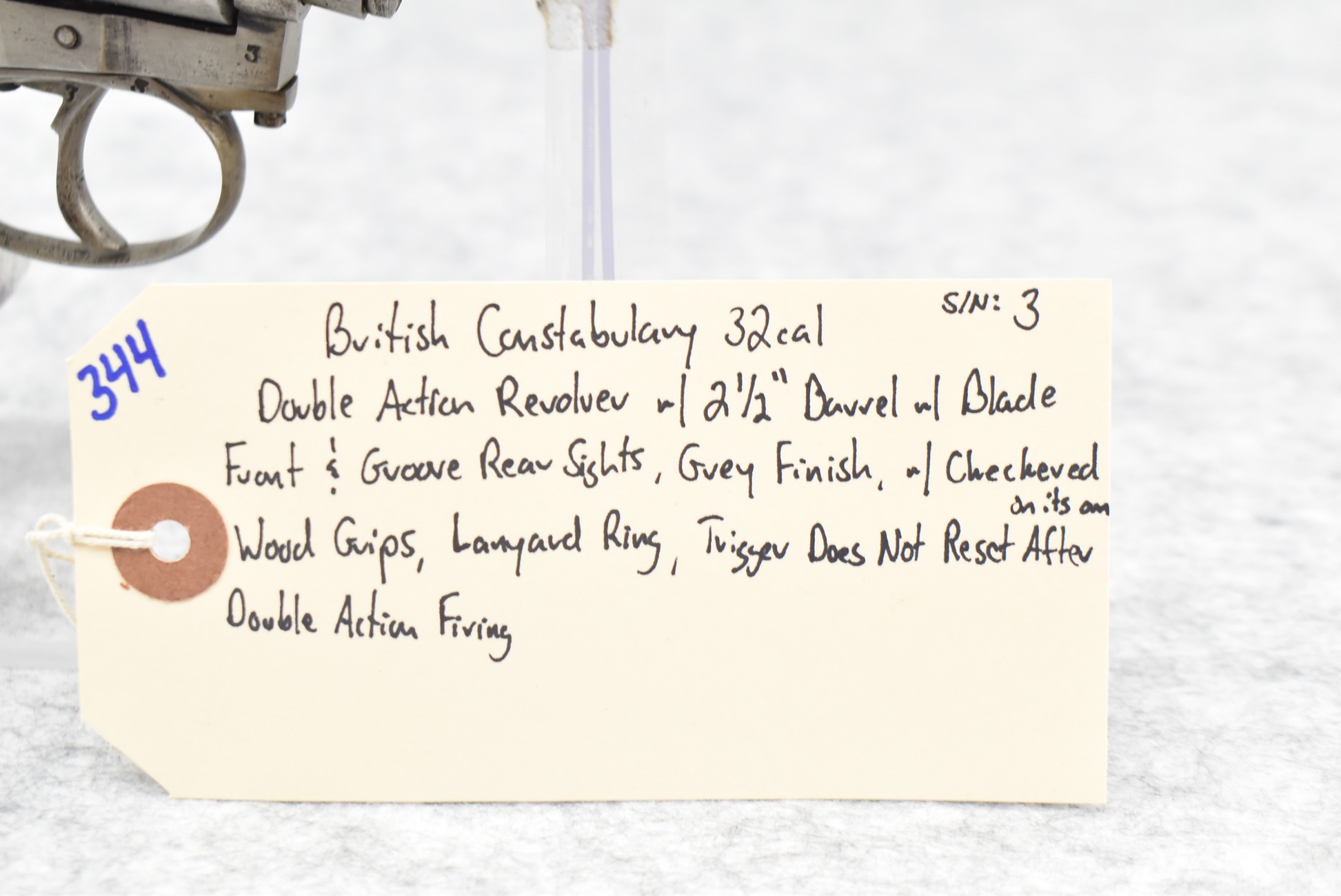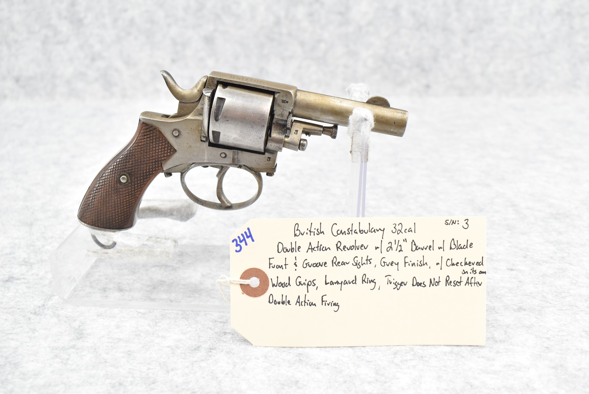 344. British Constabulary – 32 Cal. Double Action Revolver – w/2 ½” Barrel w/Blade Front & Groove Rear Sights – Gray Finish – w/Checkered Wood Grips – w/Lanyard Ring – Note: Trigger Does Not Reset On its Own After Double Action Firing