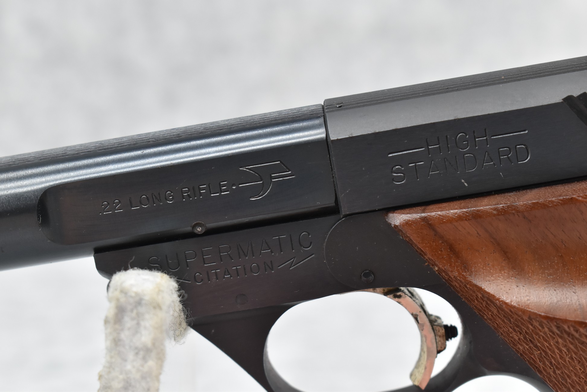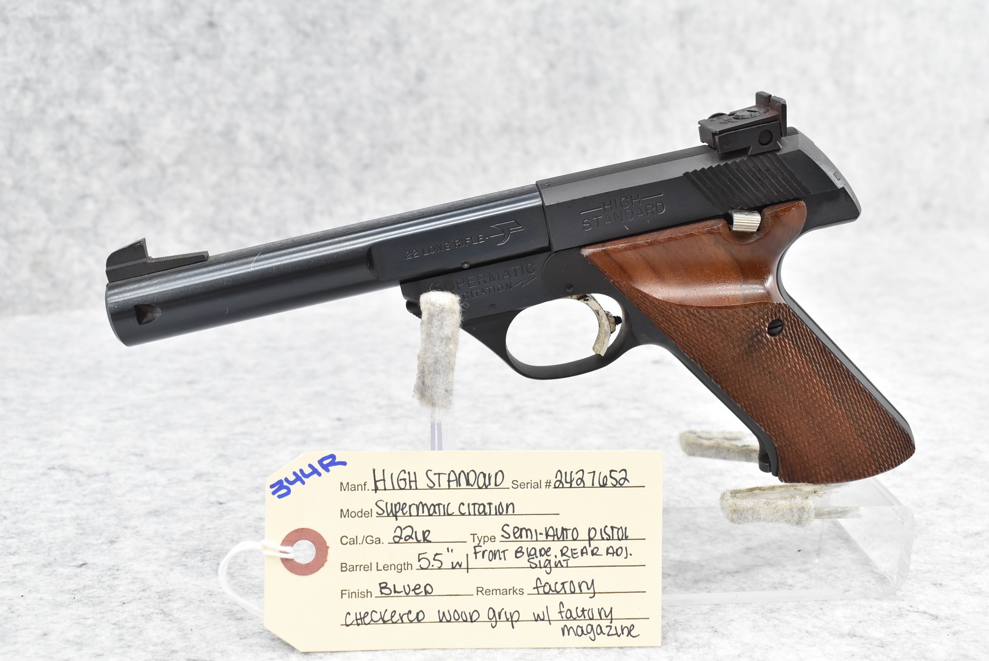 344R. High Standard – Mod. Supermatic Citation – 22LR Cal. Semi-Auto Pistol – w/5.5” Barrel w/Front Blade & Rear Adj. Sights – Blued Finish – w/Factory Checkered Wood Grip – w/Factory Magazine