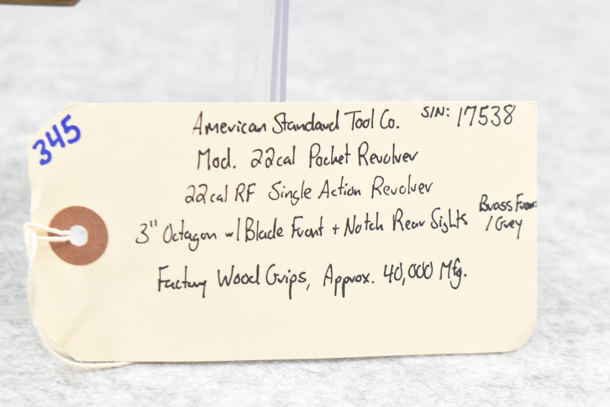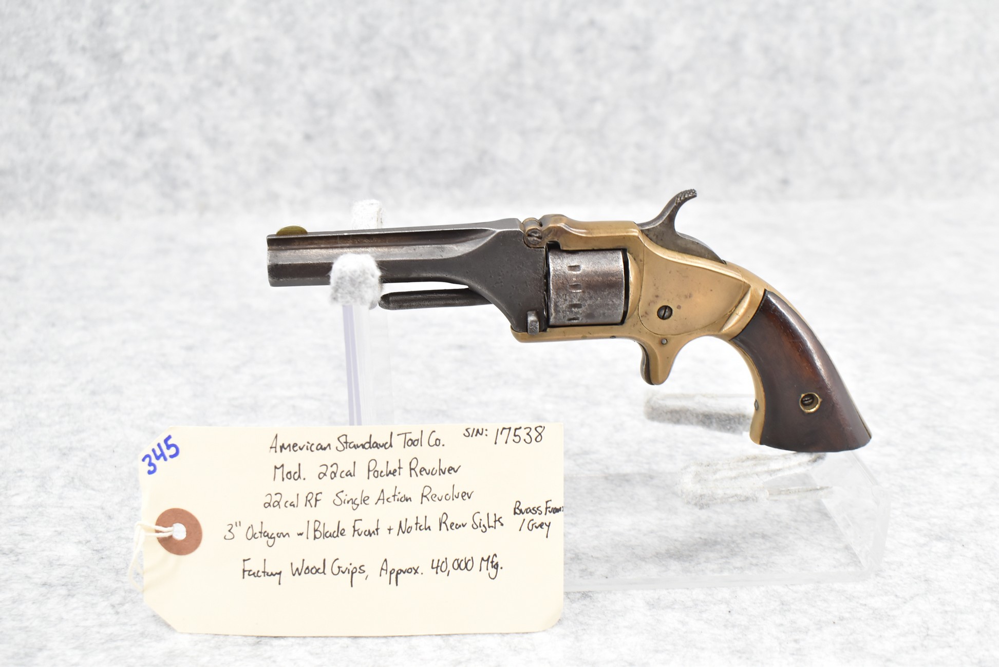 345. American Standard Tool Co. – Mod. 22 Cal. Pocket Revolver – 22 Cal. RF Single Action Revolver – w/3” Octagon Barrel w/Blade Front & Notch Rear Sights – Gray Finish w/Brass Frame – w/Factory Wood Grips – Approx. 40,000 Mfg.