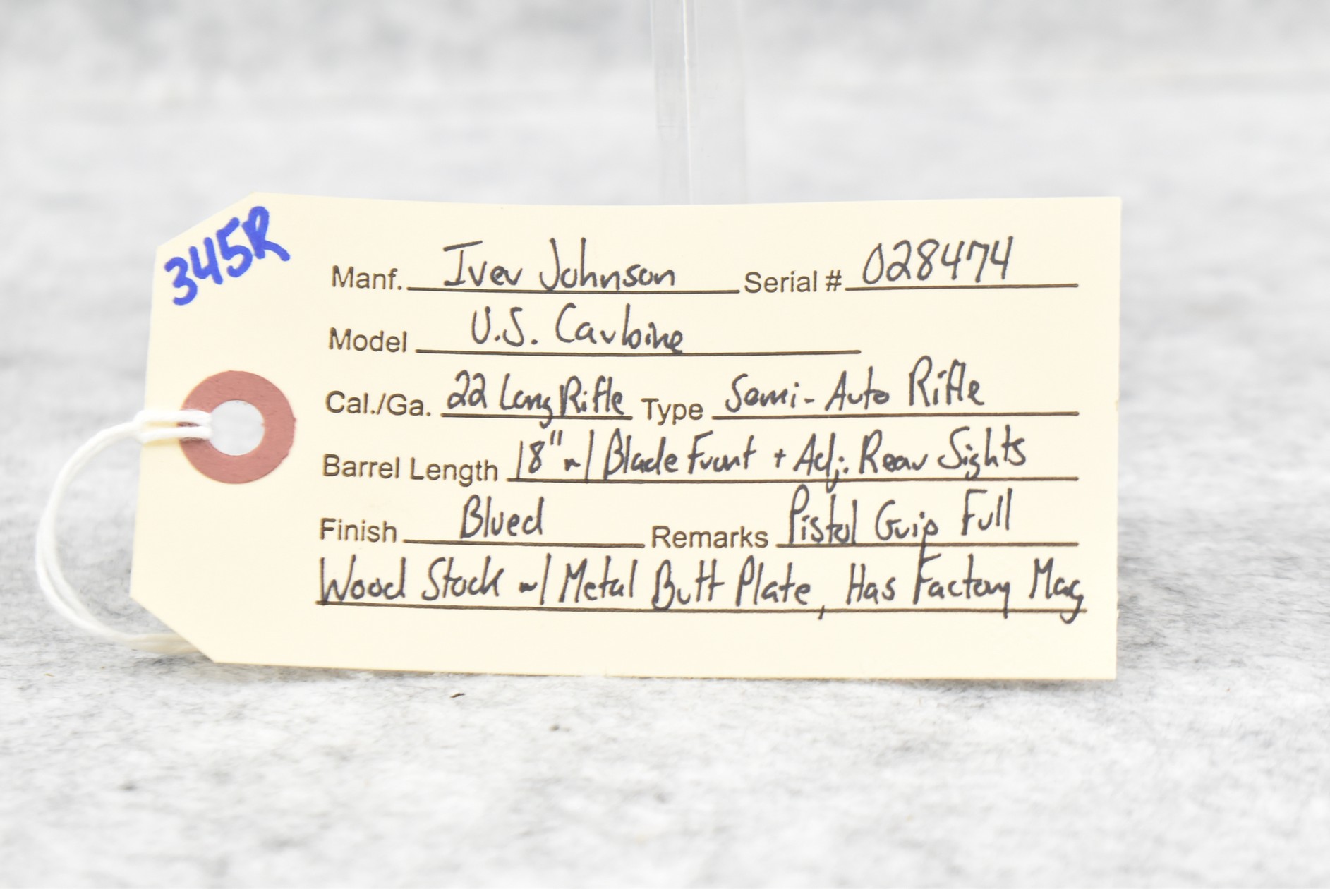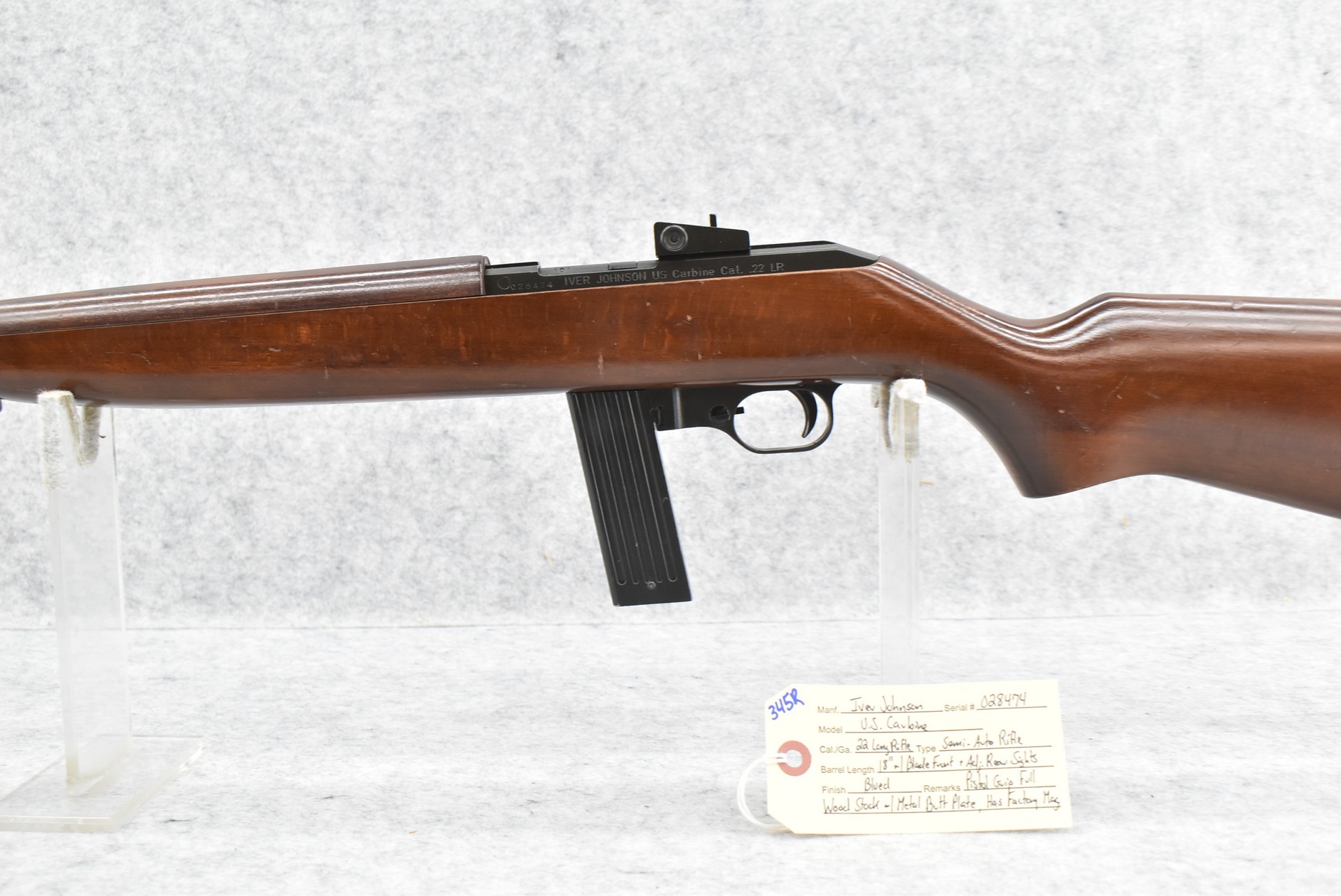 345R. Iver Johnson – Mod. U.S. Carbine – 22 Long Rifle Cal. Semi-Auto Rifle – w/18” Barrel w/Blade Front & Adj. Rear Sights – Blued Finish – w/Pistol Grip Full Wood Stock w/Metal Butt Plate – w/Factory Mag
