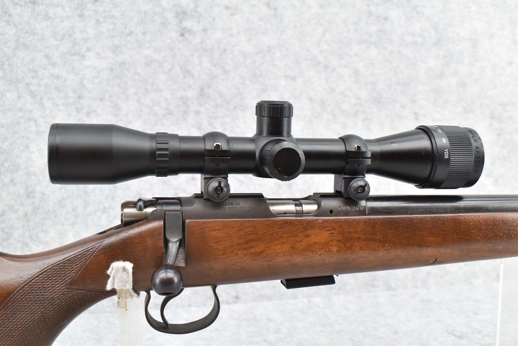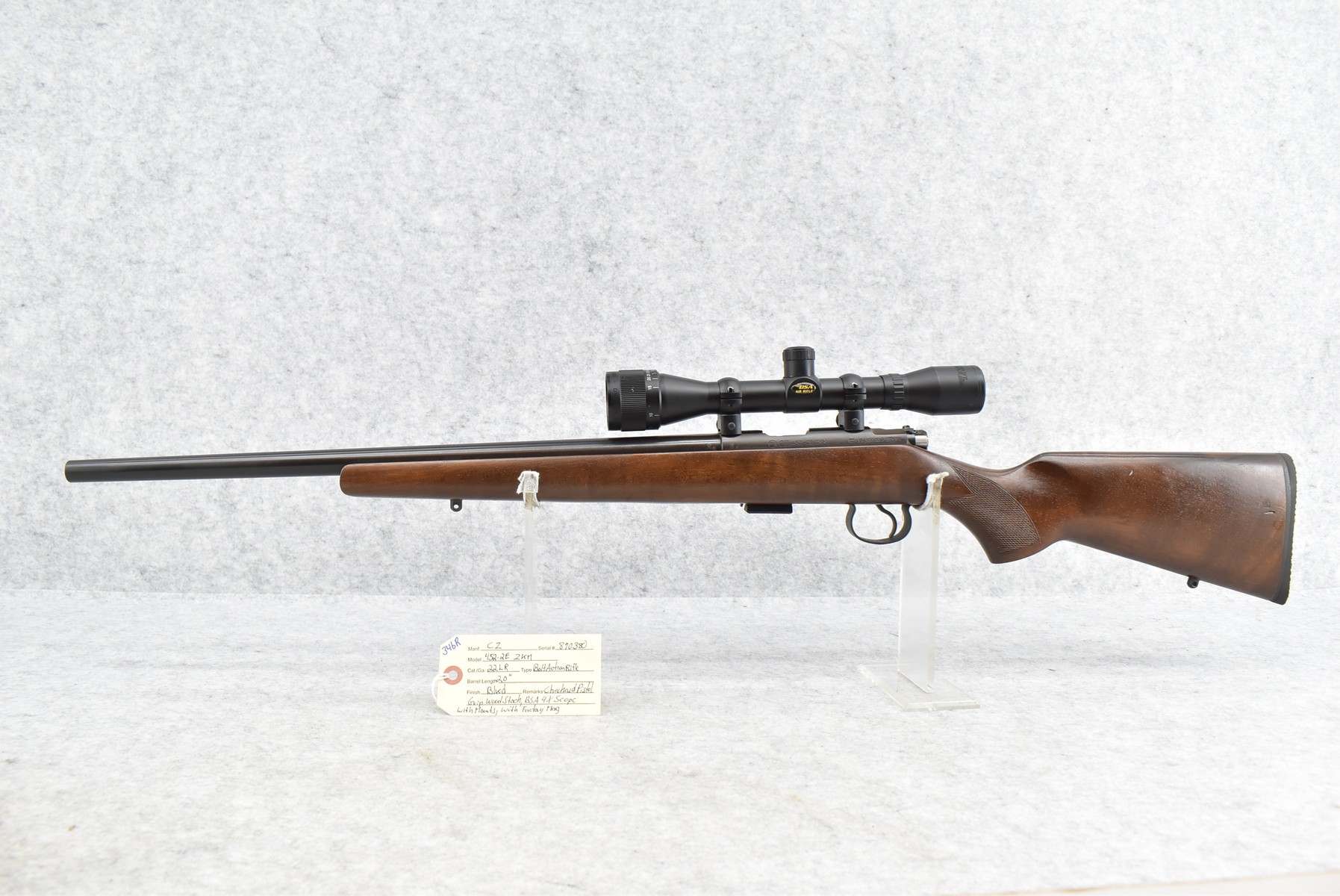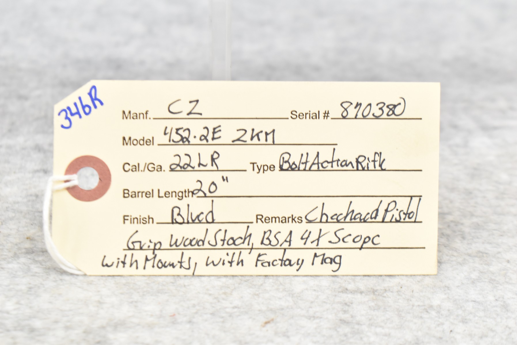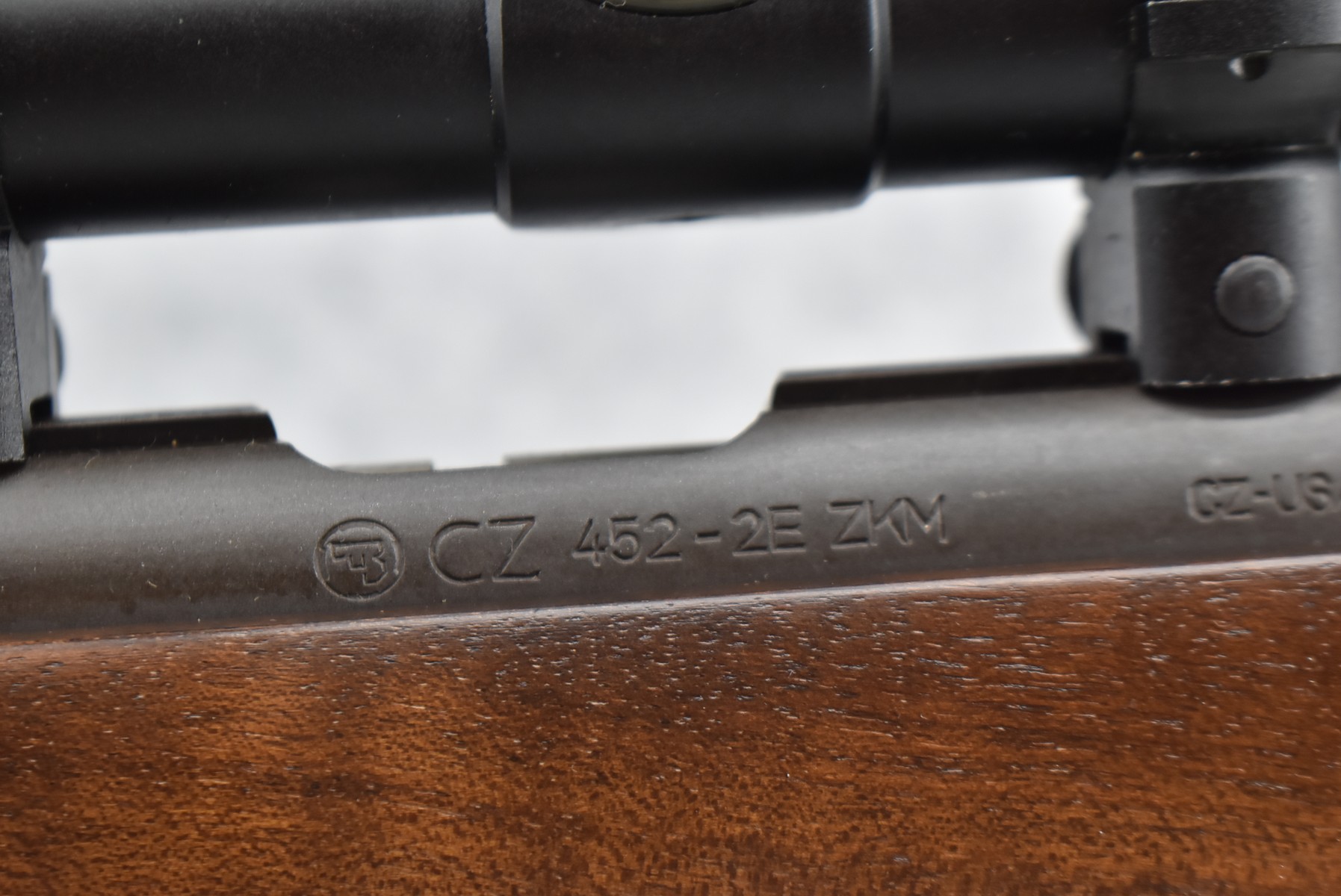 346R. CZ – Mod. 452-2E ZKM – 22LR Cal. Bolt Action Rifle – w/20” Barrel – Blued Finish – w/Checkered Pistol Grip Wood Stock – w/Factory Mag – w/BSA 4x Scope w/Mounts